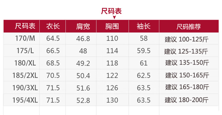 China (cm) 165 / 88-90 170 / 96-98 175 / 108-110 180 / 118-122 185 / 126-130