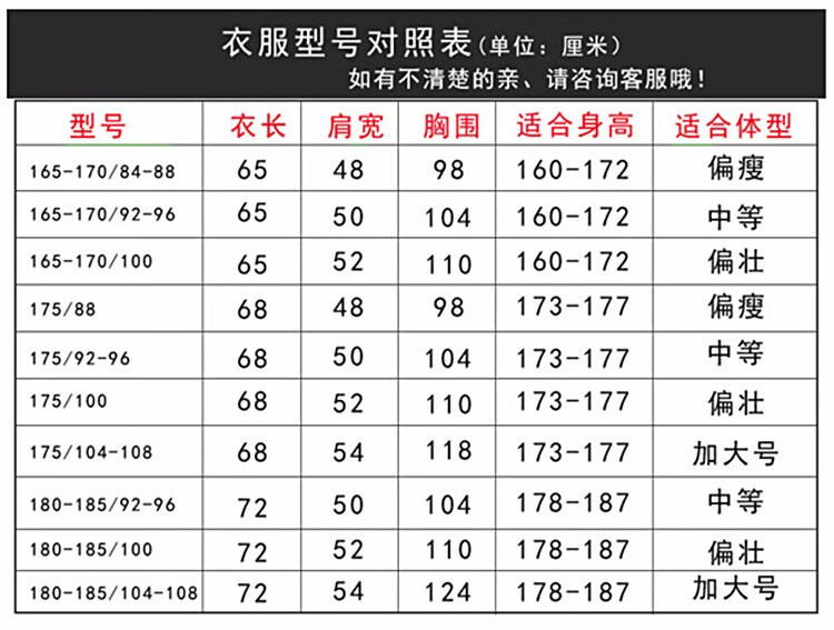 China (cm) 160-165/84-86 165-170 / 88-90 167-172 / 92-96 168-173 / 98-102 170-176 / 106-110