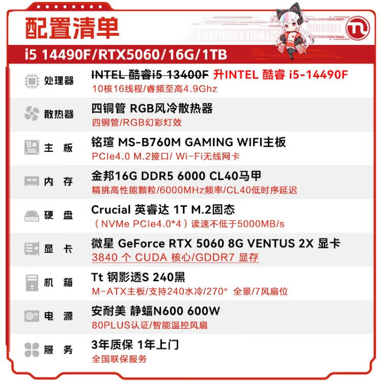 Ningmei Du Soul i5 13400F upgraded to 14490F/RTX5060/16G/1T gaming desktop assembly computer design e-sports host