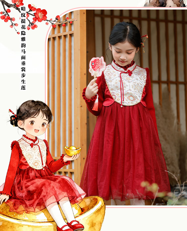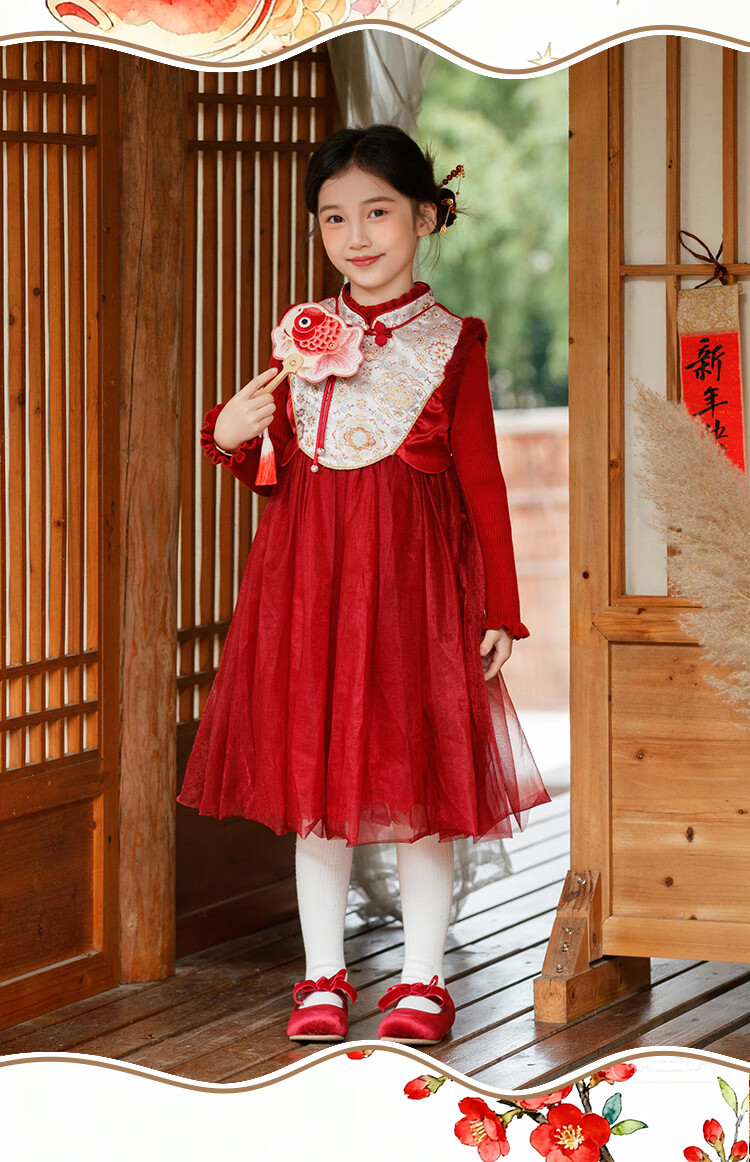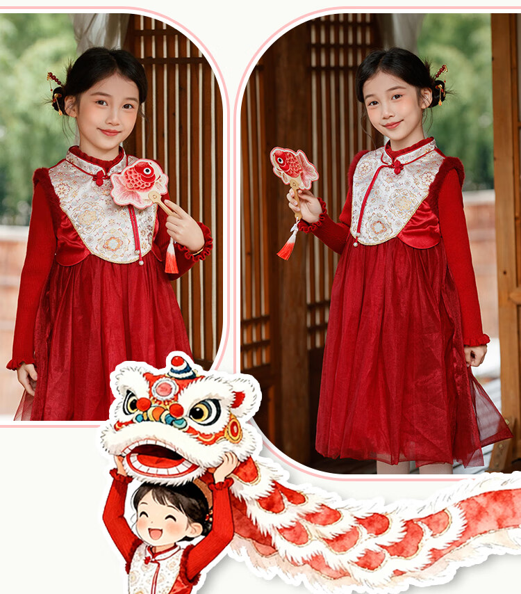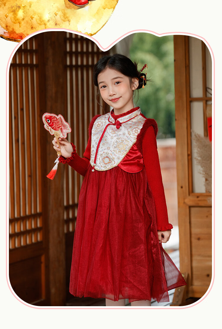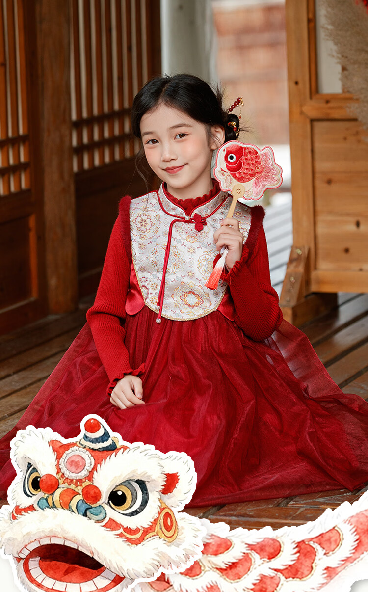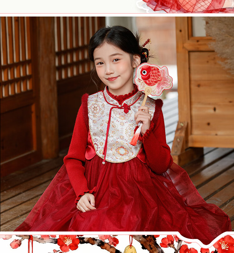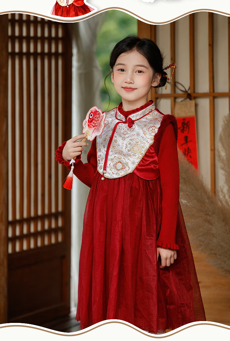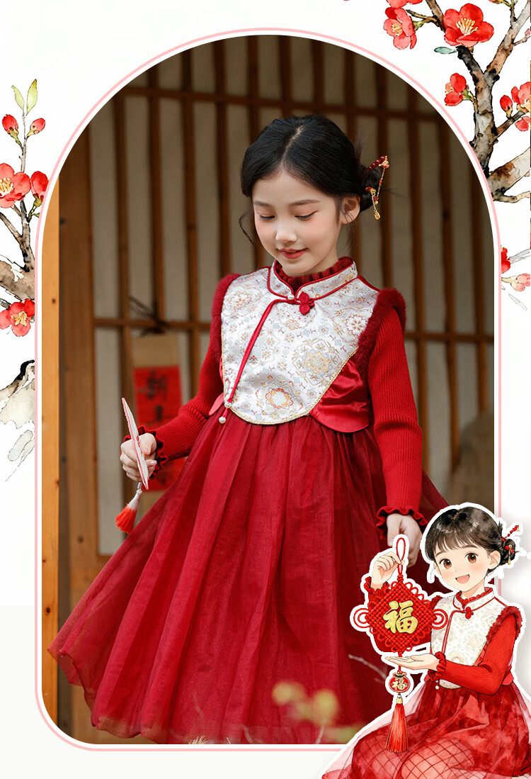 Huatian Cai New Chinese Hanfu Girls New Year's Clothes Autumn and Winter Children's New Year's Clothes Thickened Dresses Princess Dress New Year's Clothes