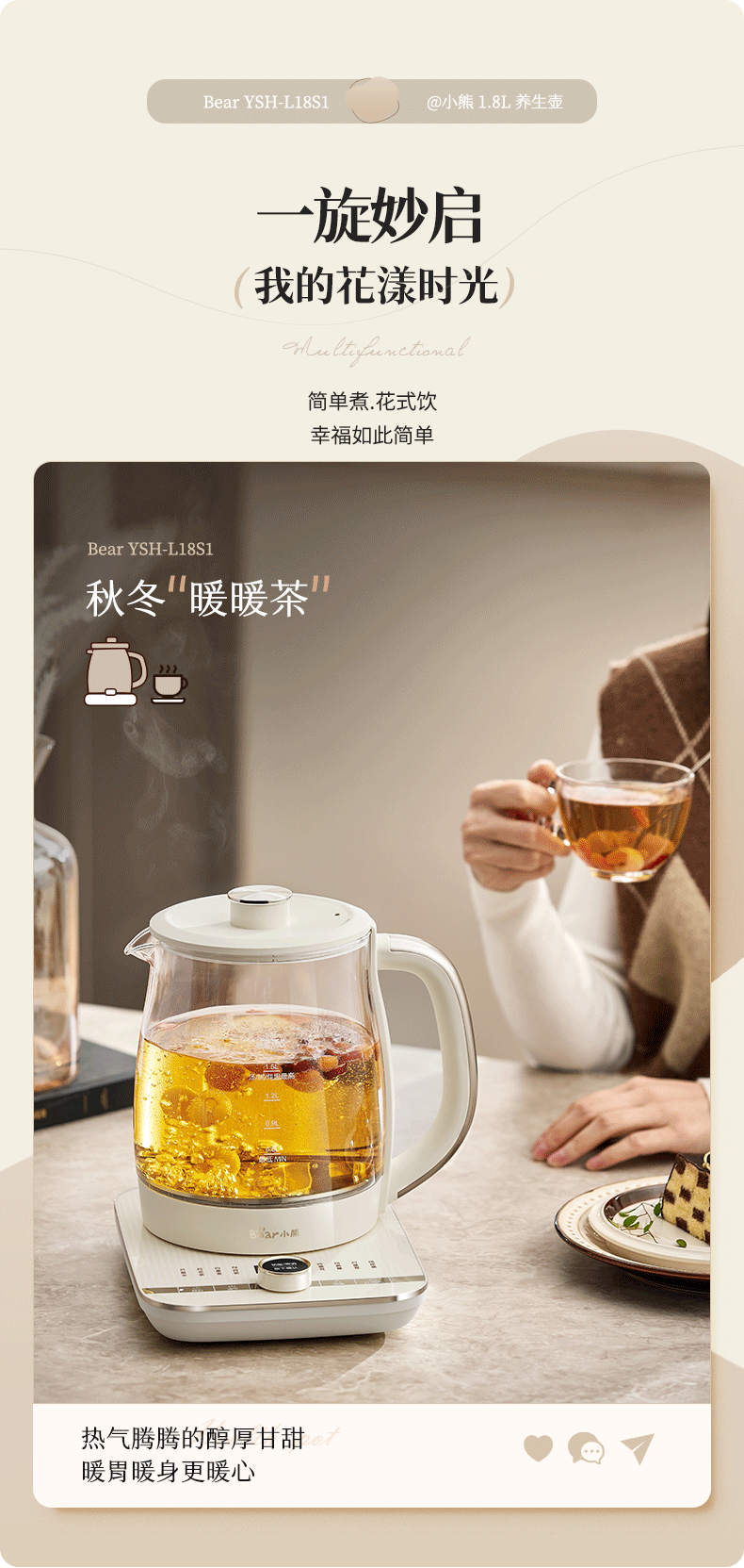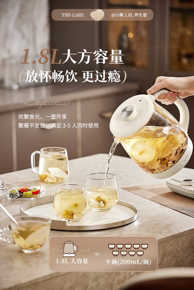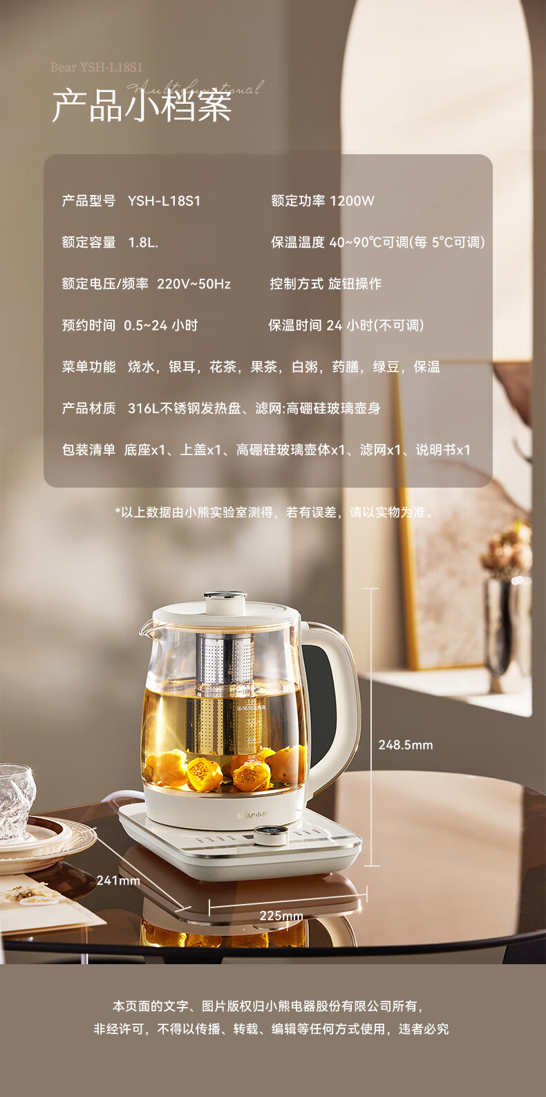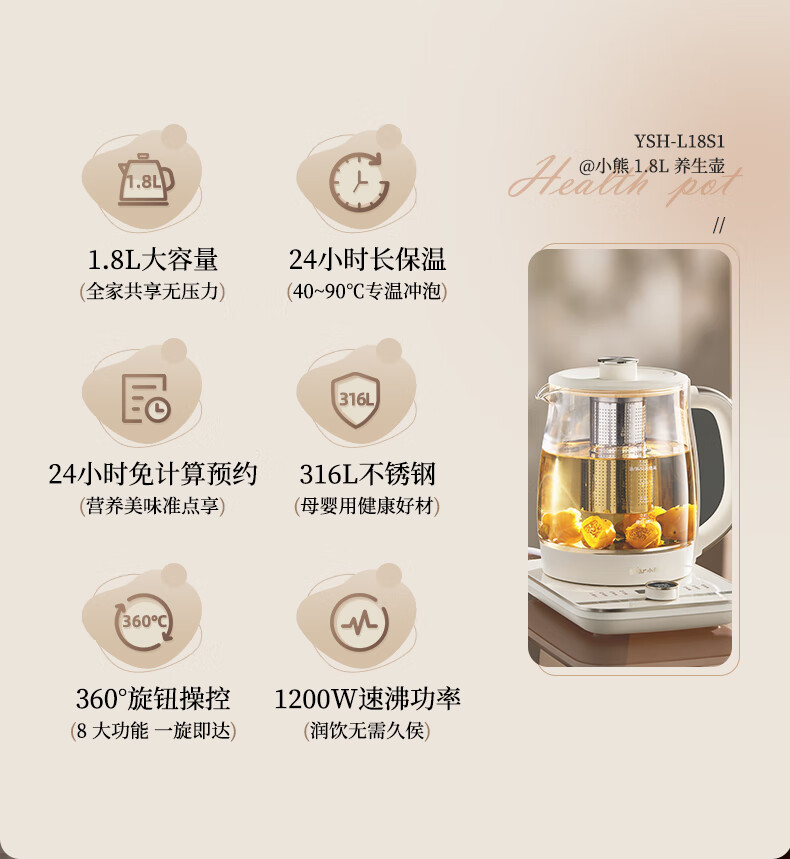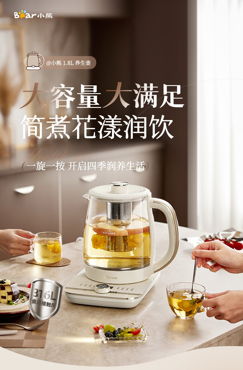 Bear Health Pot Tea Maker Stew All-in-One Tea Pot Kettle 1.8L Large Capacity Constant Temperature Kettle Flower Teapot Office Home 316L Hot Water Kettle YSH-L18S1