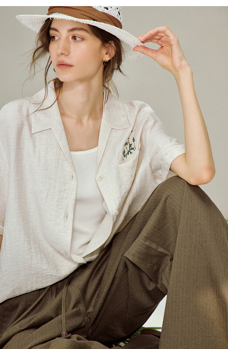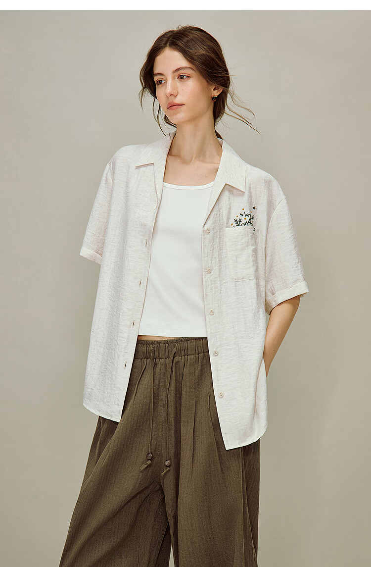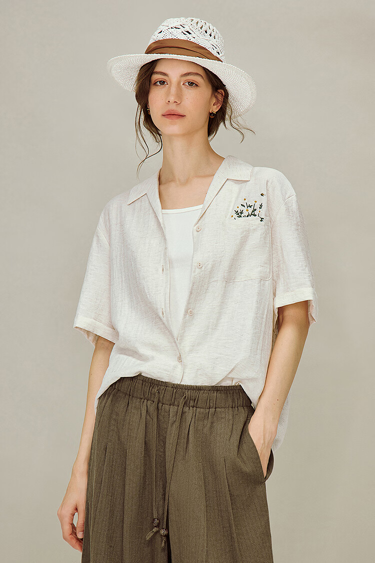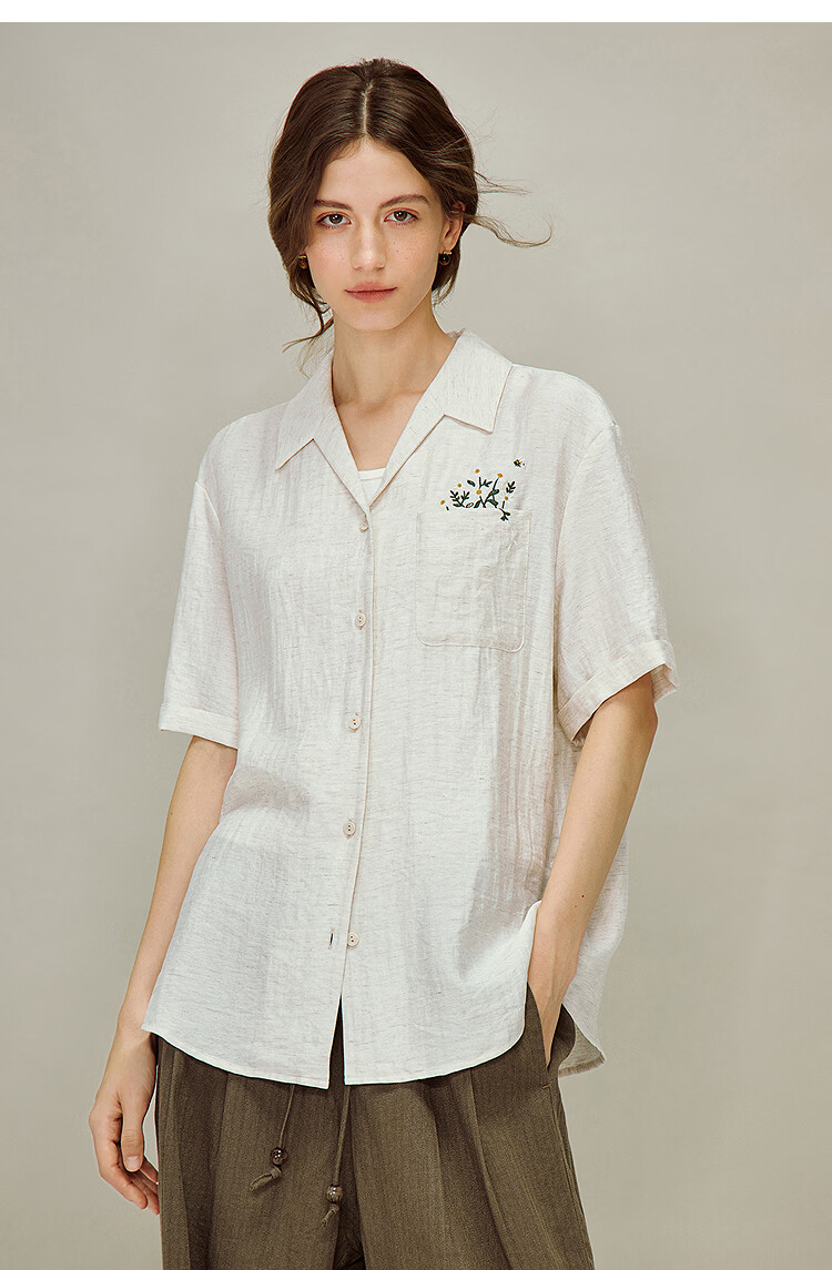INMAN Linen Embroidered Cuban Collar Shirt 2026 Spring Women's New Loose Short-Sleeved Top Apricot Gray M