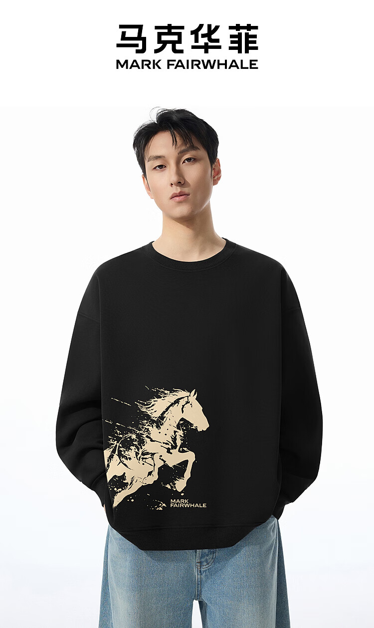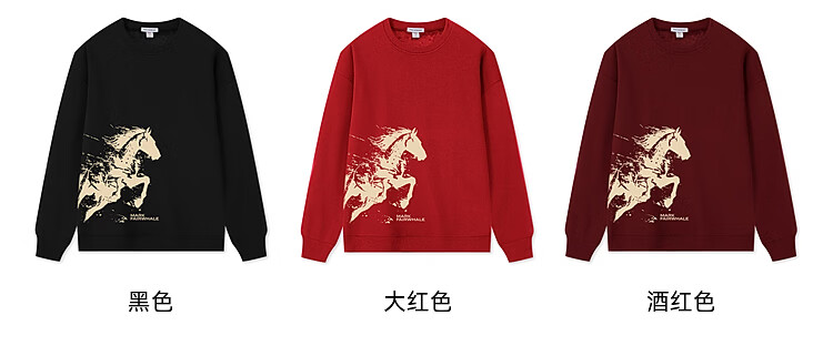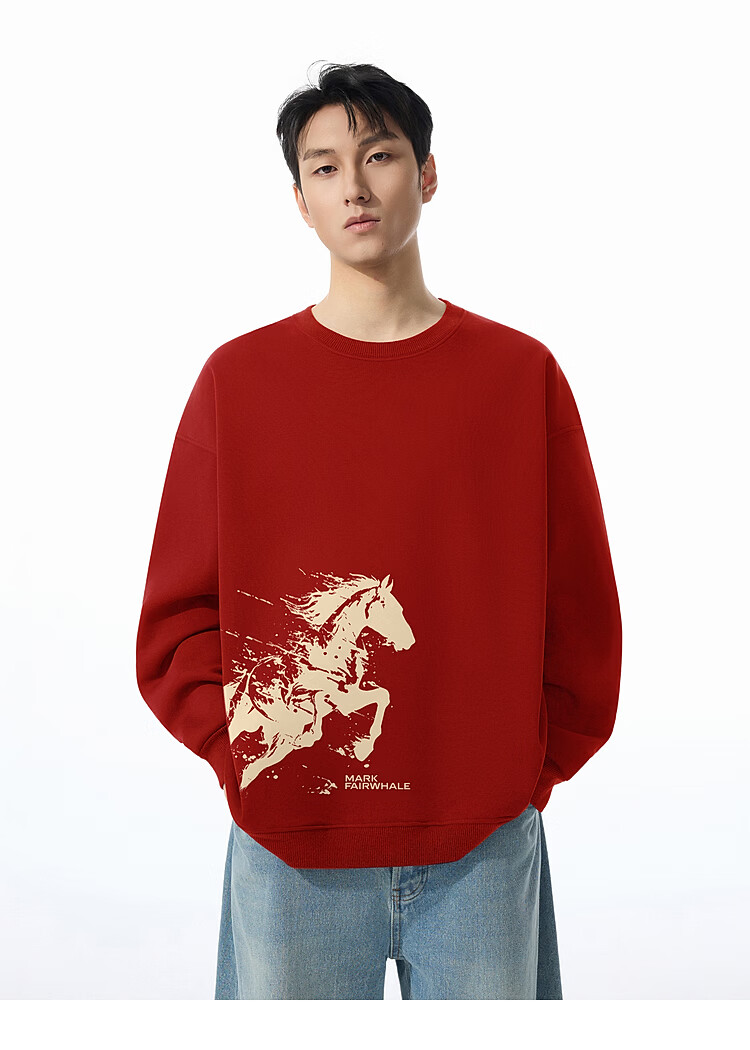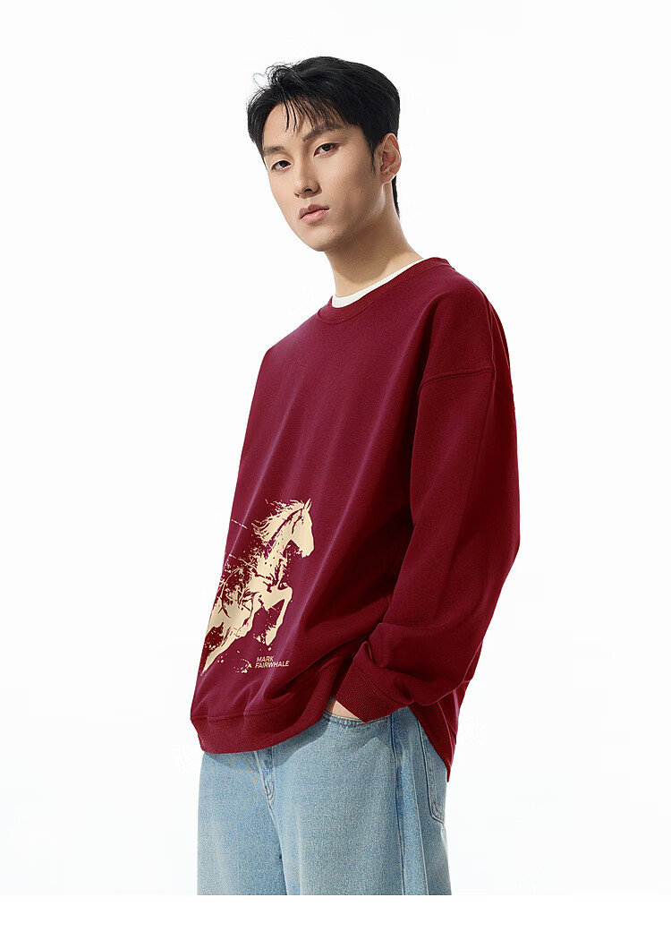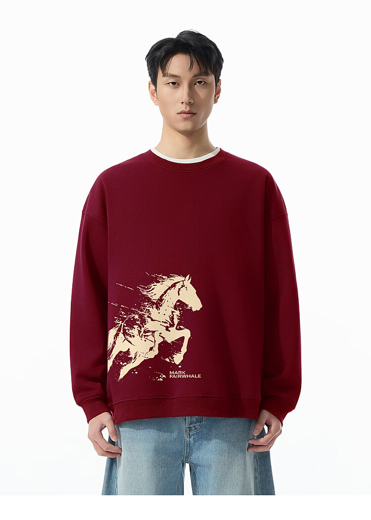 Mark Huafei Year of the Horse Series Sweater Men's Velvet Round Neck Horse Success Print Boys Sweater Burgundy 2XL