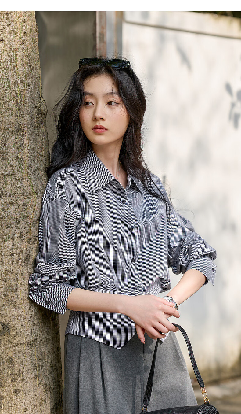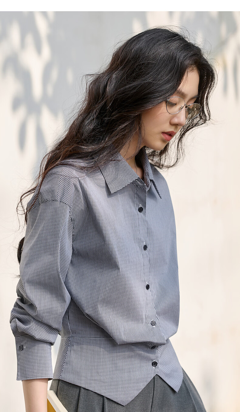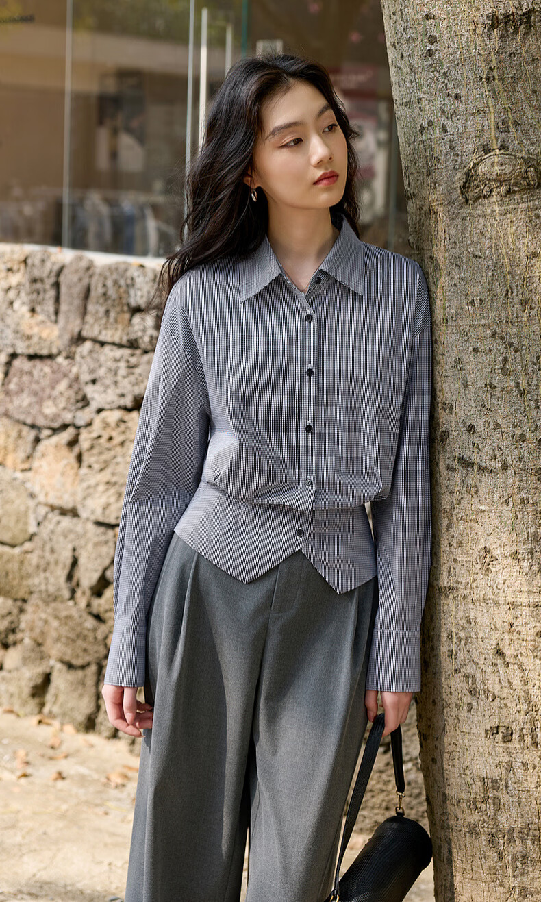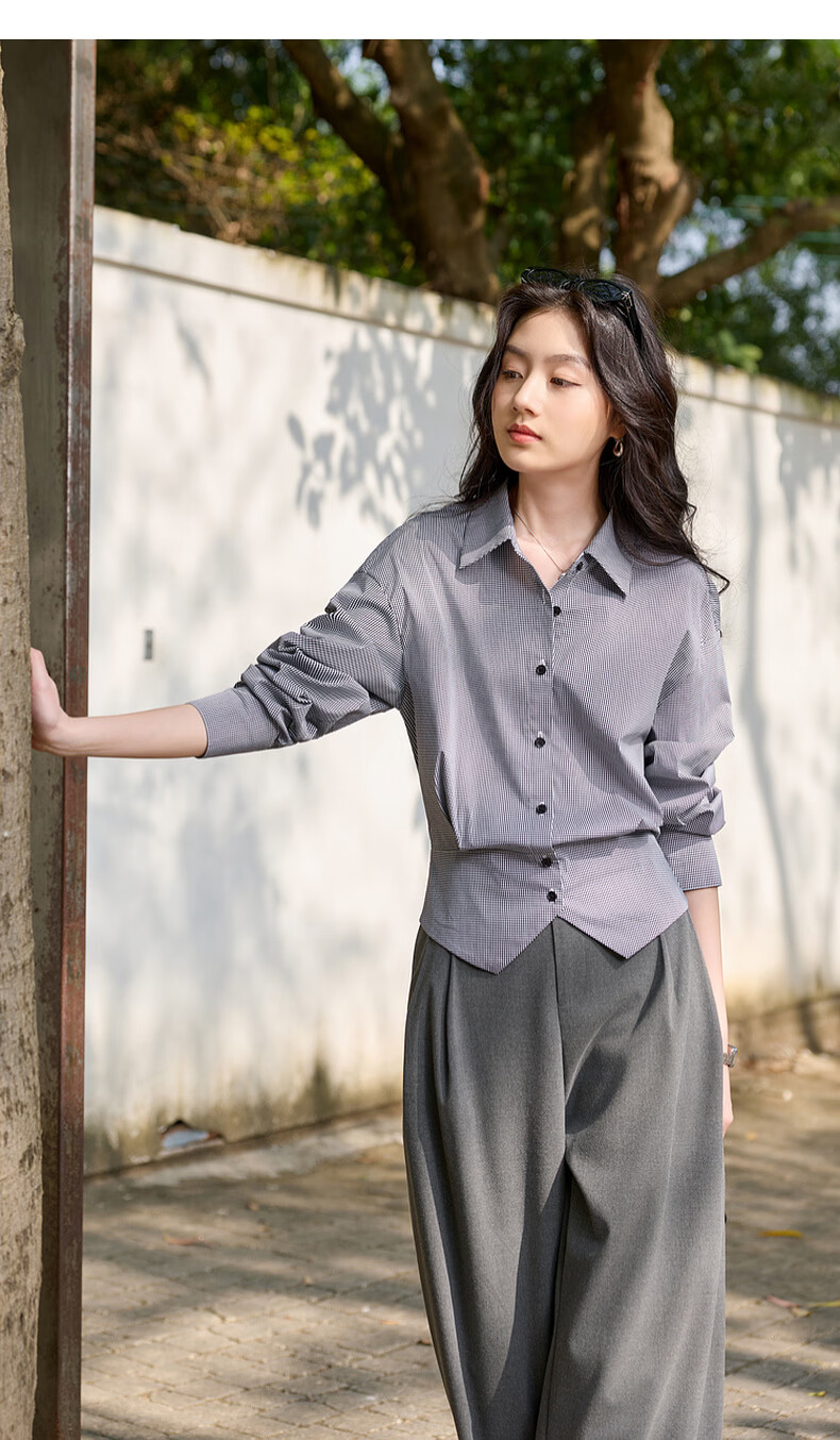Sancai 2026 spring new long-sleeved lapel plaid shirt retro shirt temperament top waist slimming S