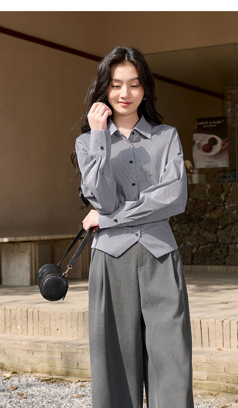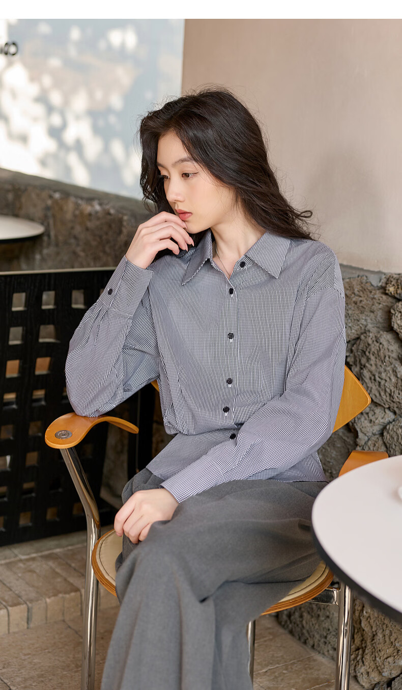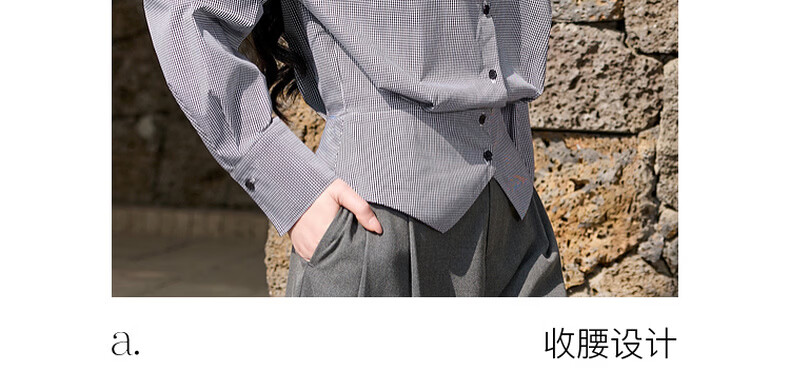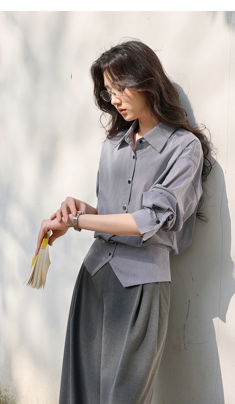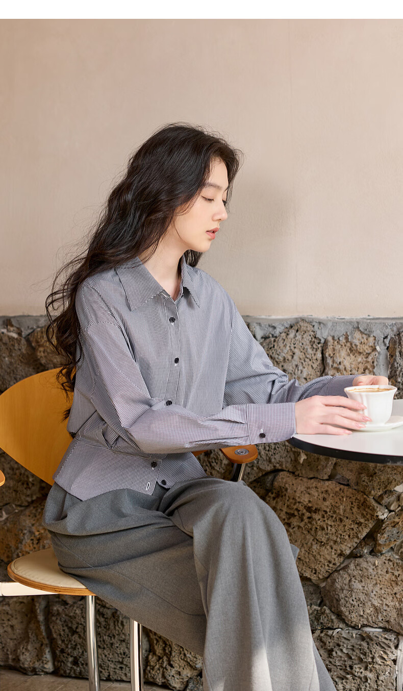 Sancai 2026 spring new long-sleeved lapel plaid shirt retro shirt temperament top waist slimming S