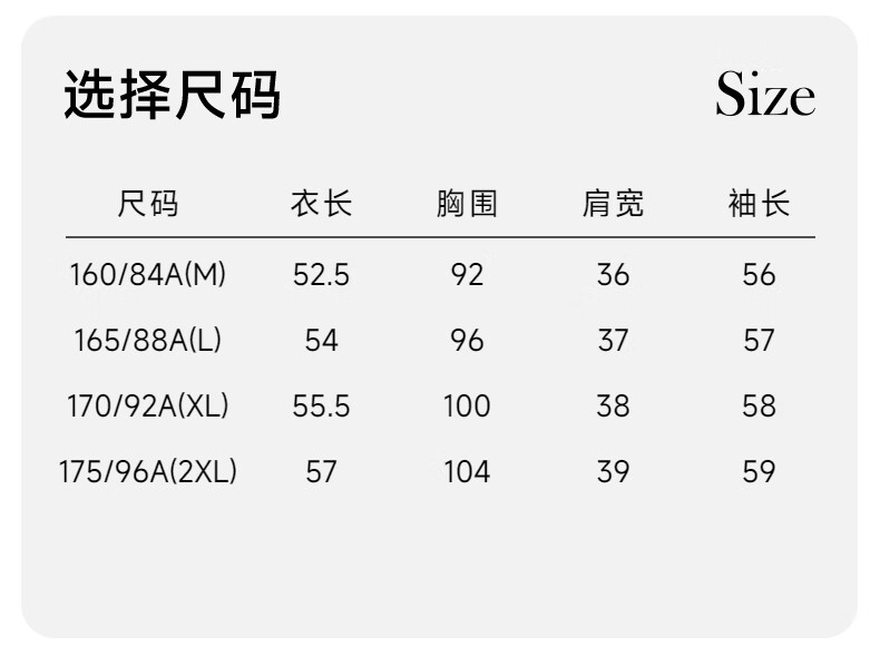 China (cm) 160-165/84-86 165-170 / 88-90 167-172 / 92-96 168-173 / 98-102 170-176 / 106-110