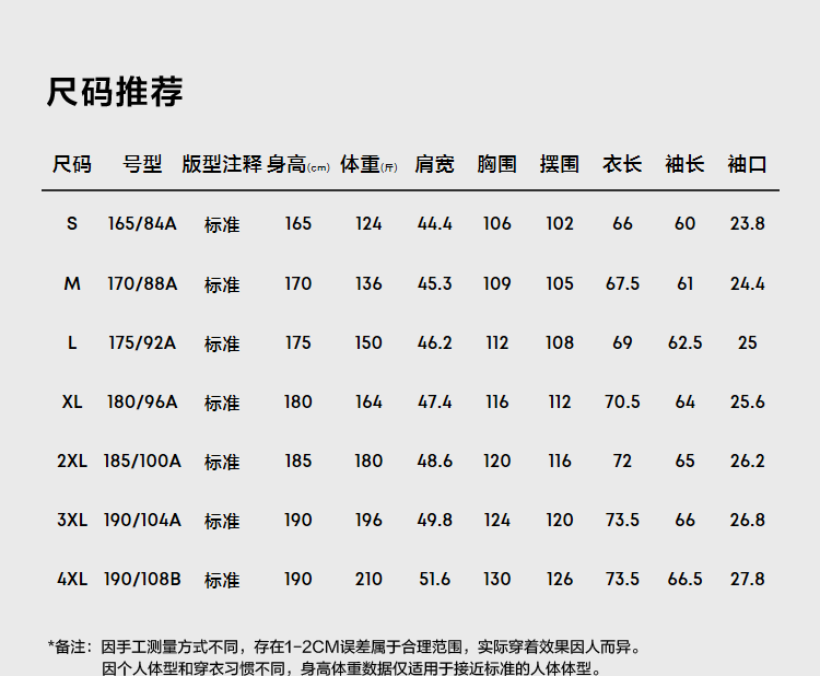 China (cm) 160-165/84-86 165-170 / 88-90 167-172 / 92-96 168-173 / 98-102 170-176 / 106-110
