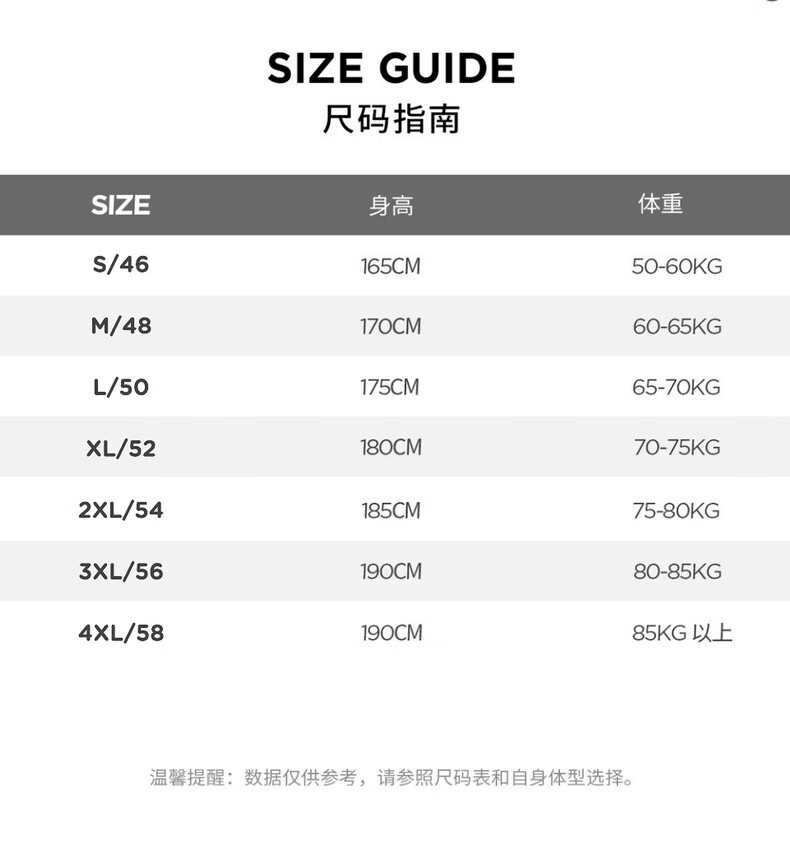 China (cm) 165 / 88-90 170 / 96-98 175 / 108-110 180 / 118-122 185 / 126-130