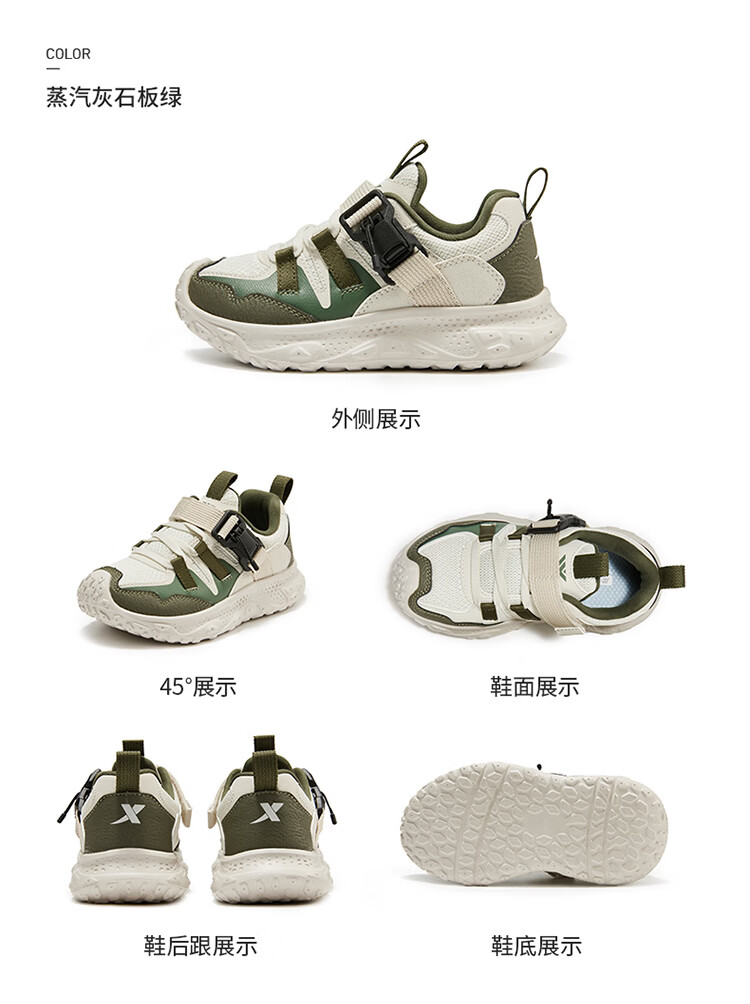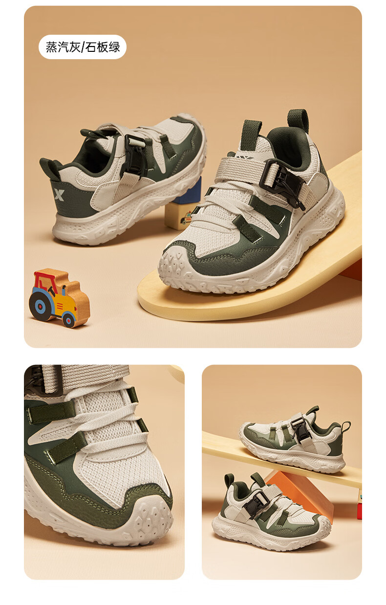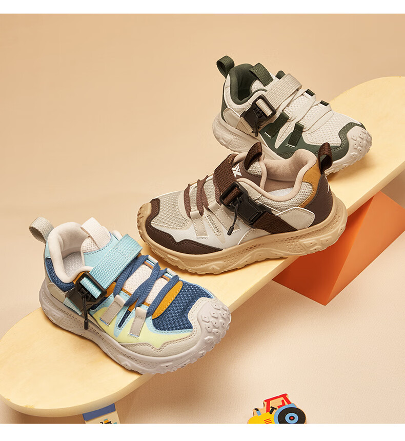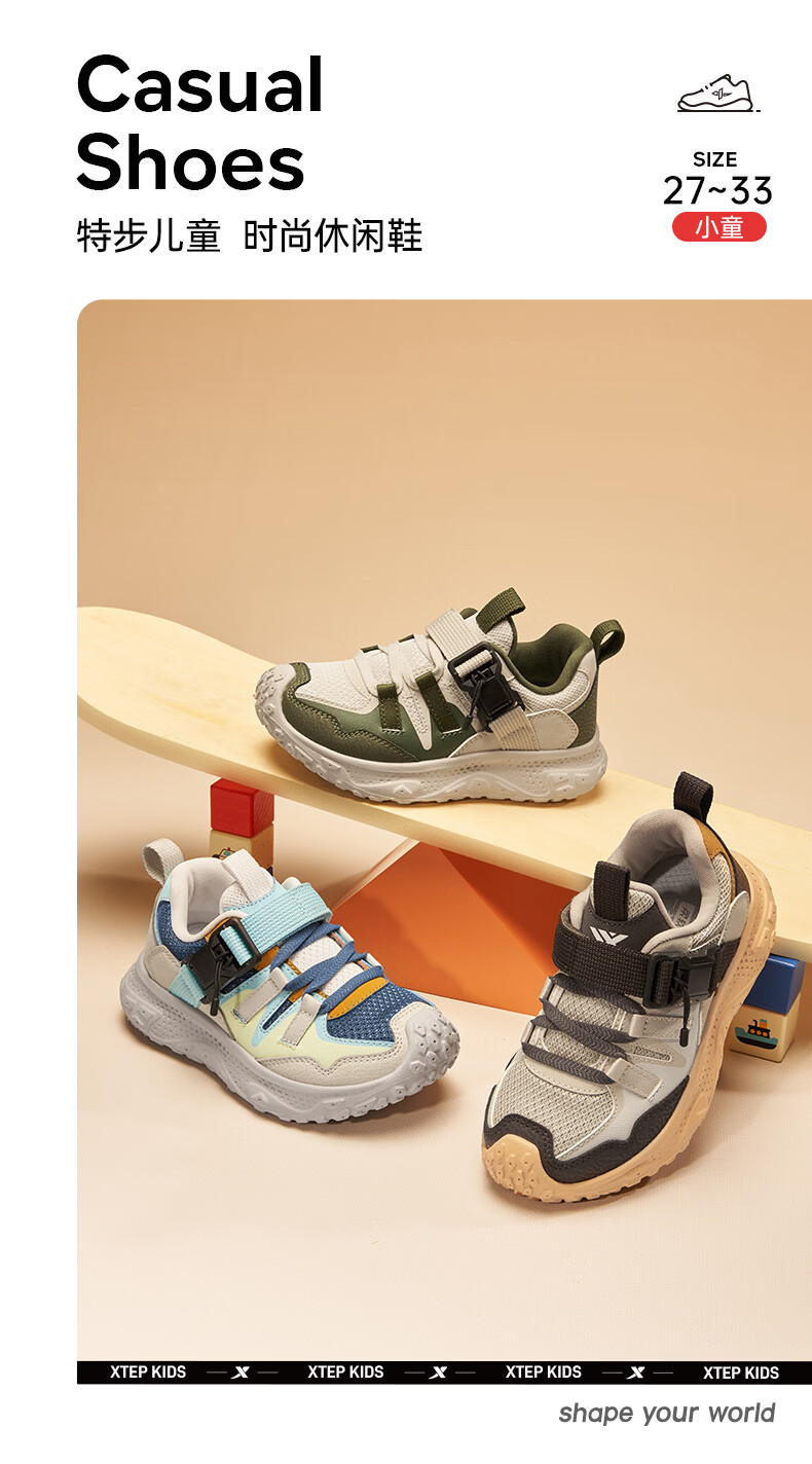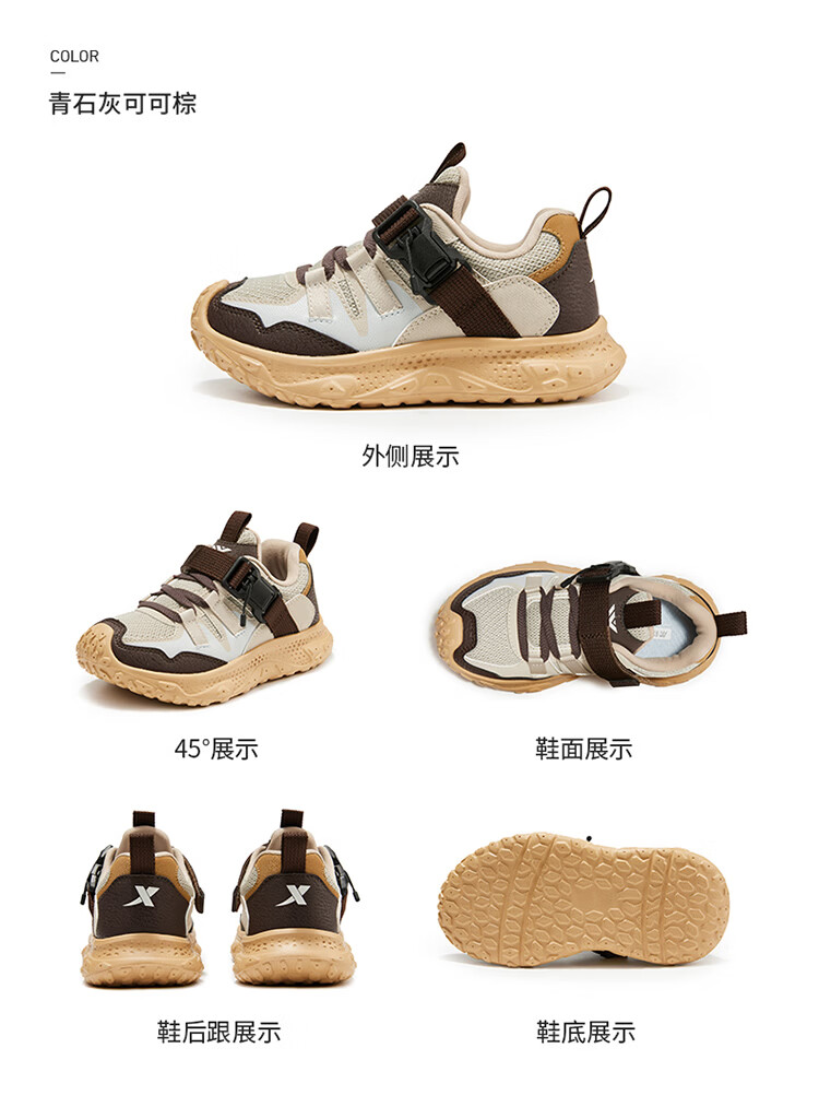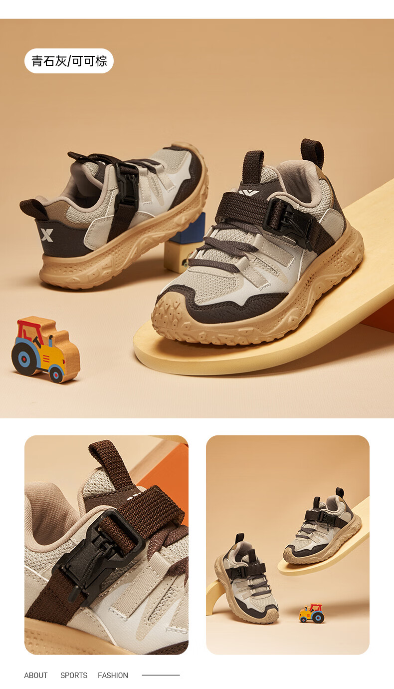 Xtep Children's Shoes Boys' Magnetic Buckle Design Casual Shoes Leather Mesh Sneakers Limestone/Cocoa Brown 27