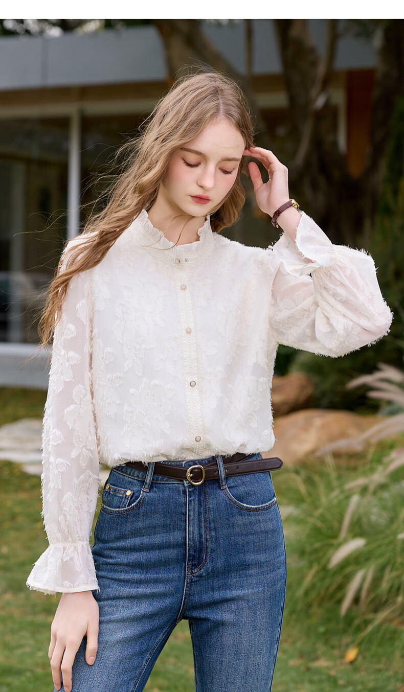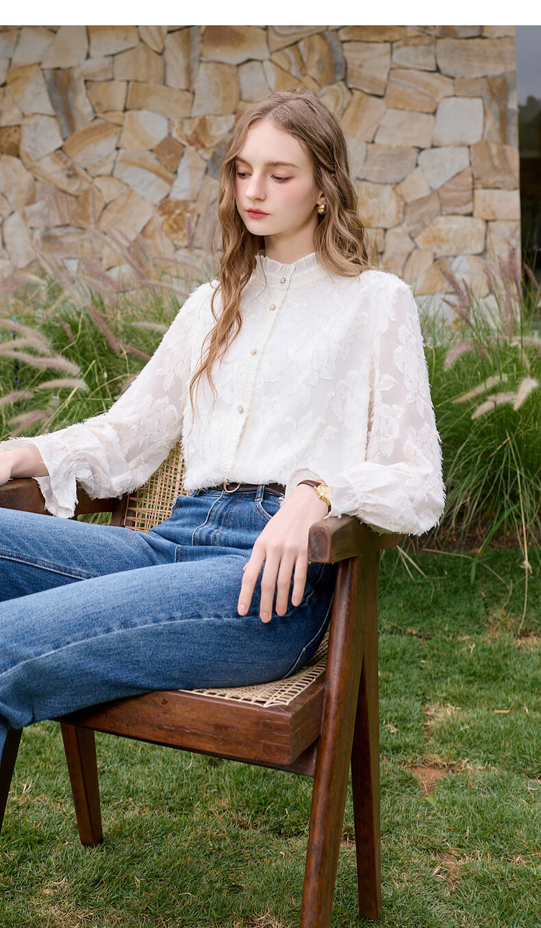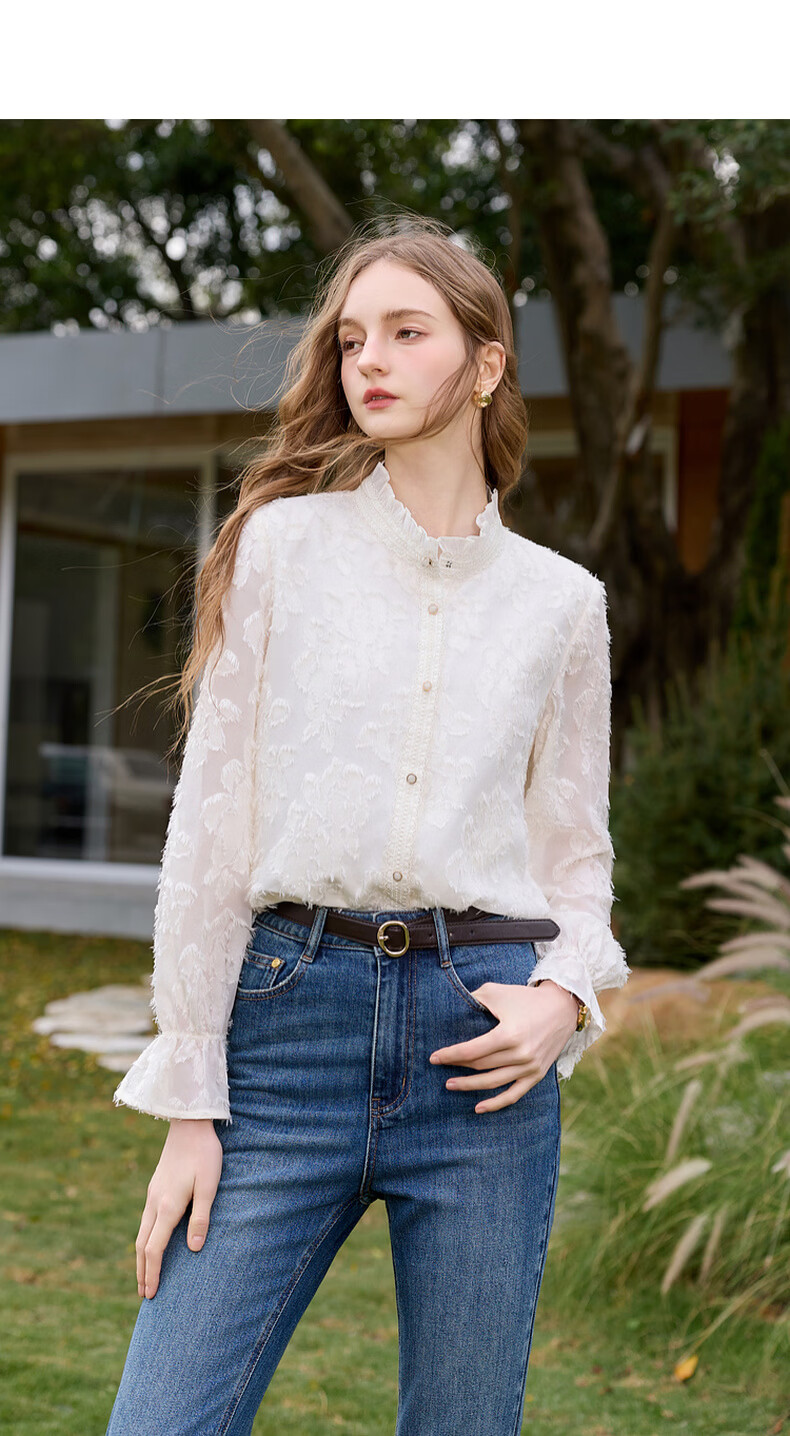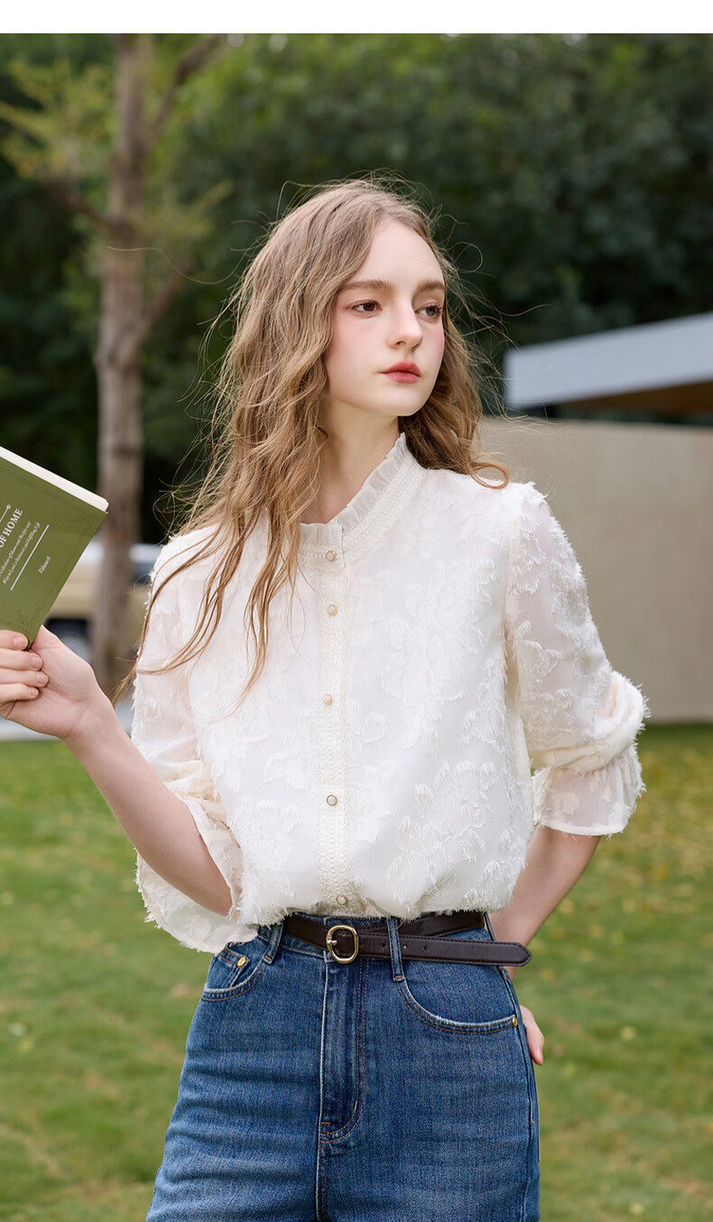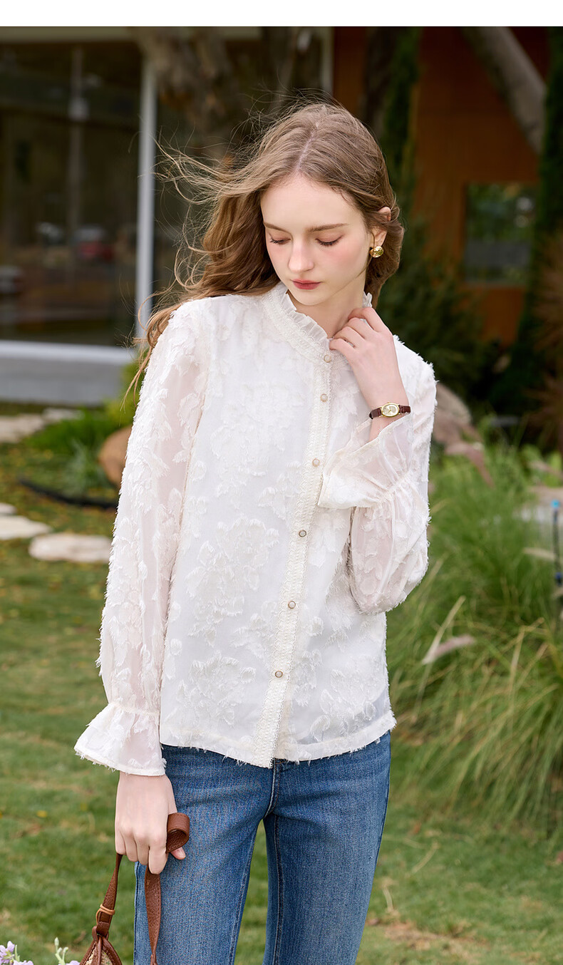 Sancai 2026 Spring New Cut Jacquard Loose Shirt Small Shirt Fungi Lace Stand Collar Shirt M