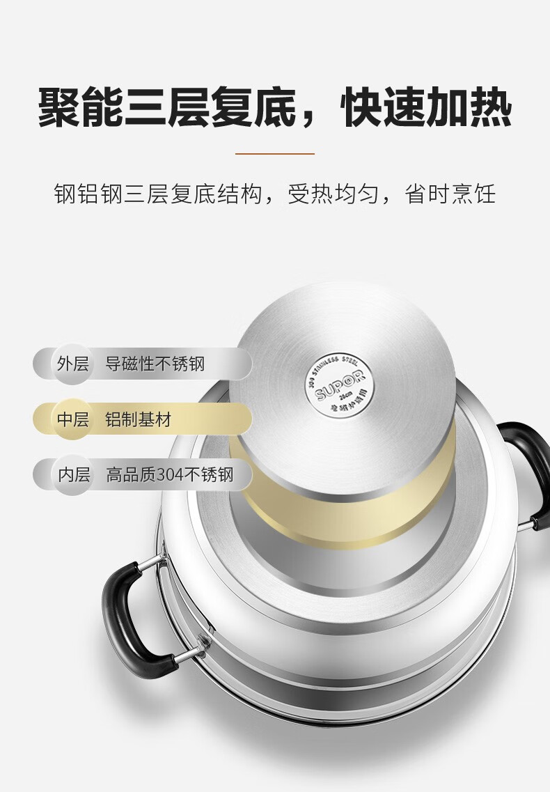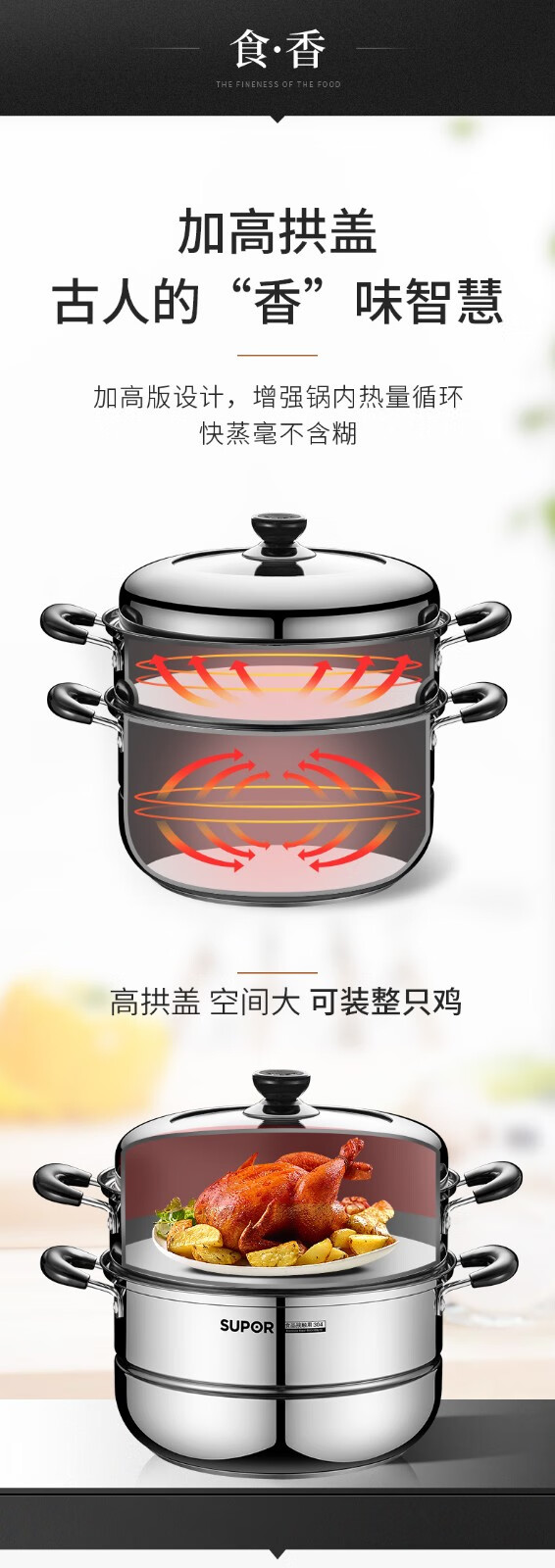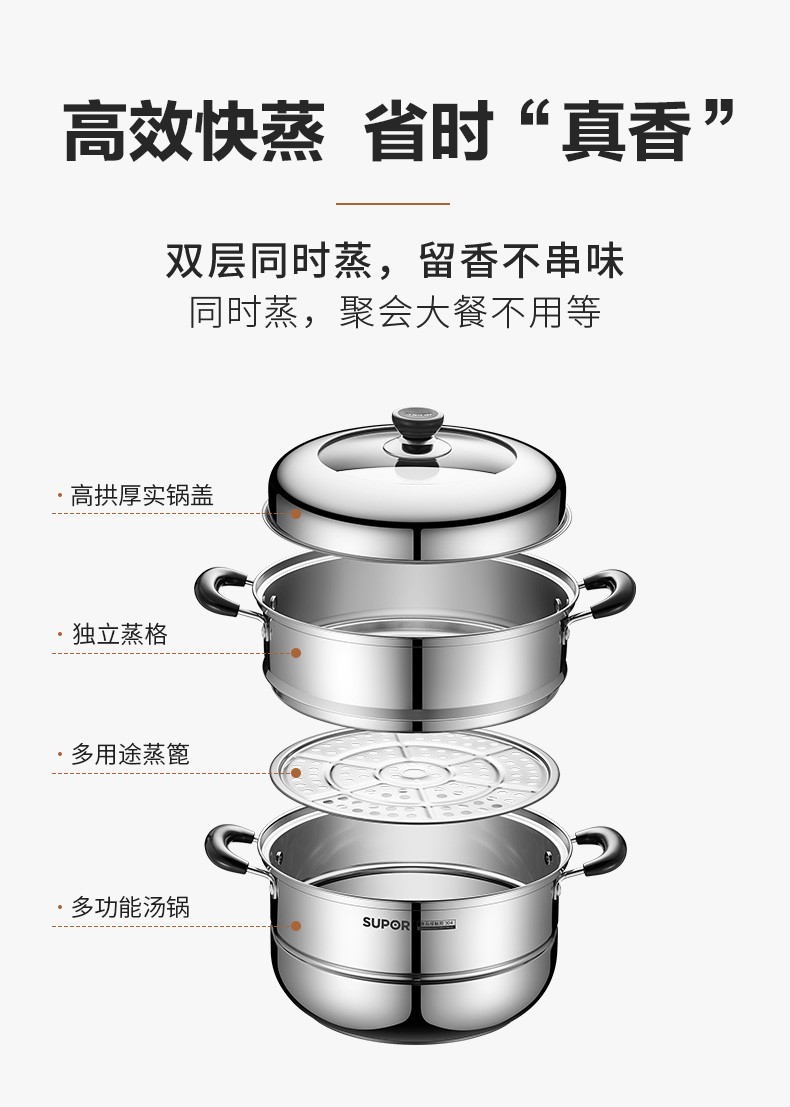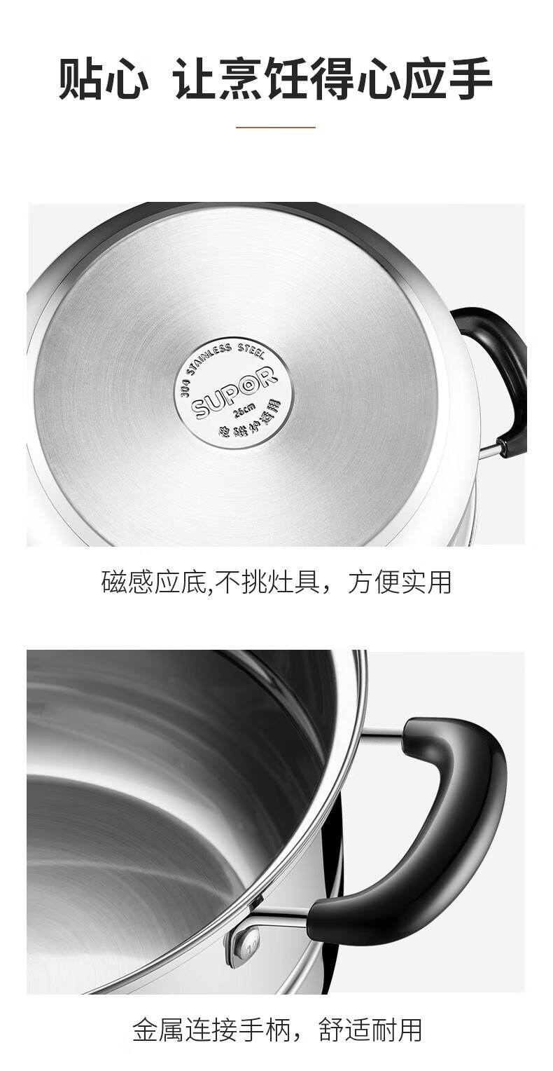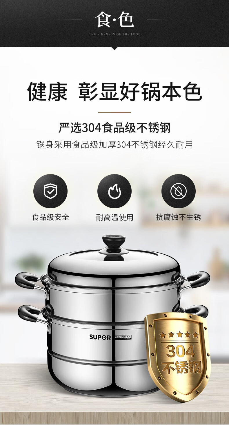 SUPOR steamer 304 stainless steel double-layer double-bottom soup pot steamer large capacity high arch lid pot induction cooker gas universal high arch lid double layer diameter 28cm