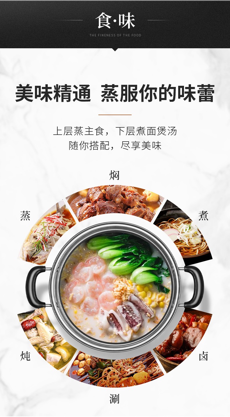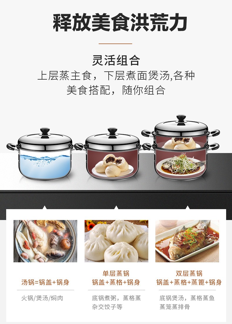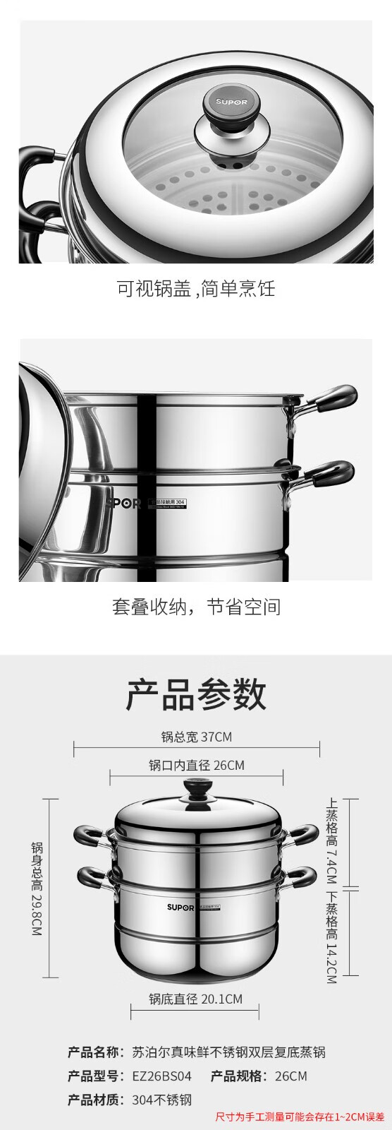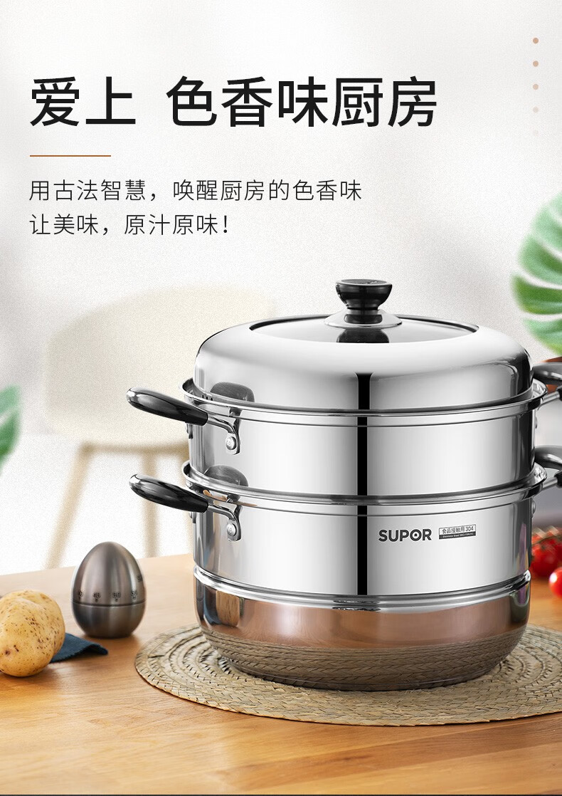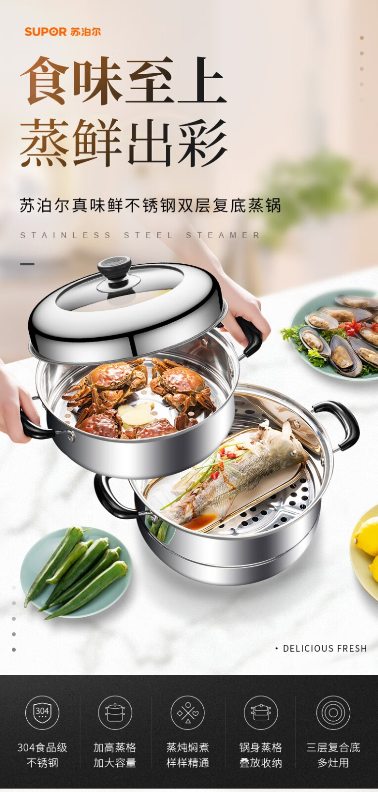 SUPOR steamer 304 stainless steel double-layer double-bottom soup pot steamer large capacity high arch lid pot induction cooker gas universal high arch lid double layer diameter 28cm