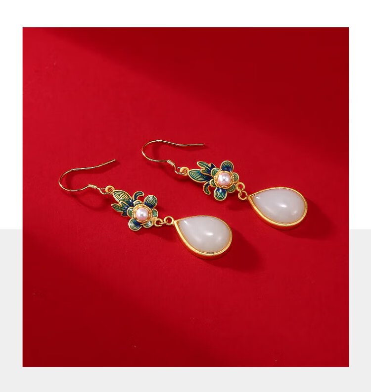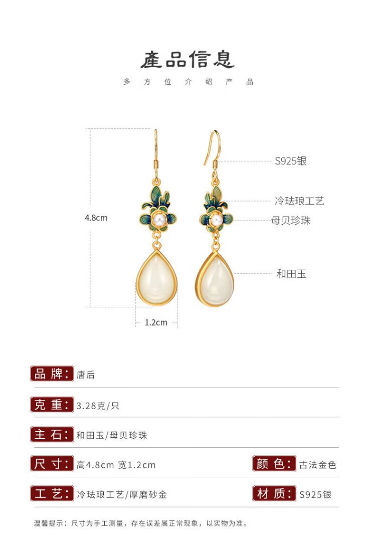 Tang Hou Natural Hetian Jade Earrings Women's New Chinese Style Earrings Sterling Silver Hanfu Cheongsam Earrings Birthday and Holiday Gifts