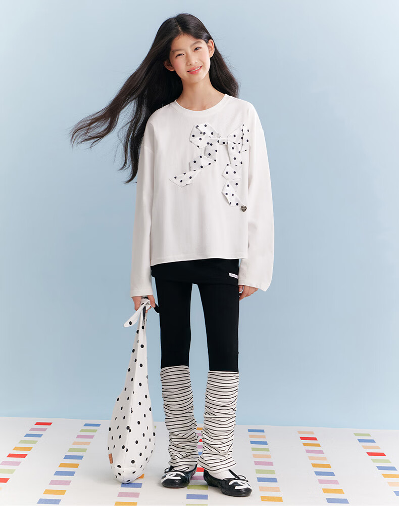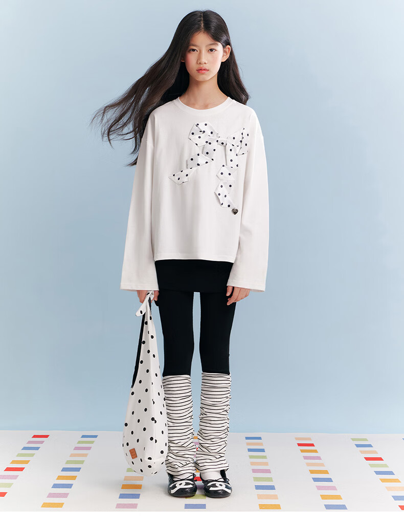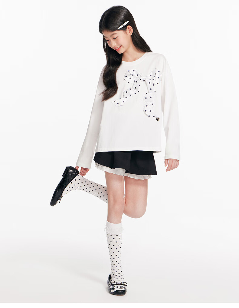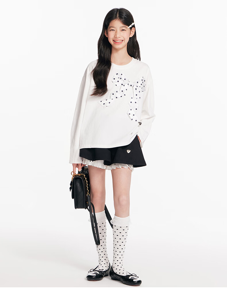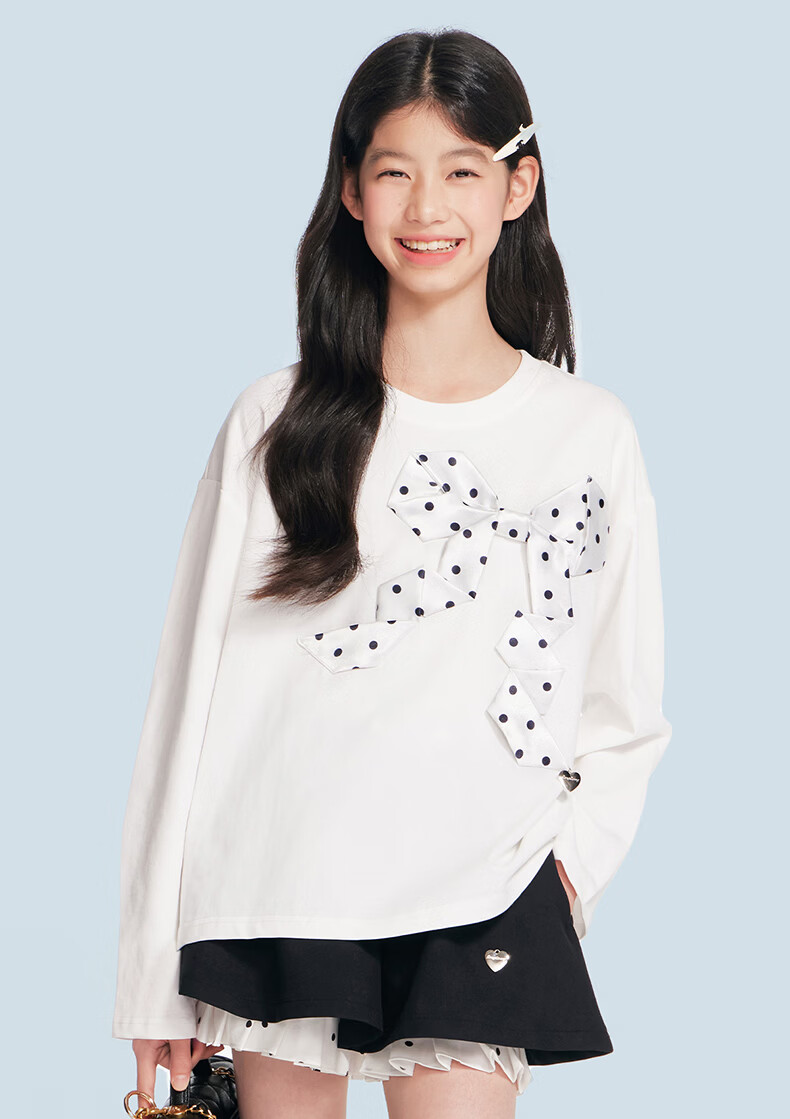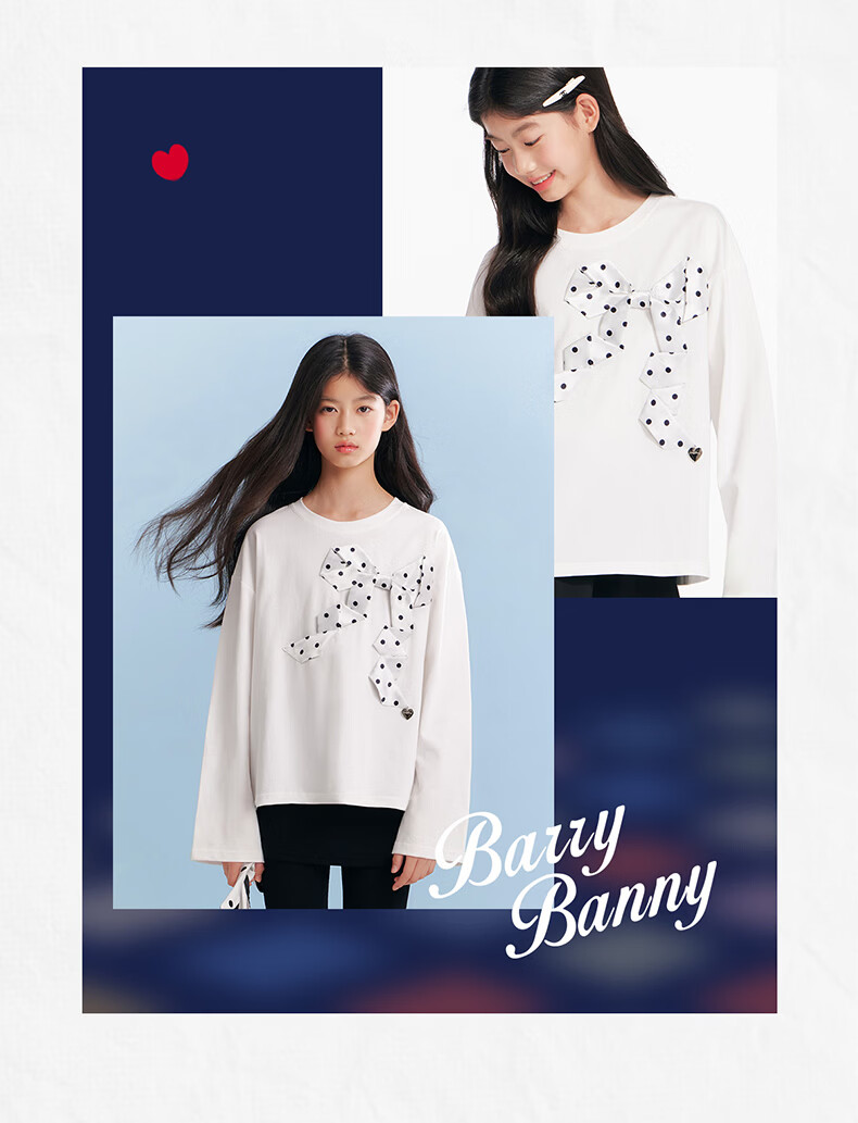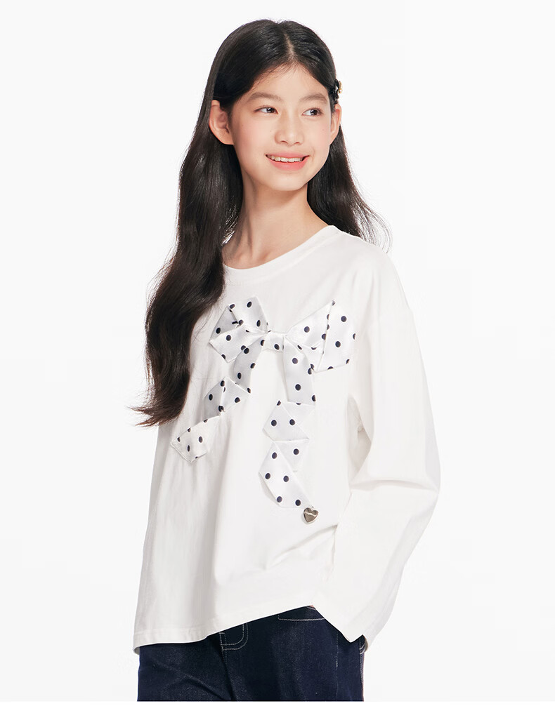 BARRY BANNY Girls' Bow T-shirt 2026 Spring Medium and Large Children's Pure Cotton Long-Sleeved Round Neck Casual Top Gardenia White 160