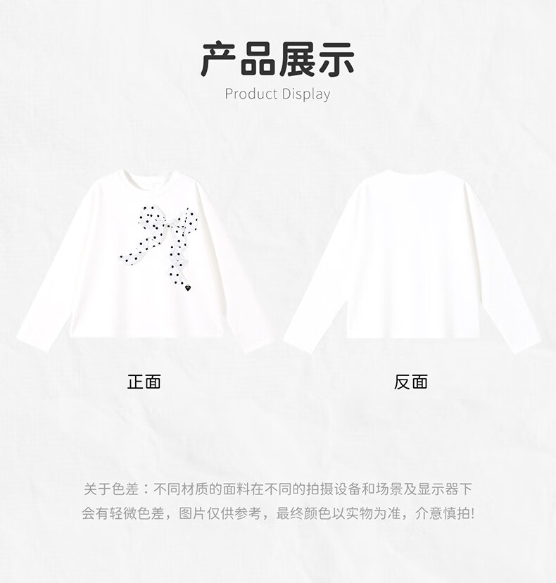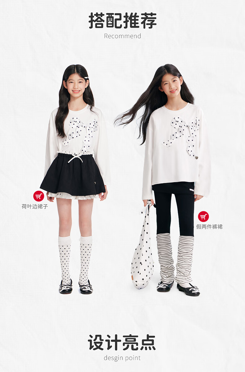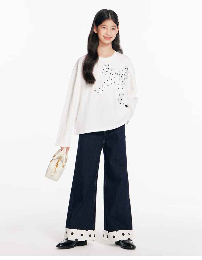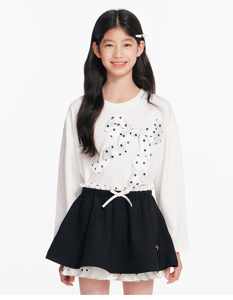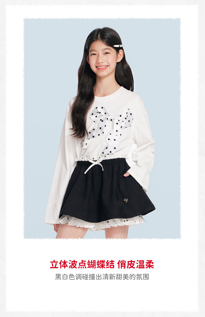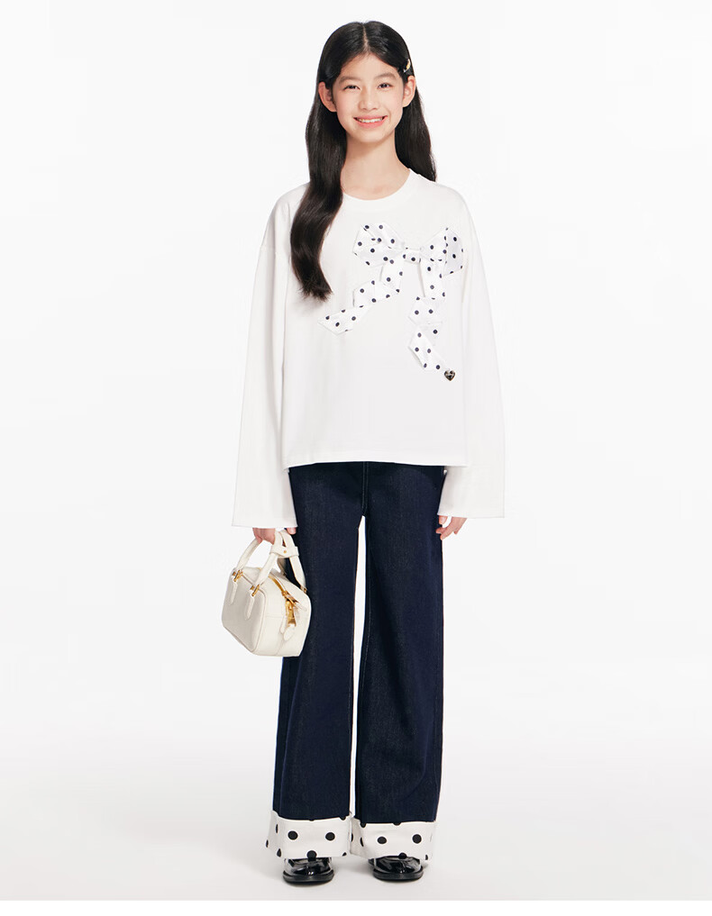 BARRY BANNY Girls' Bow T-shirt 2026 Spring Medium and Large Children's Pure Cotton Long-Sleeved Round Neck Casual Top Gardenia White 160