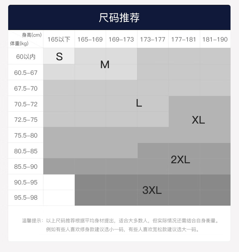 China (cm) 165 / 88-90 170 / 96-98 175 / 108-110 180 / 118-122 185 / 126-130