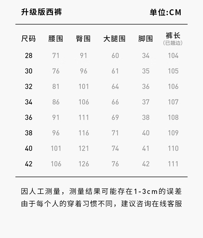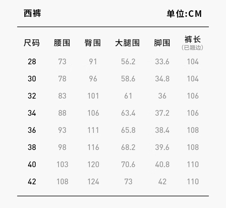 Outseam (cm) 99 cm 101.5 cm 104 cm 106.5 cm 109 cm