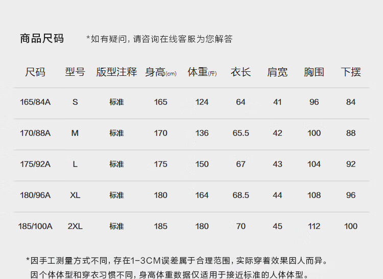 China (cm) 165 / 88-90 170 / 96-98 175 / 108-110 180 / 118-122 185 / 126-130