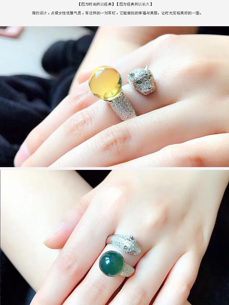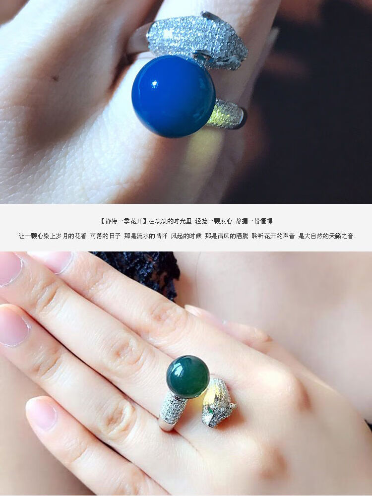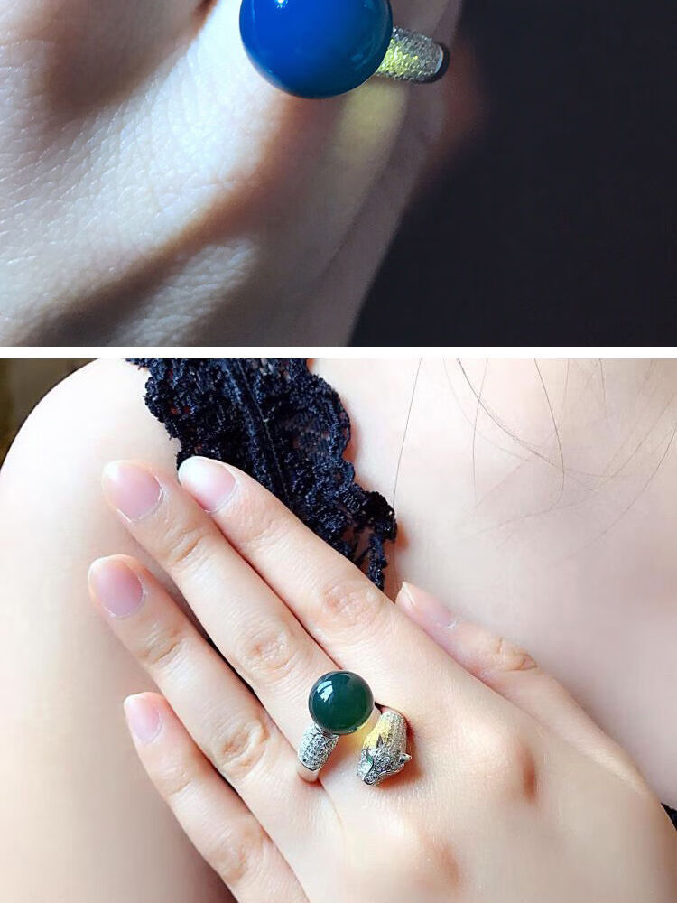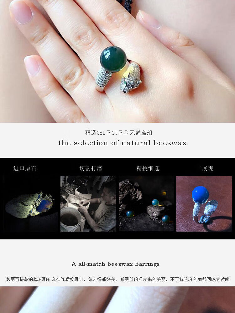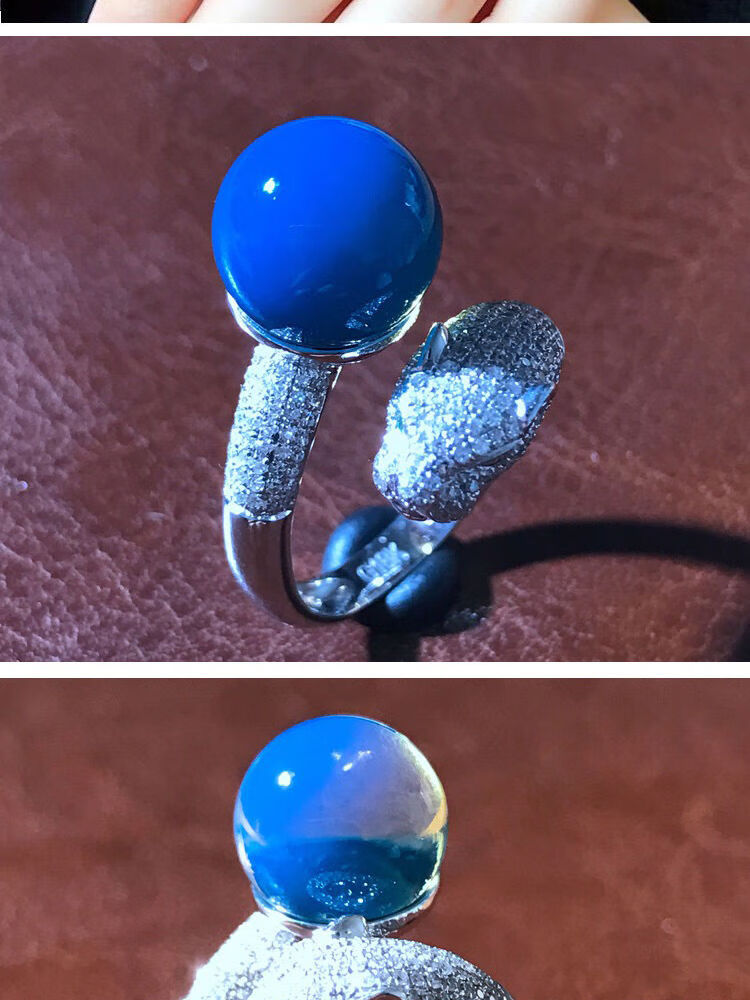 Natural Dominican amber ring S925 silver high blue 3A pure water amber leopard head live ring for women Dominican amber 12mm round beads