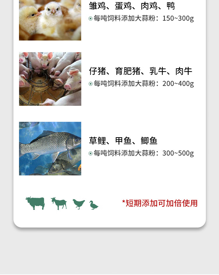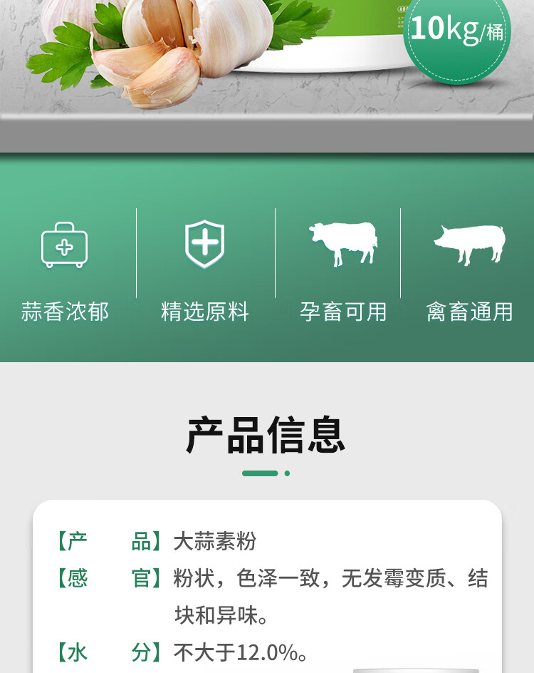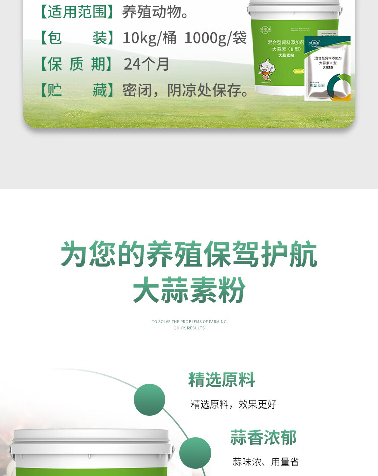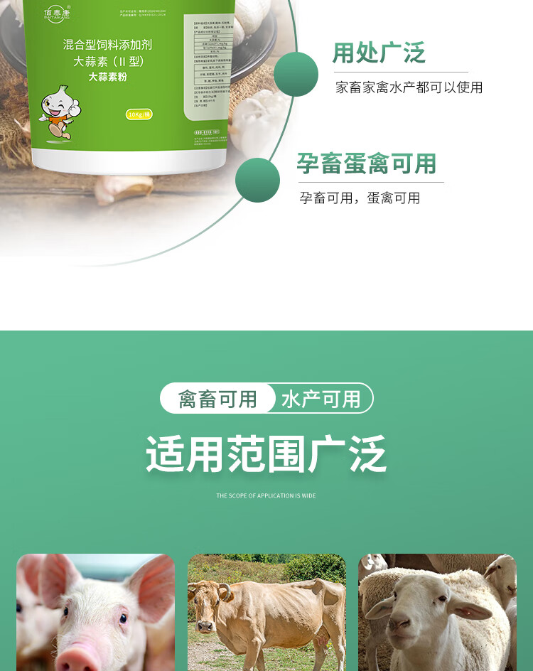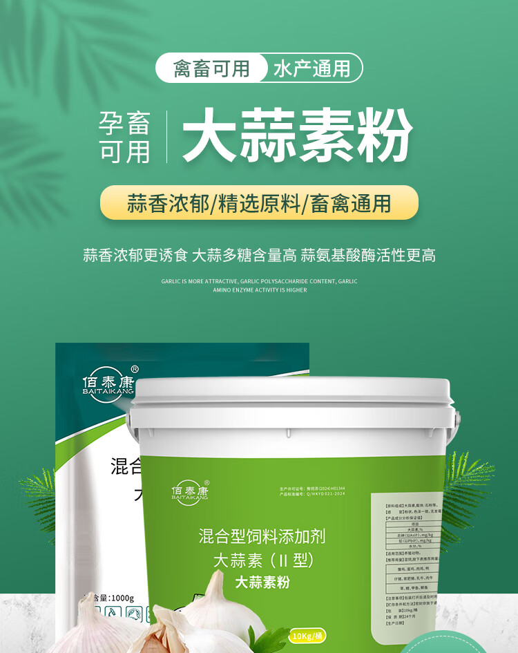 Allicin is used as an appetizer for pigs, cattle, sheep, chickens, ducks and geese. It can be used as an aquatic feed additive for pregnant animals. 10kg/barrel