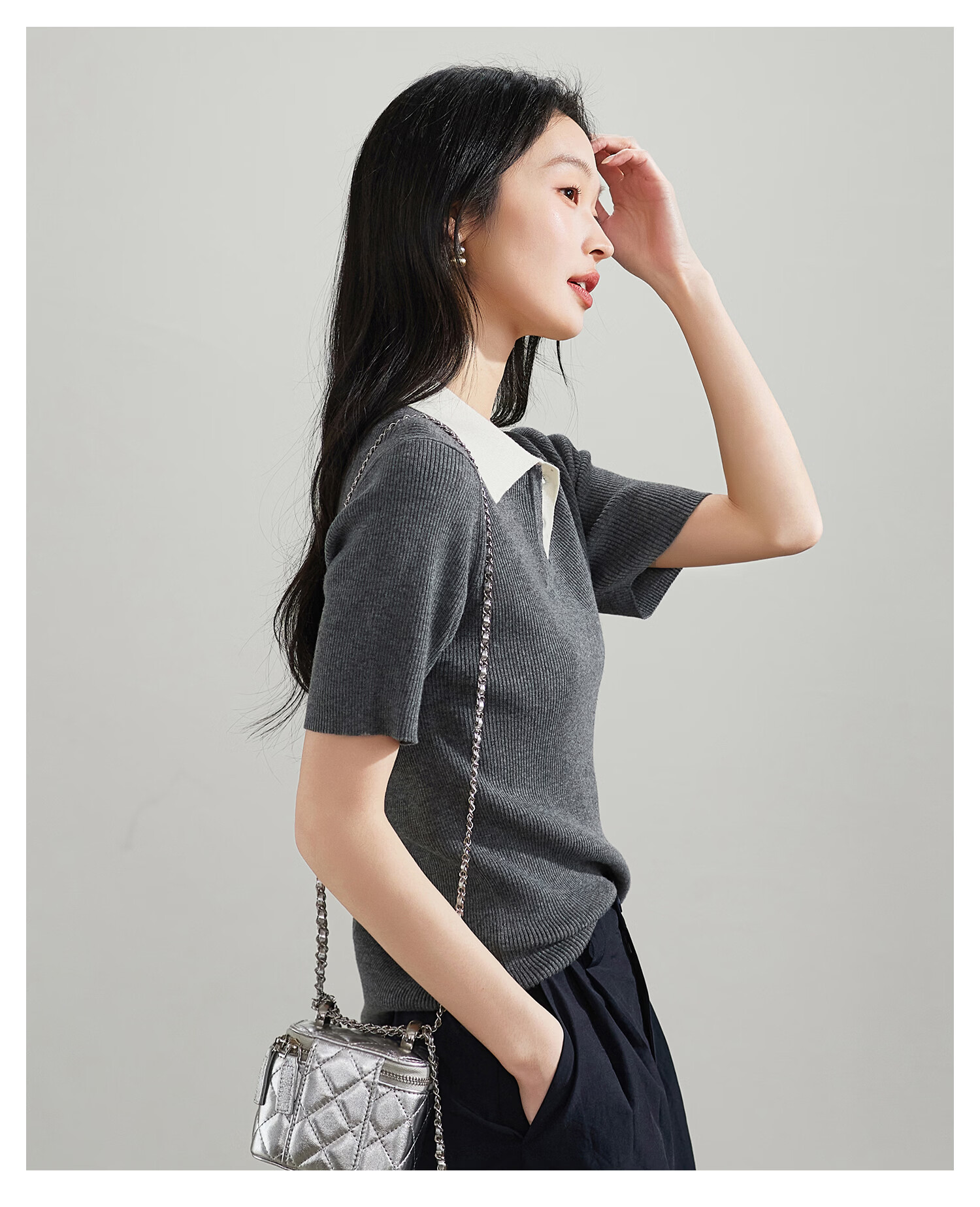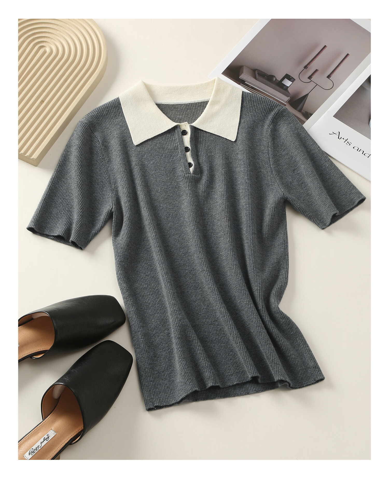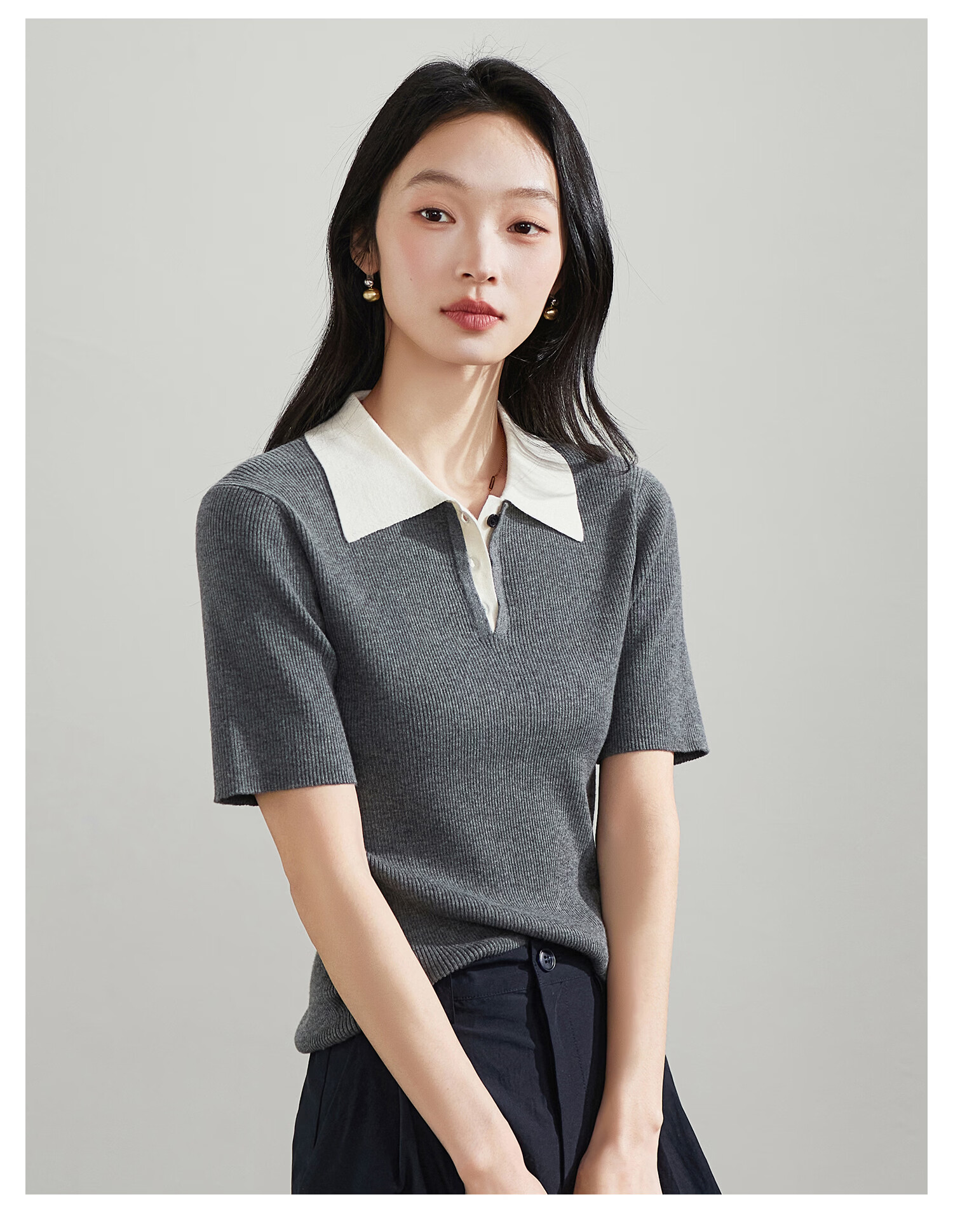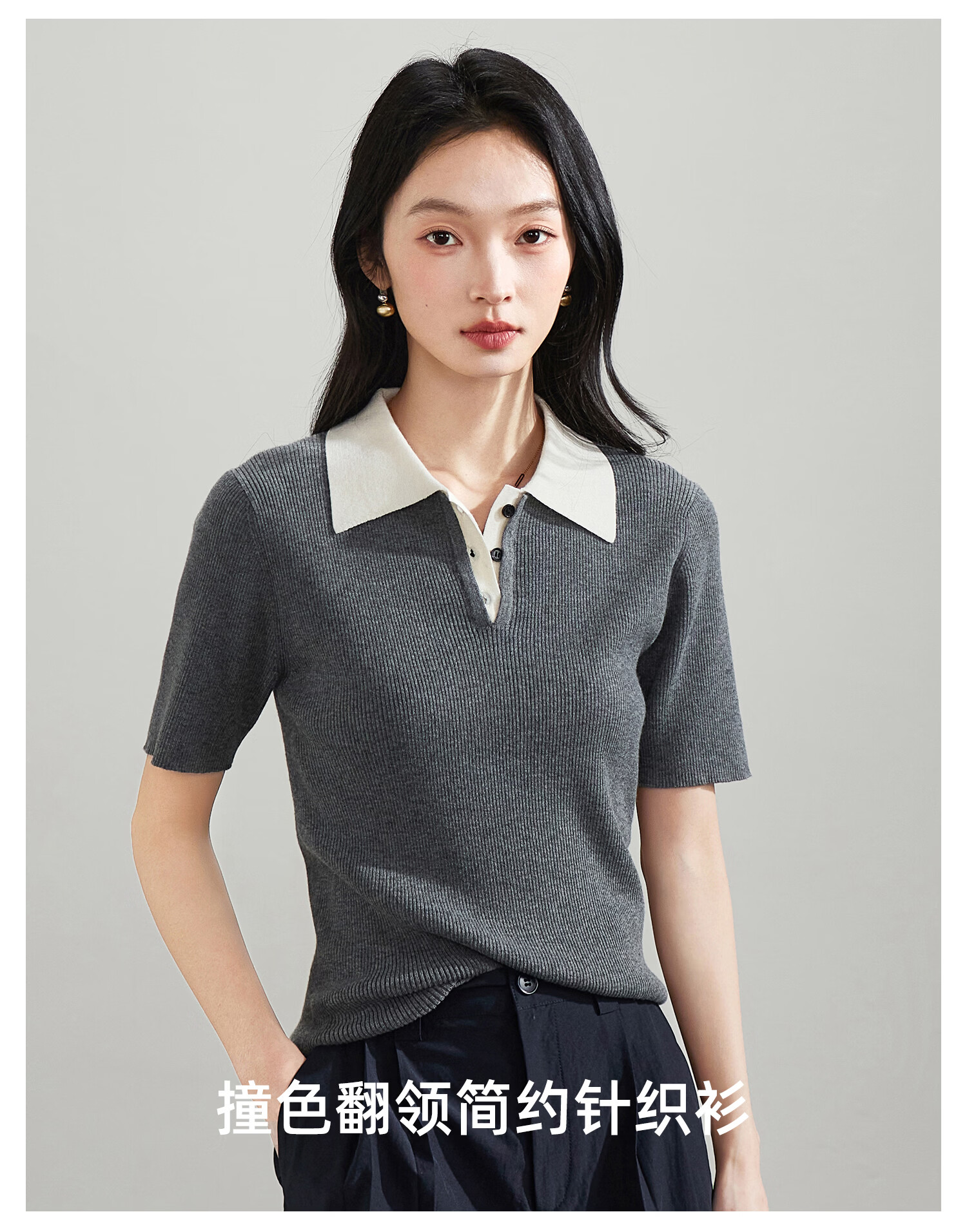 SOFSIL 2026 Spring New Contrast Color Simple POLO Collar Sweater Women's Short Sleeve Versatile Slim Solid Color Lapel Top