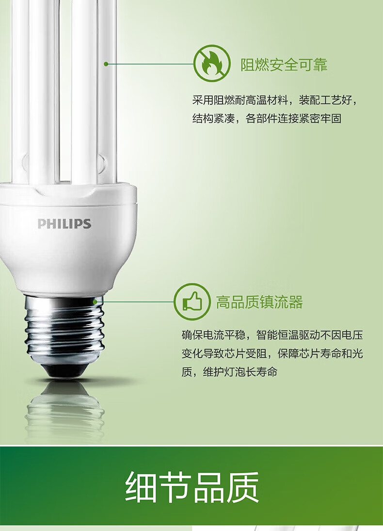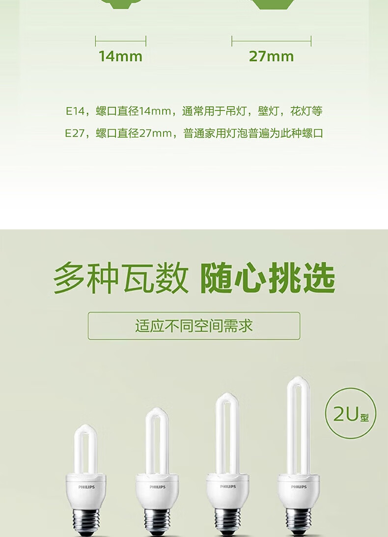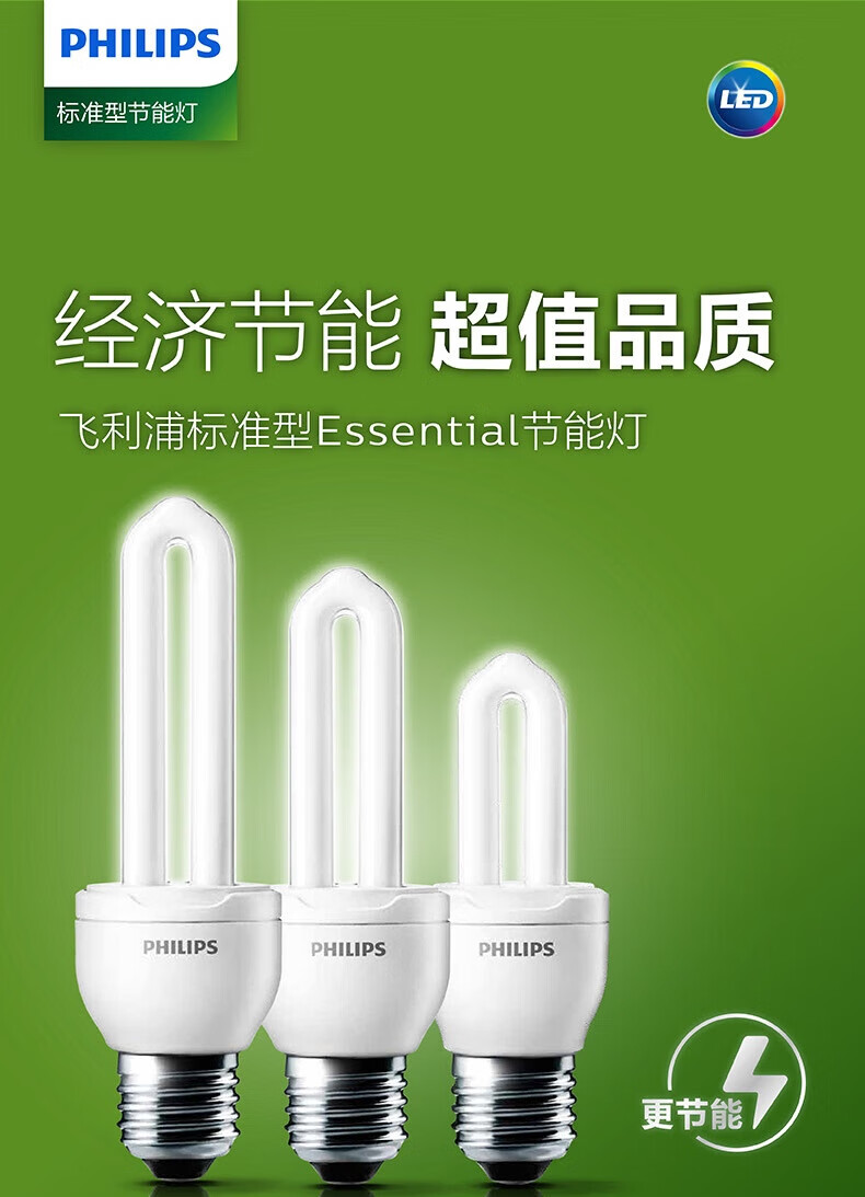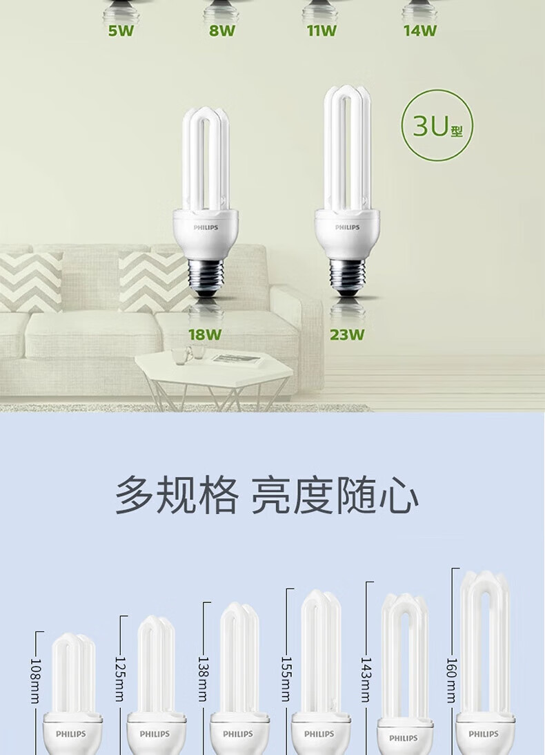Philips (PHILIPS) 2U three-color energy-saving light bulb e27 large screw household energy-saving lamp U-shaped super bright fluorescent lamp 8w-white light 6500K