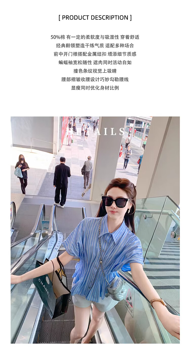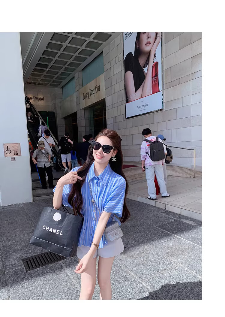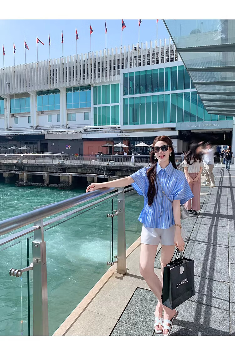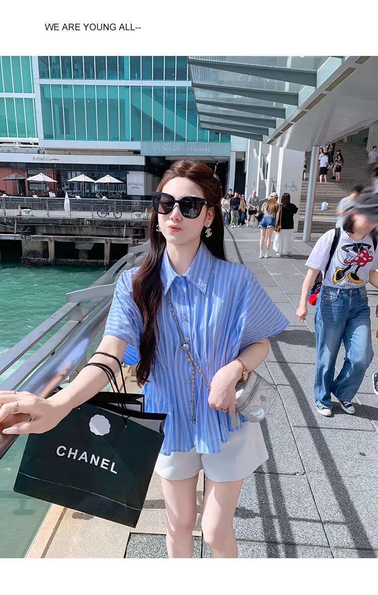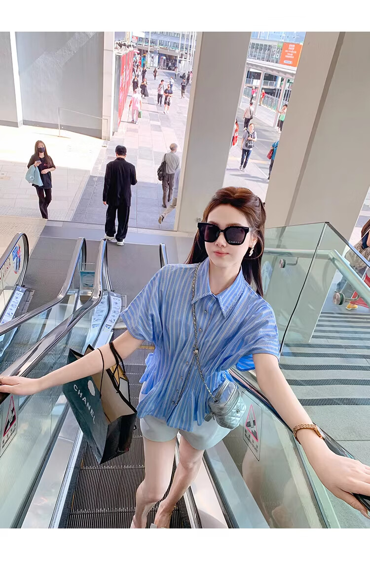Fish Rabbit's rabbit waist slimming blue striped shirt women's design short-sleeved shirt temperament women's top blue M