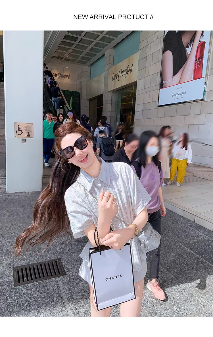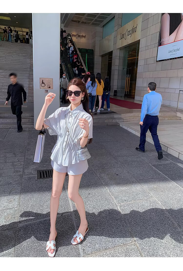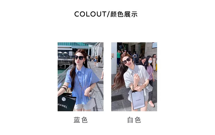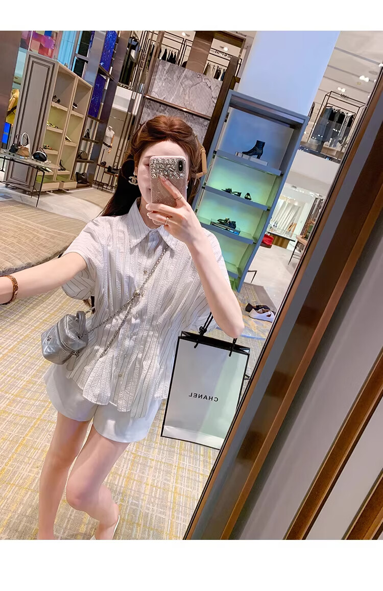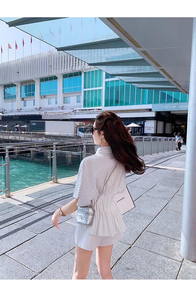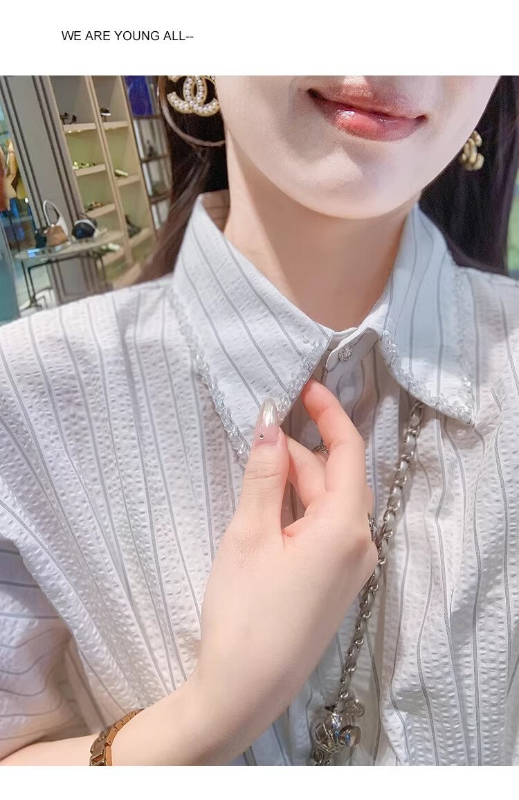 Fish Rabbit's rabbit waist slimming blue striped shirt women's design short-sleeved shirt temperament women's top blue M