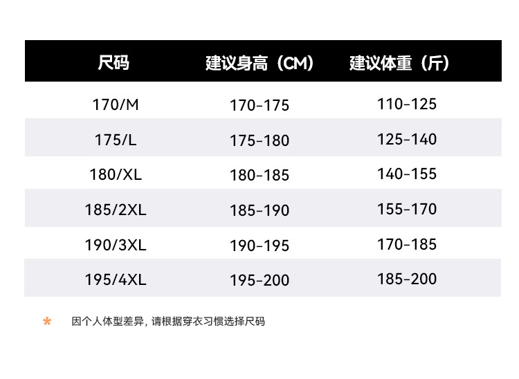 China (cm) 160-165/84-86 165-170 / 88-90 167-172 / 92-96 168-173 / 98-102 170-176 / 106-110