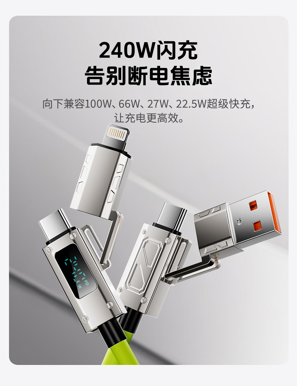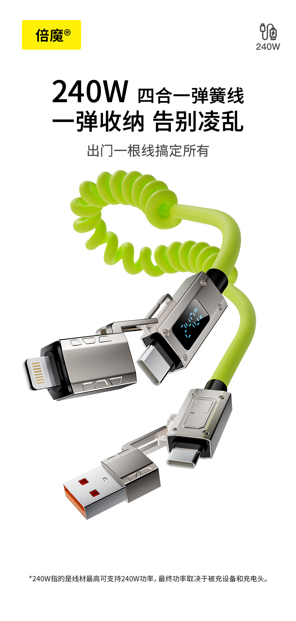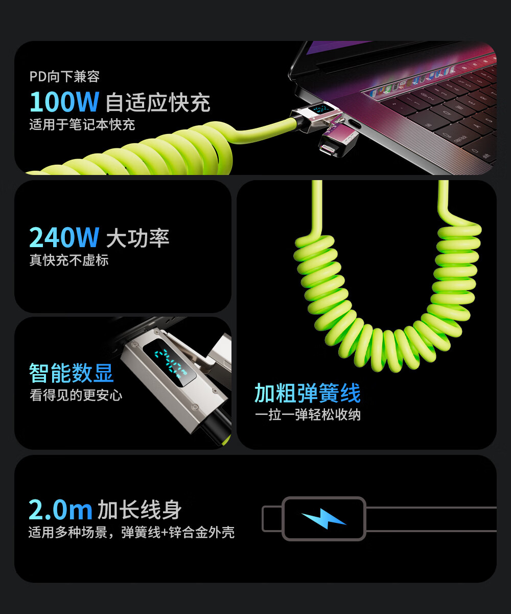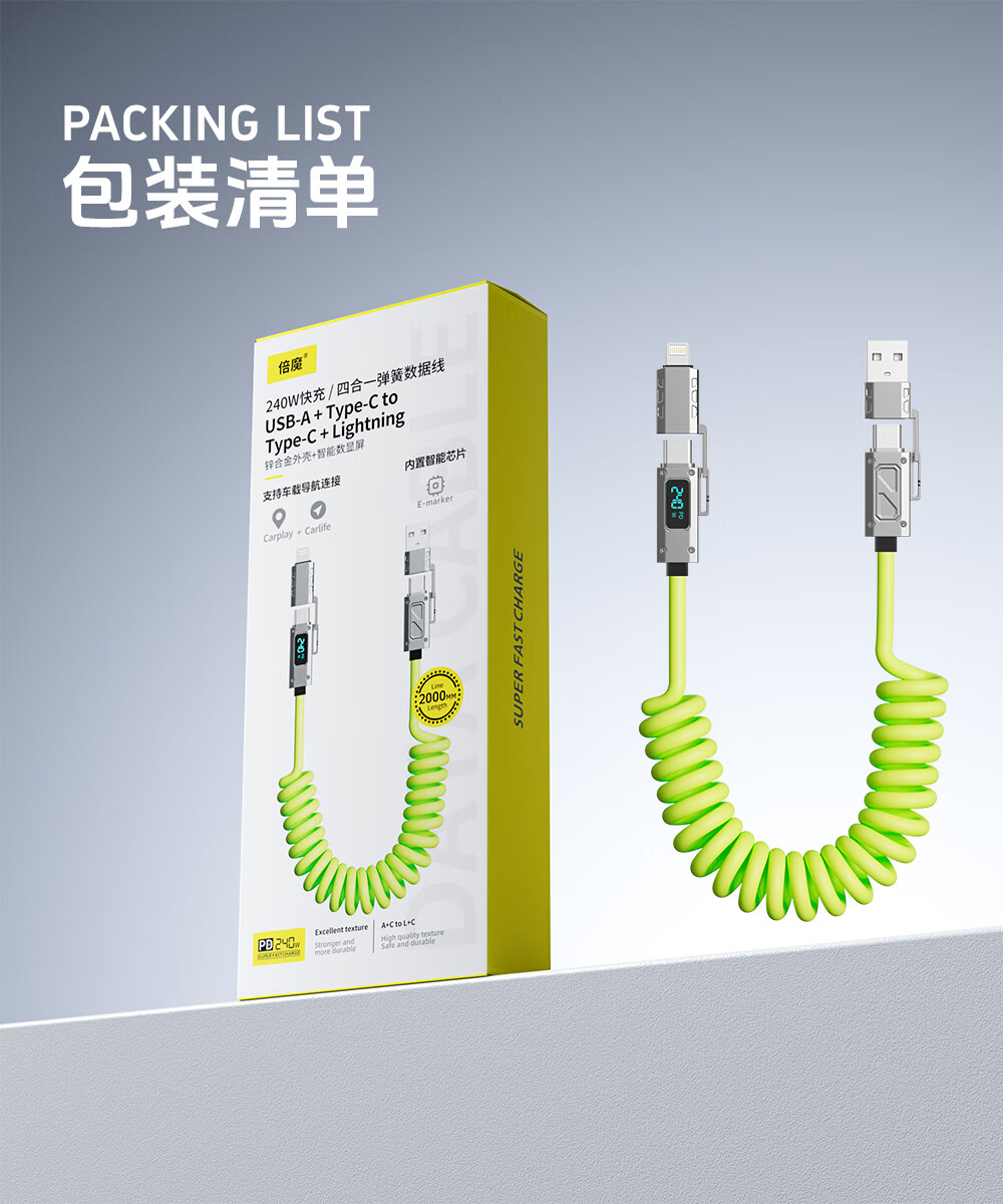 Bemo car spring data cable smart digital display 240W fast charging cable four-in-one car screen projection suitable for Apple 17/Huawei/Xiaomi/vivo/oppo 2 meters fluorescent green