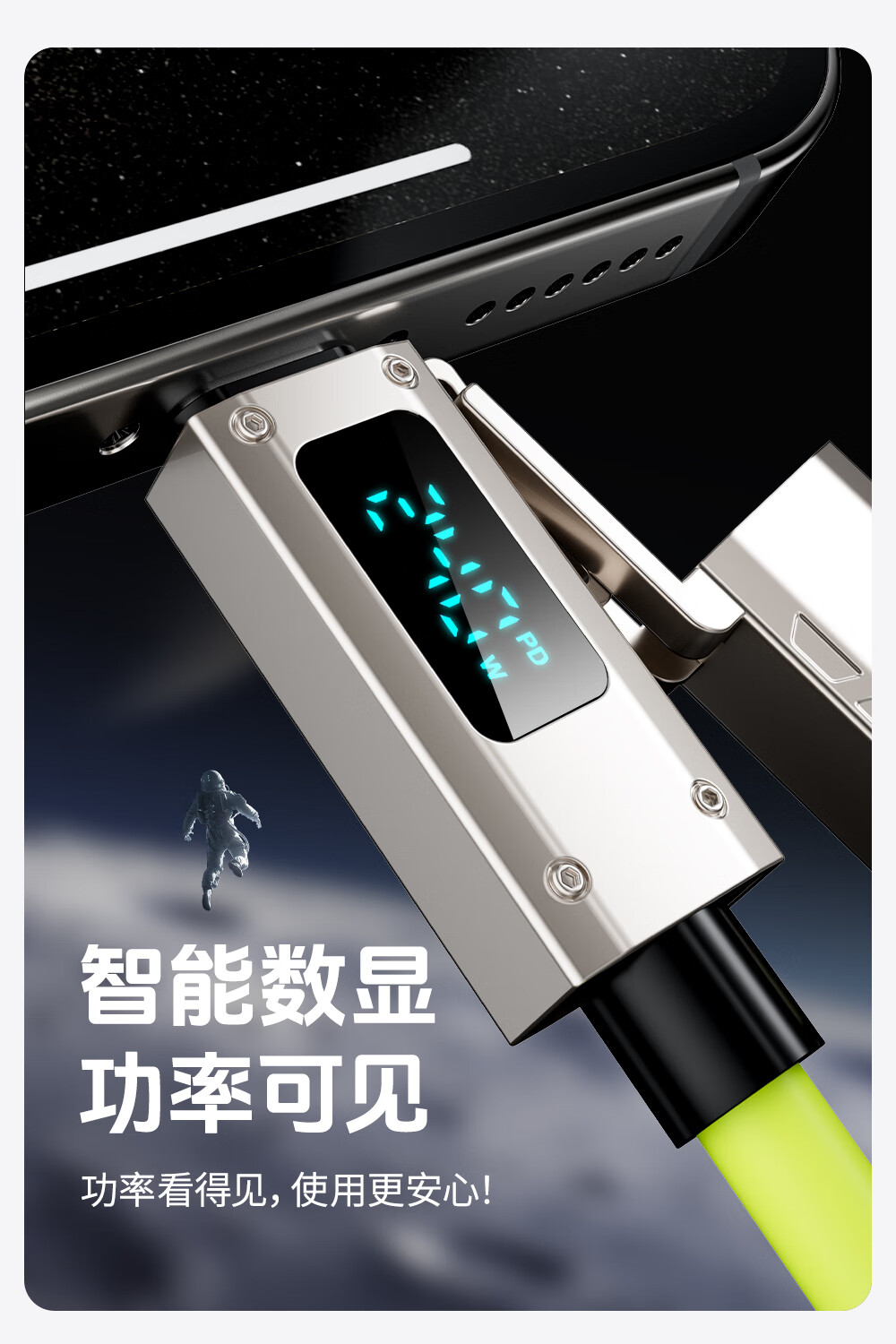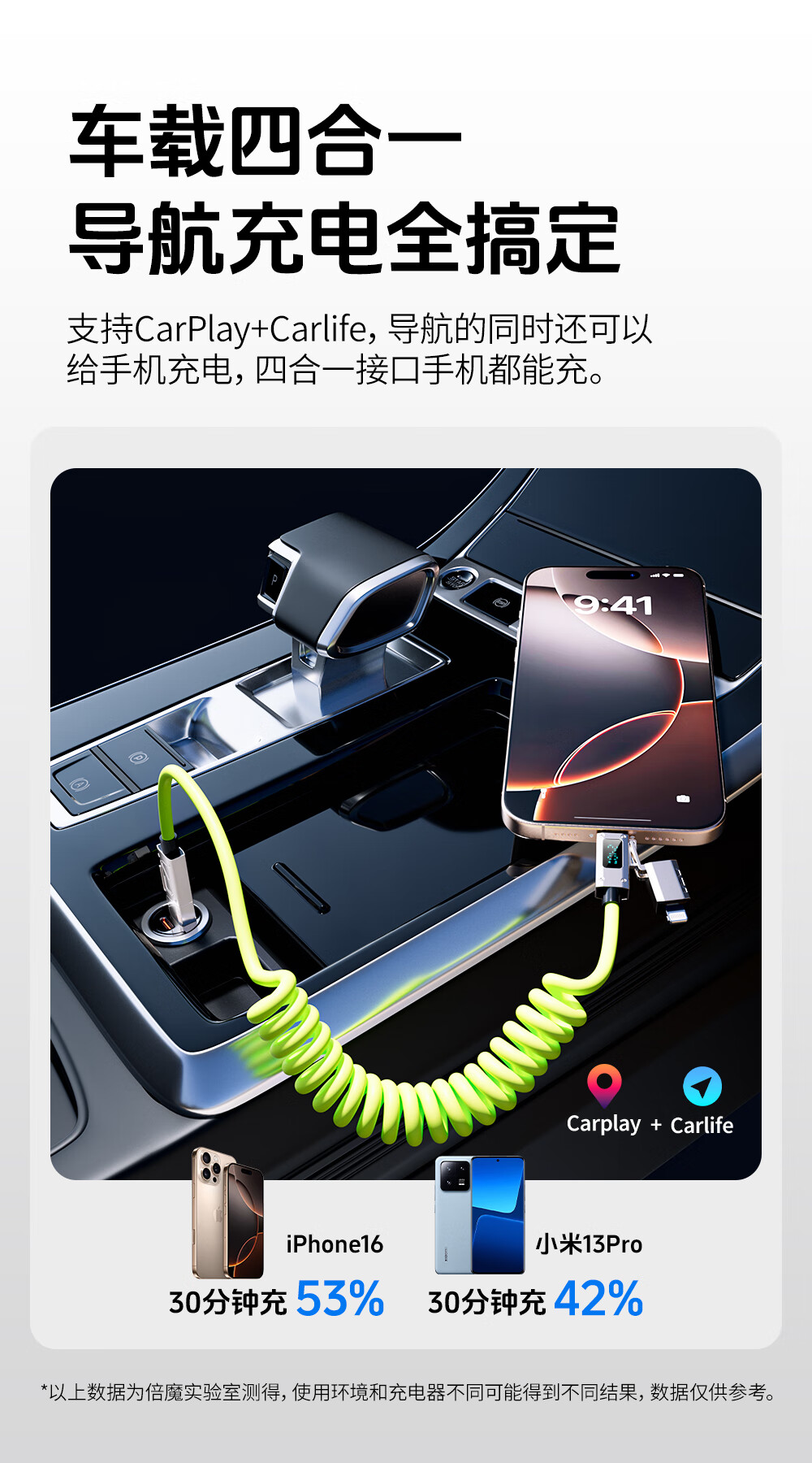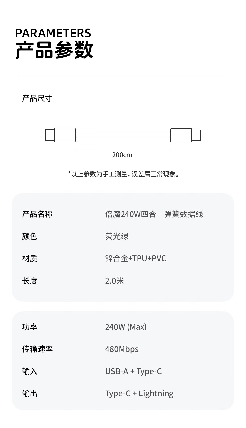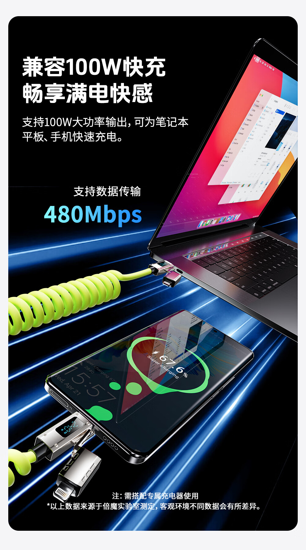 Bemo car spring data cable smart digital display 240W fast charging cable four-in-one car screen projection suitable for Apple 17/Huawei/Xiaomi/vivo/oppo 2 meters fluorescent green