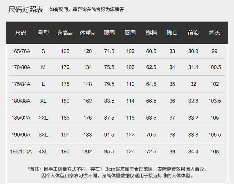 China (cm) 160-165/84-86 165-170 / 88-90 167-172 / 92-96 168-173 / 98-102 170-176 / 106-110