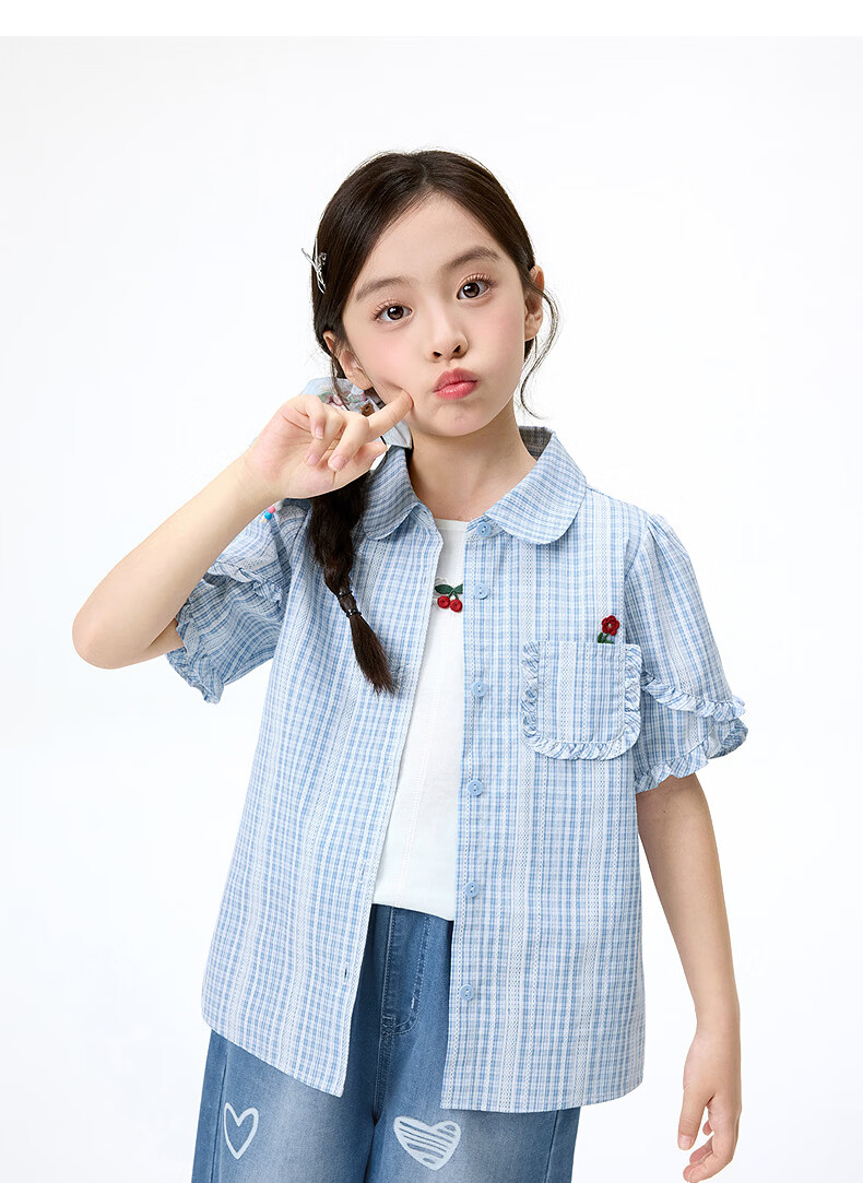 Xiaoyinman children's clothing girls plaid shirt breathable lace cuffs 26 summer middle and large children's lapel casual top