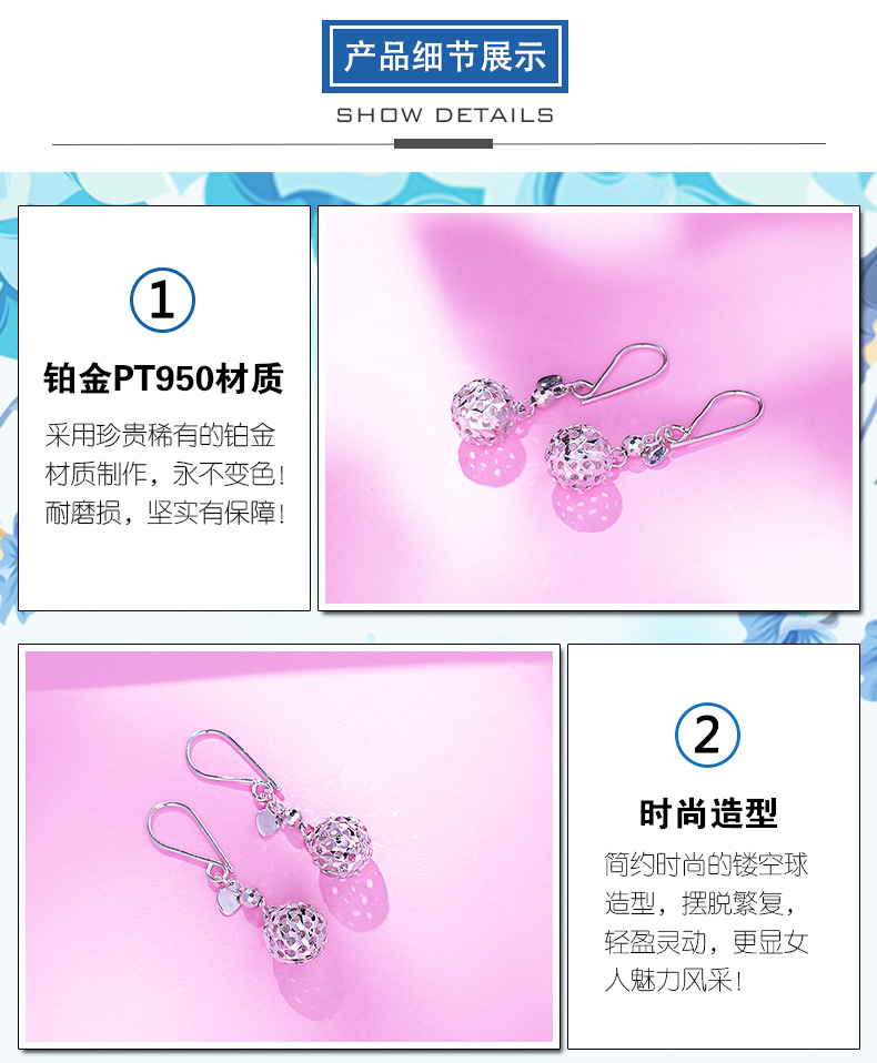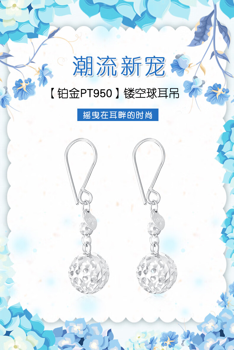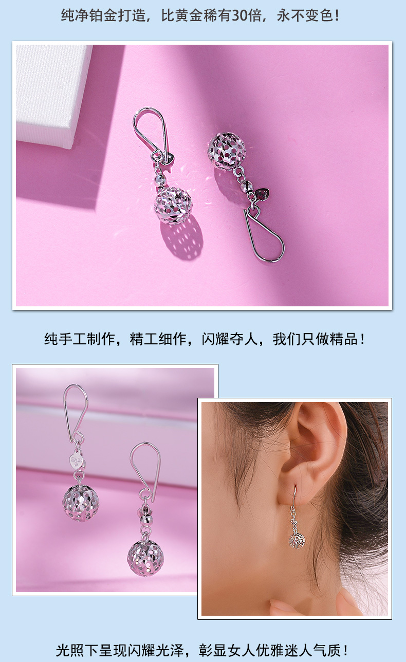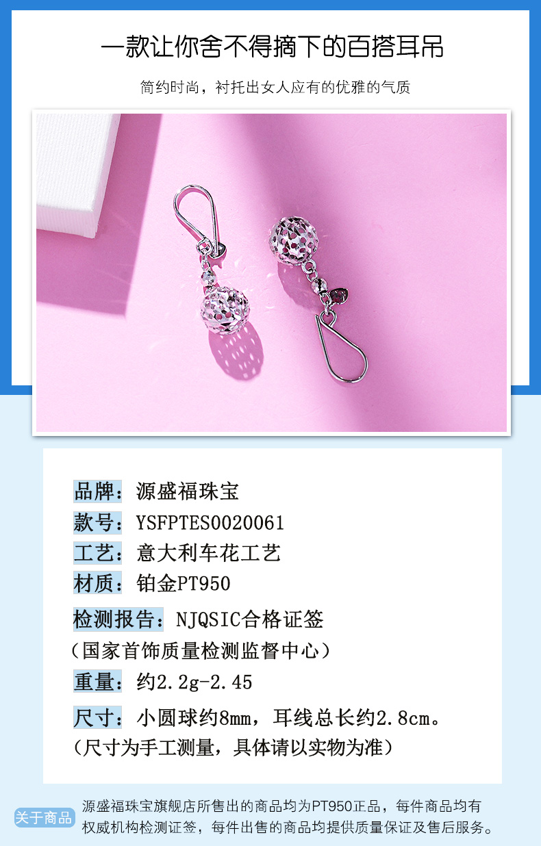 Yuanshengfu's new PT950 high-quality hollow ball platinum earrings, fashionable and versatile platinum earrings, ear hooks 2.42g