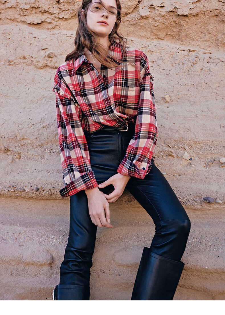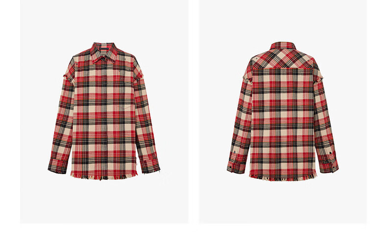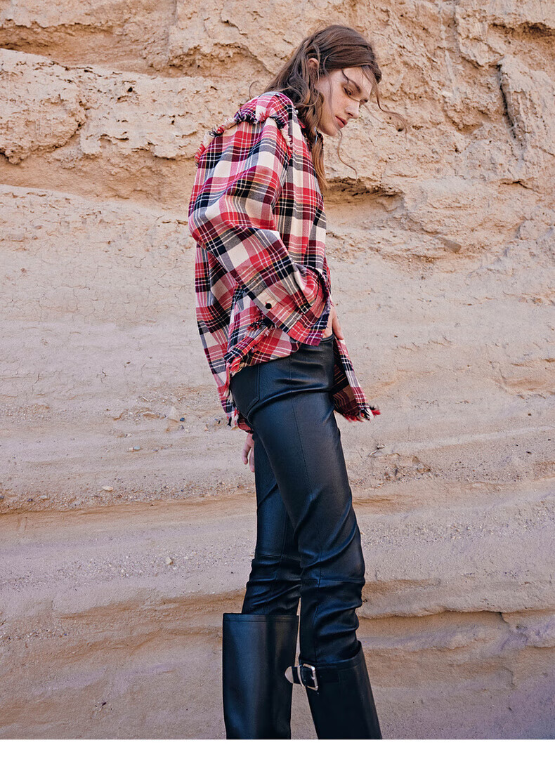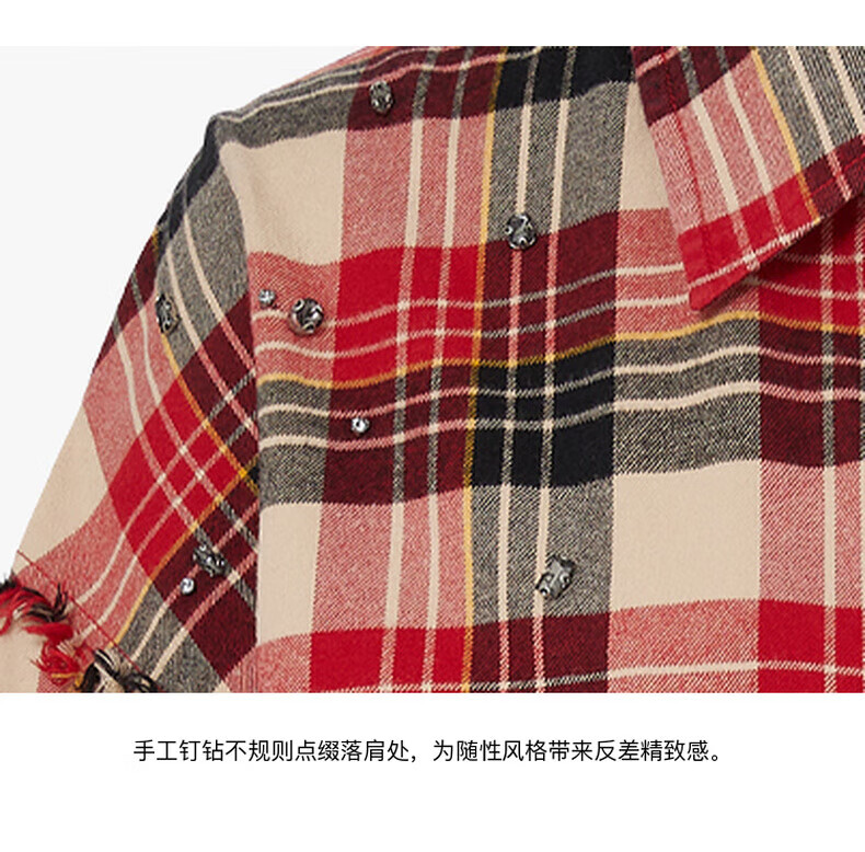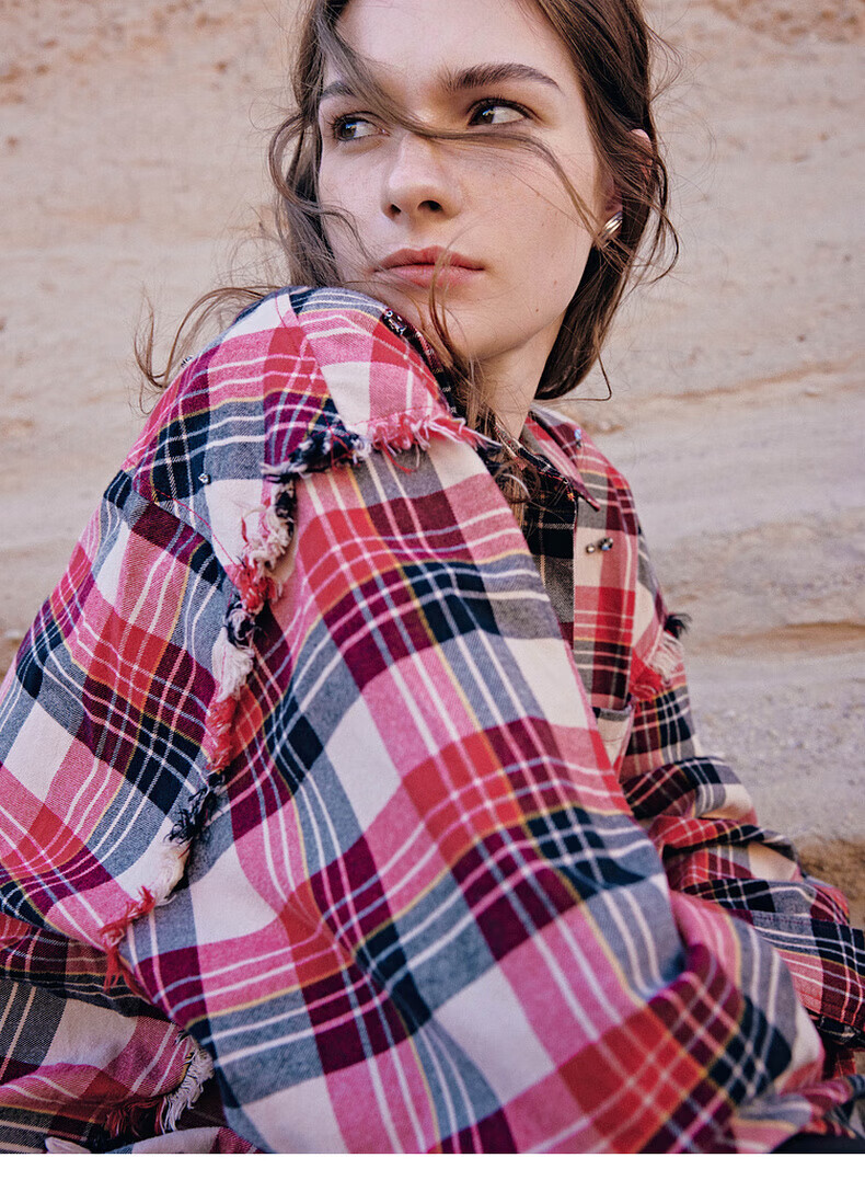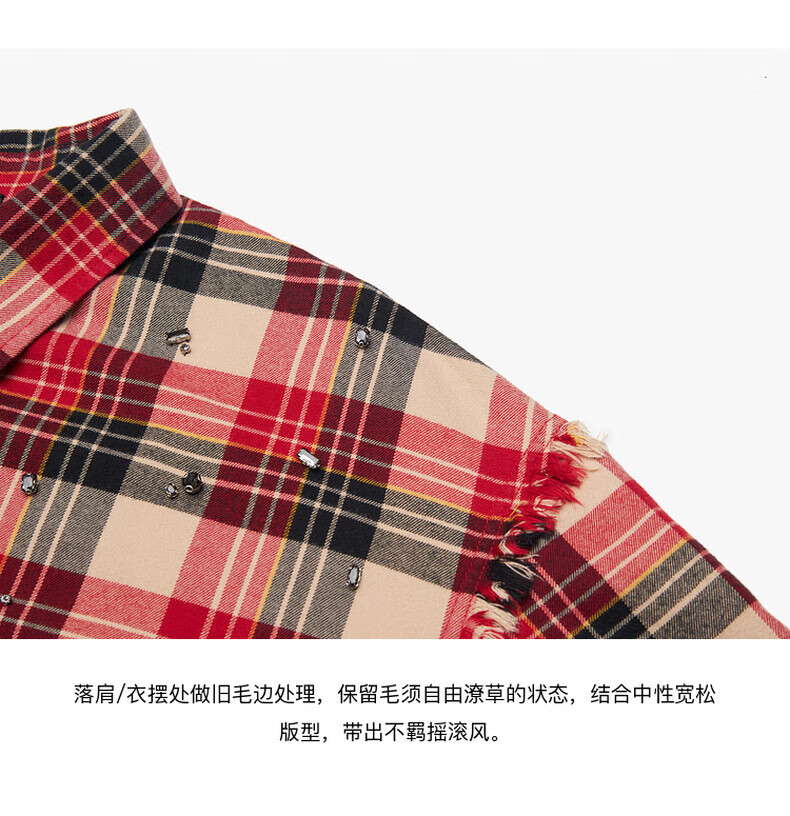 MO&Co.2024 new autumn Scottish plaid tassel raw edge loose thick cotton shirt