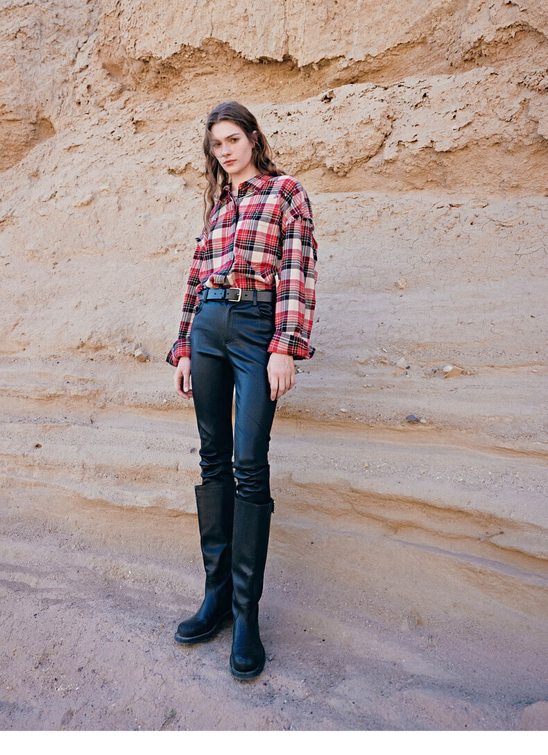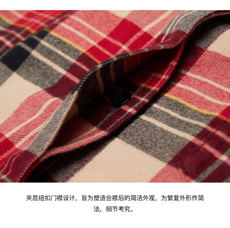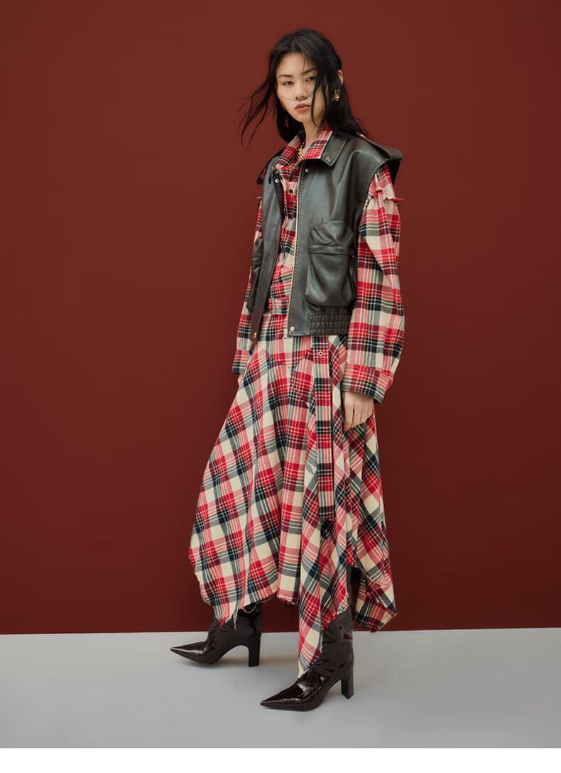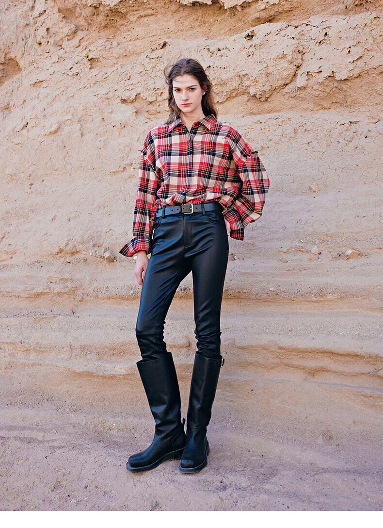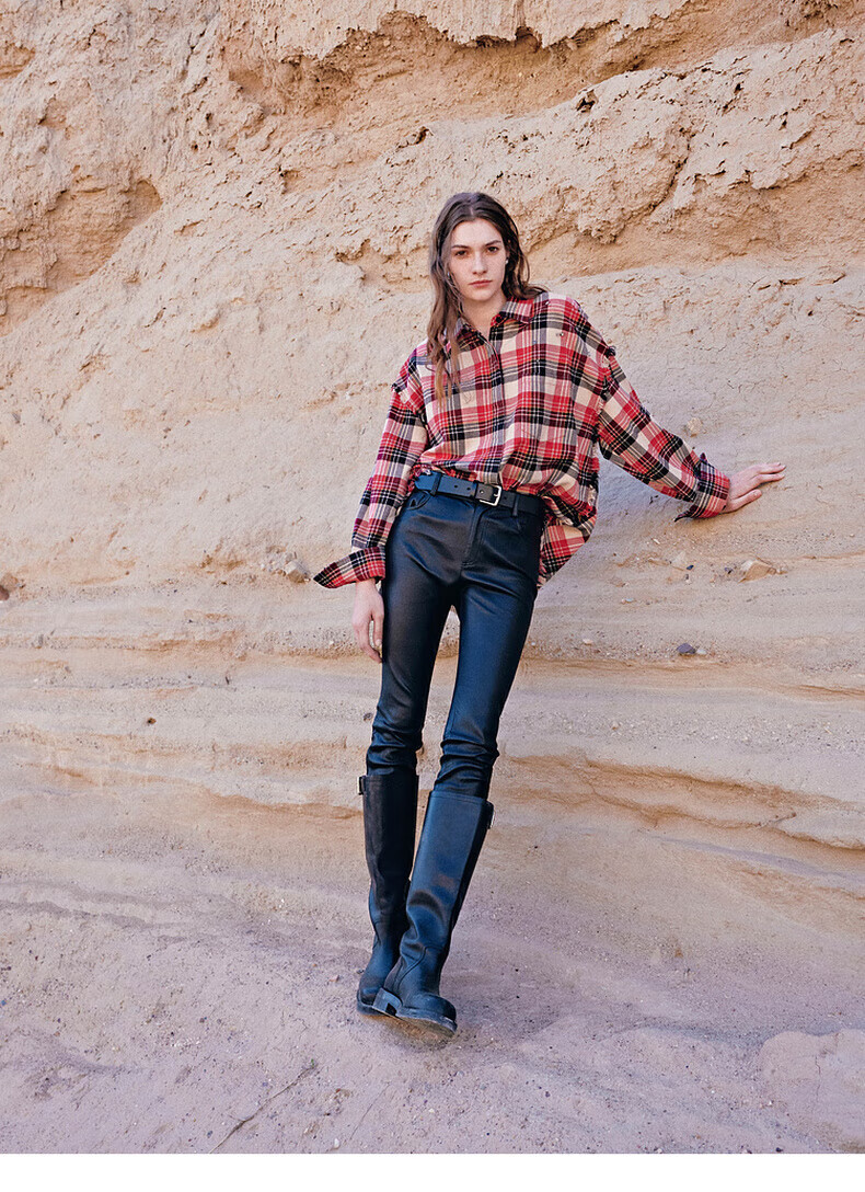 MO&Co.2024 new autumn Scottish plaid tassel raw edge loose thick cotton shirt