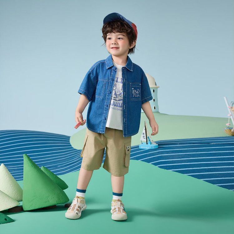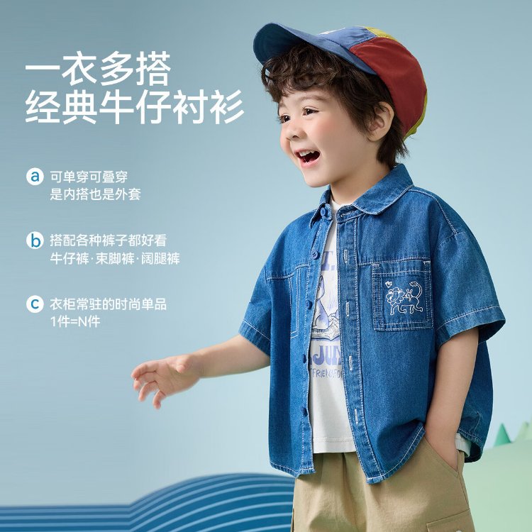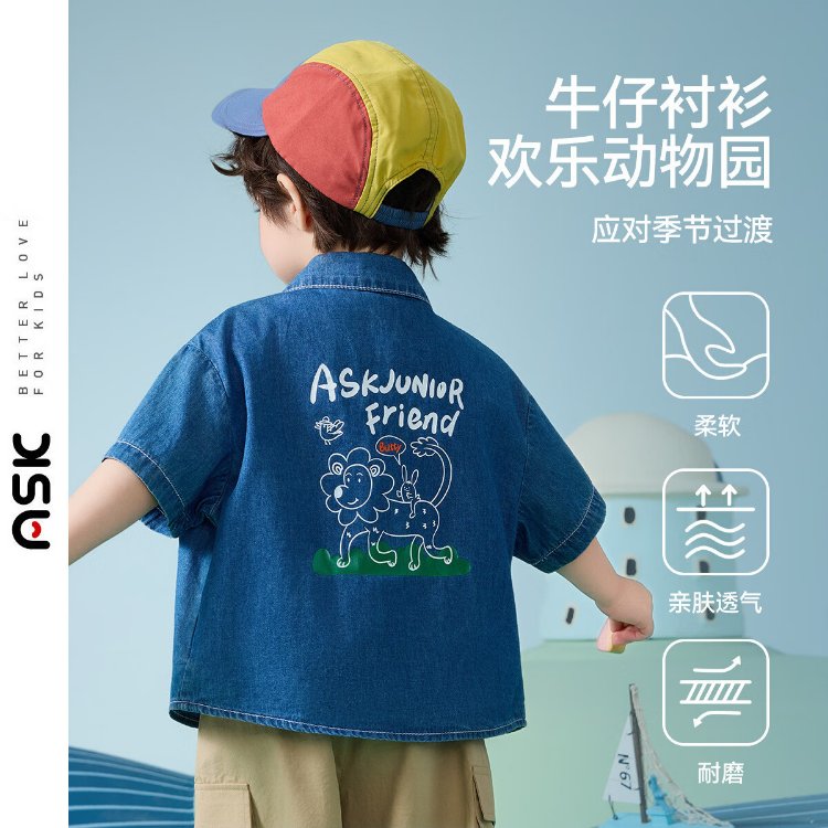 ASK JUNIOR children's cotton shirt summer children's denim shirt jacket boy baby short-sleeved top printing