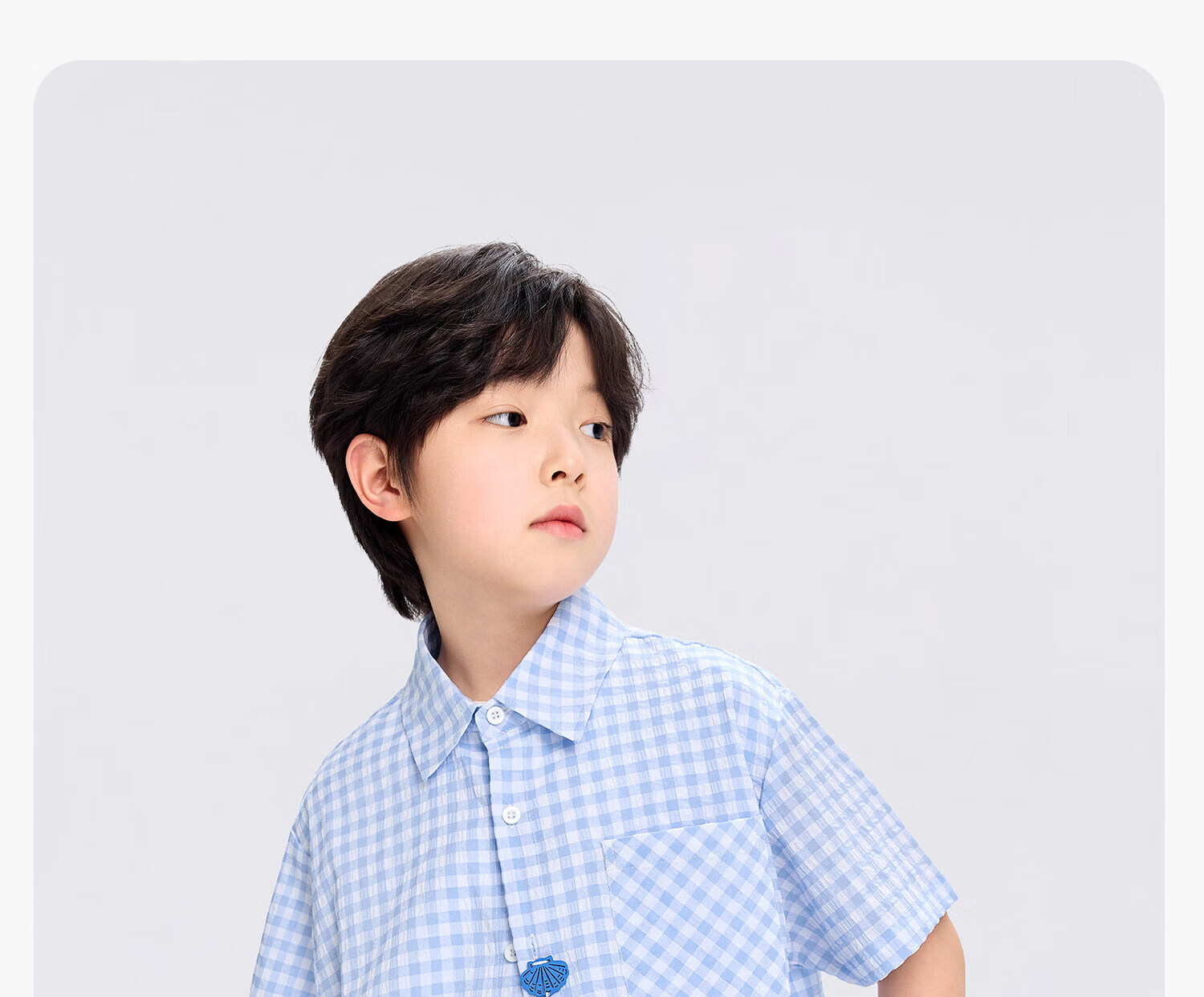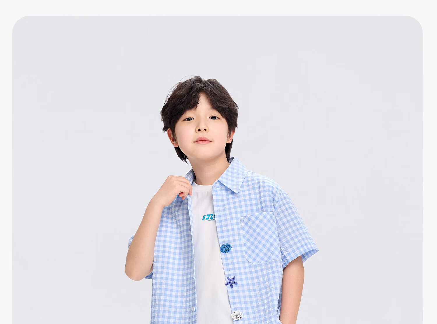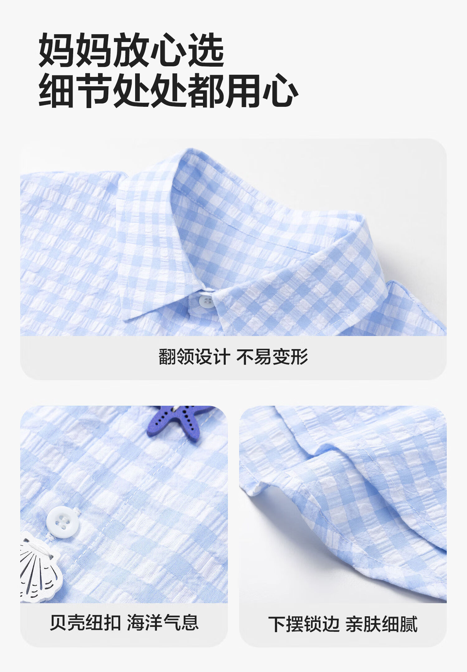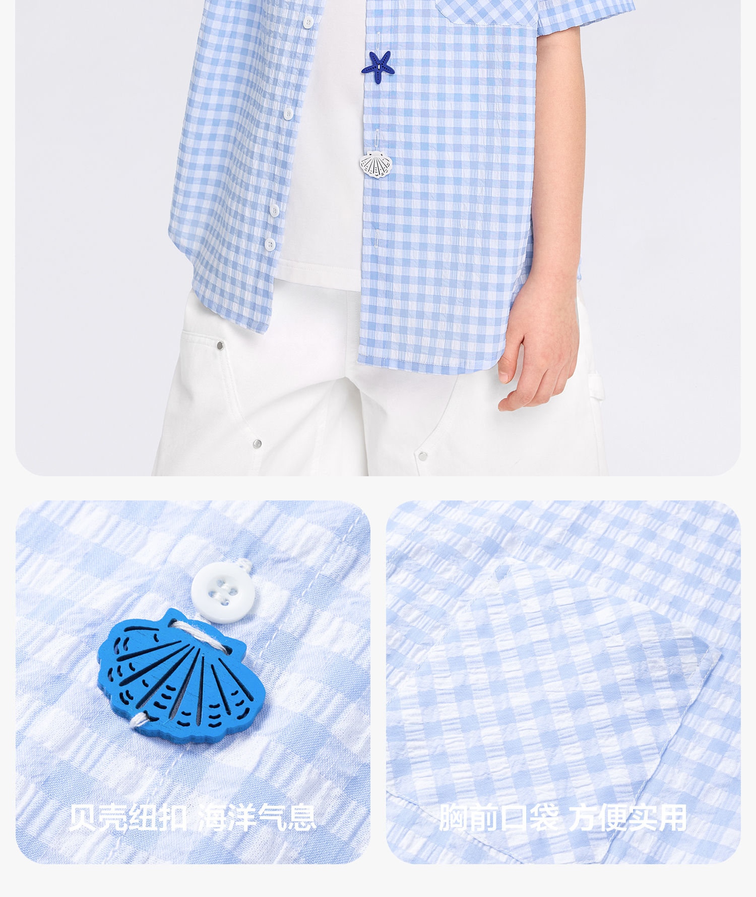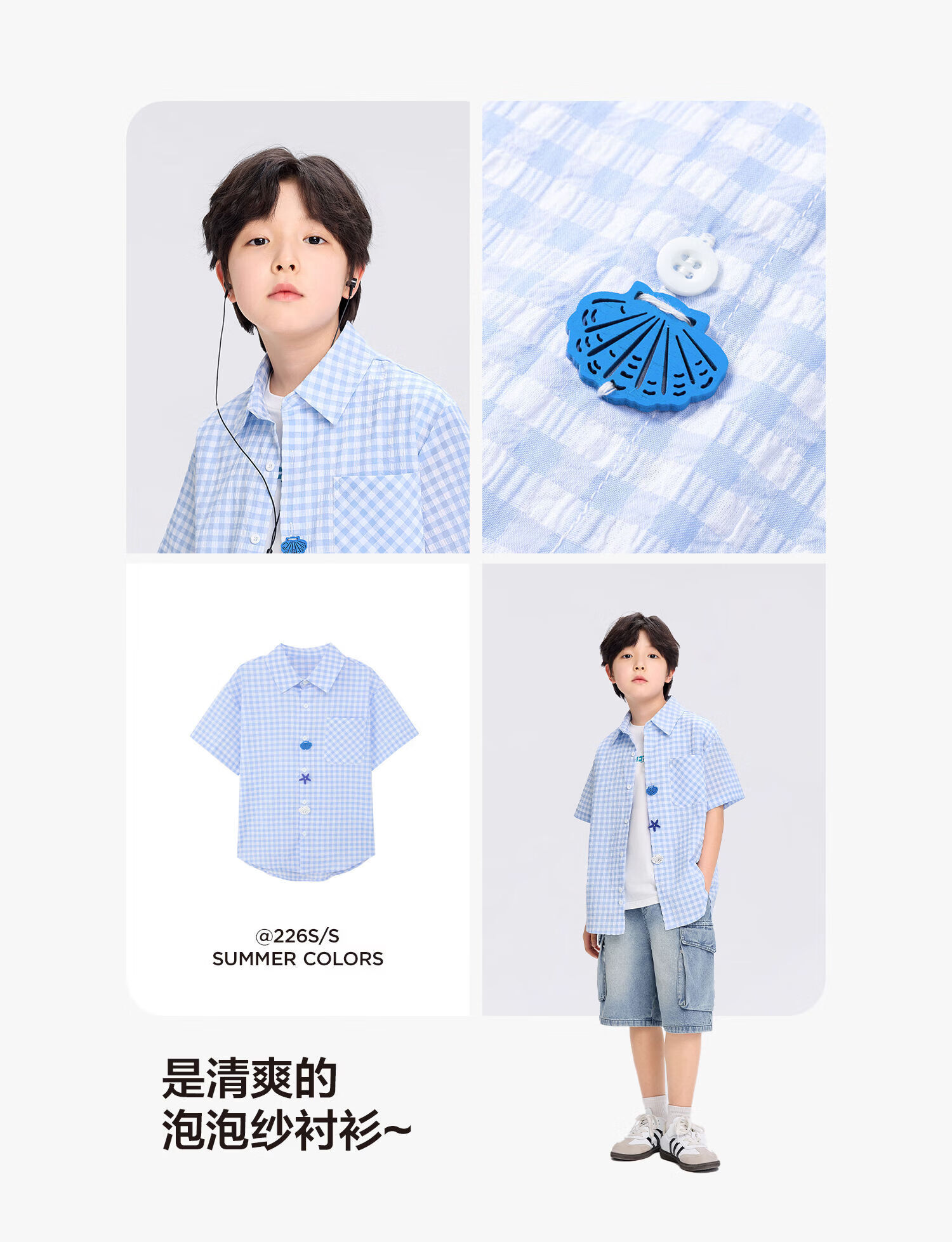 Zuoxi 2026 summer new style boys' interesting button seersucker shirt plaid small shirt blue plaid 165