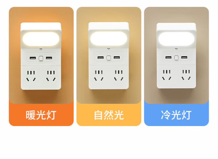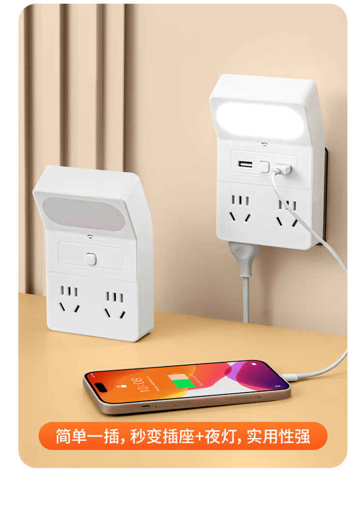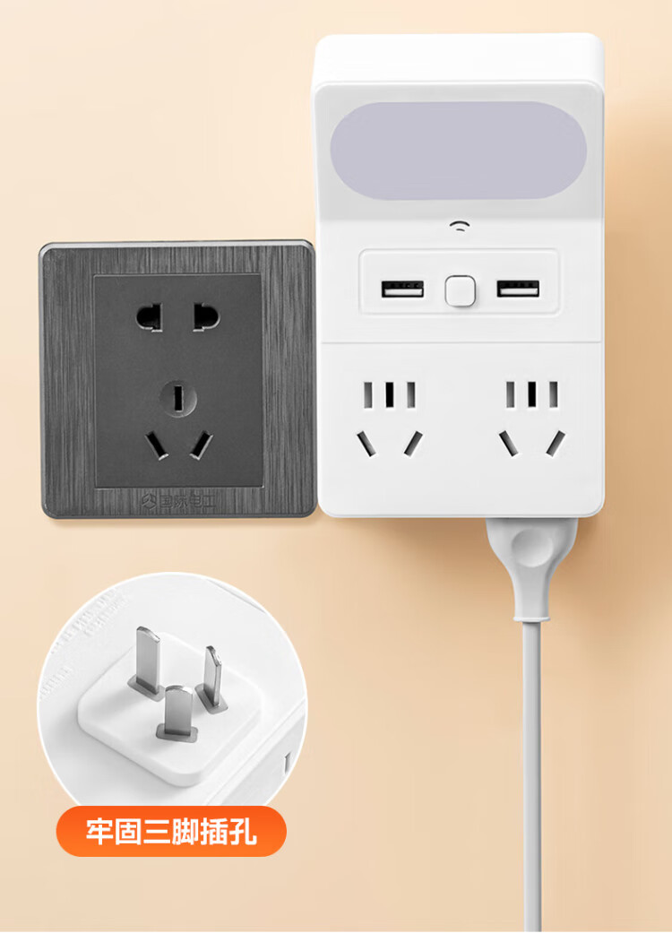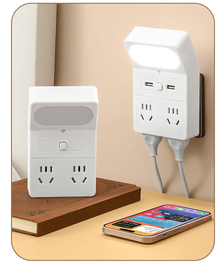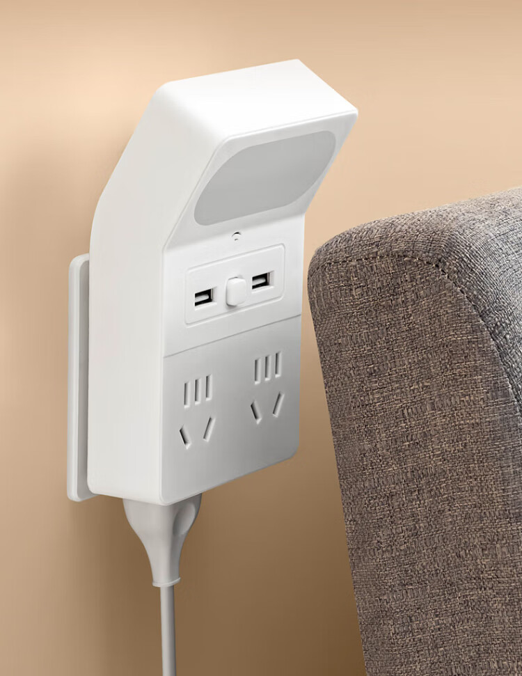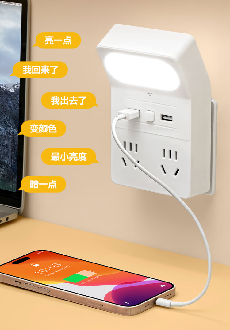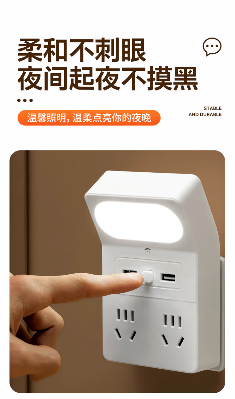 苏士赫尔摩【AI语音】45° 柔光防晃眼夜灯插座+USB 一转四扩展,三色可调+定时关灯,卧室床头电源转换