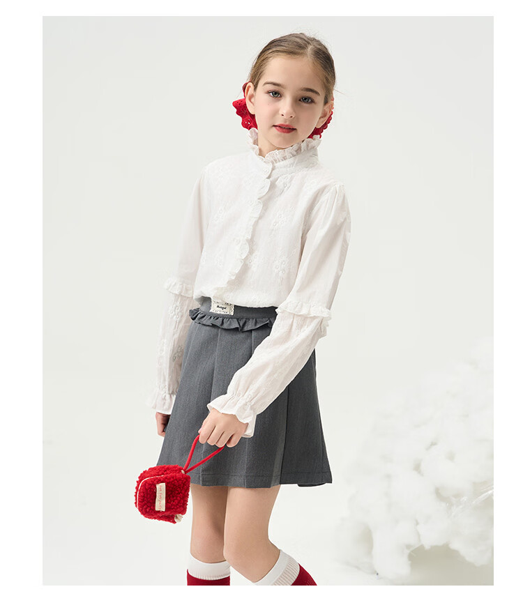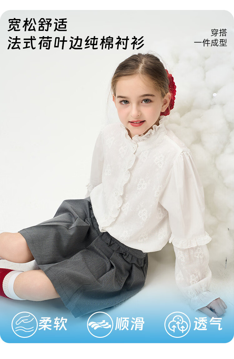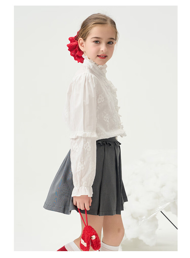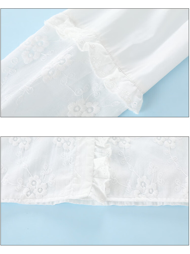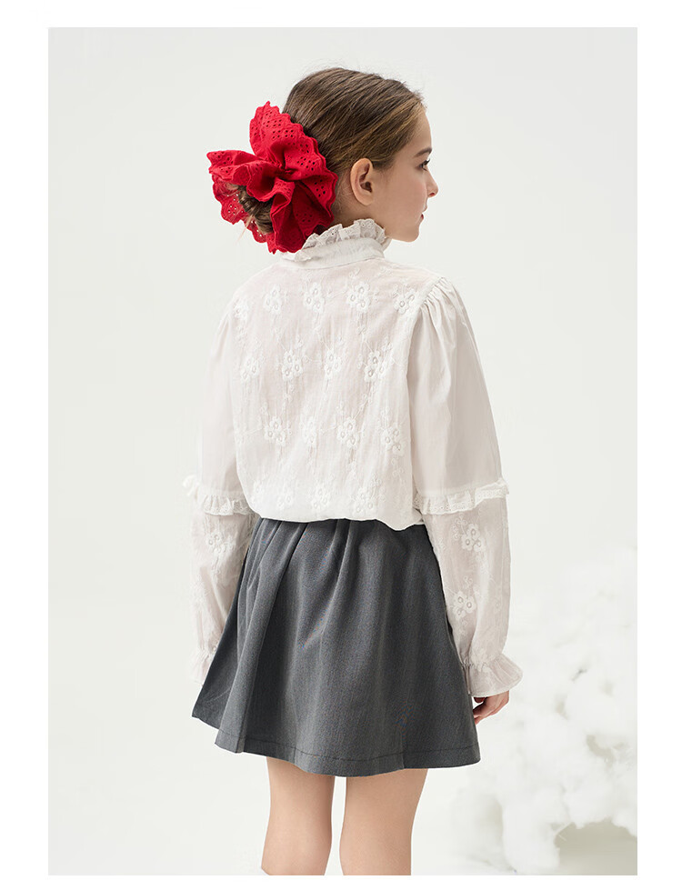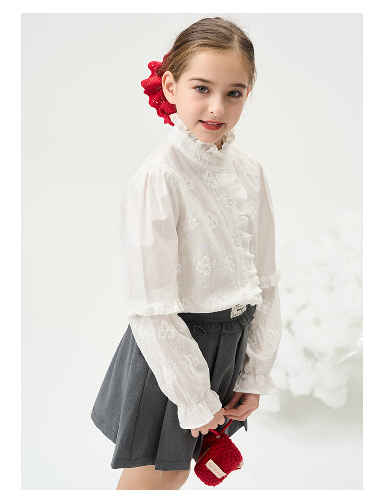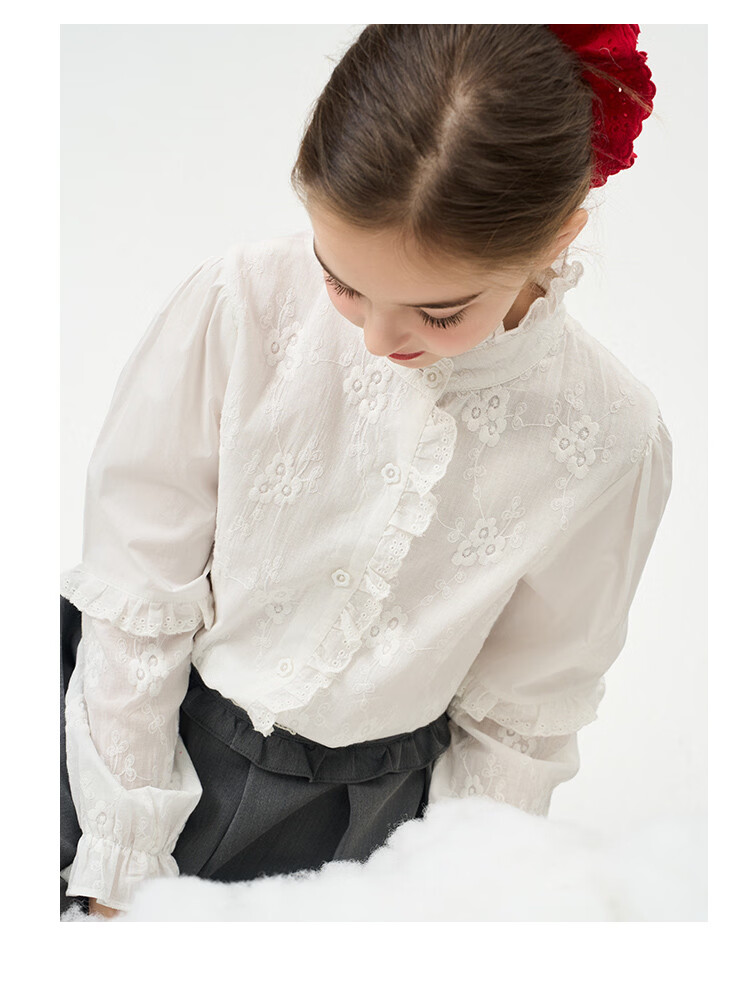 Montagut girls' spring and autumn loose long-sleeved shirt, medium and large children's skin-friendly breathable French jacquard embroidery front ruffle top