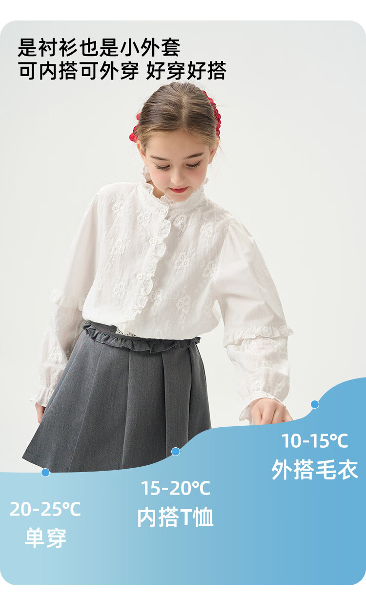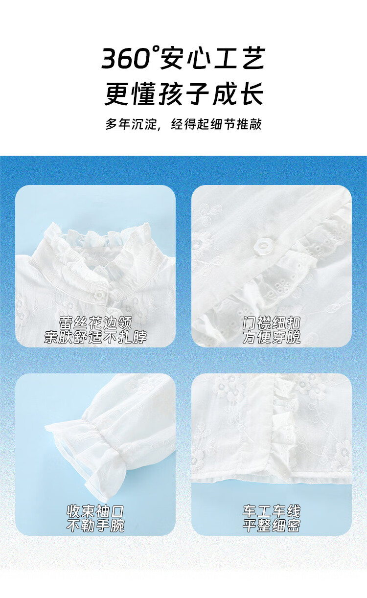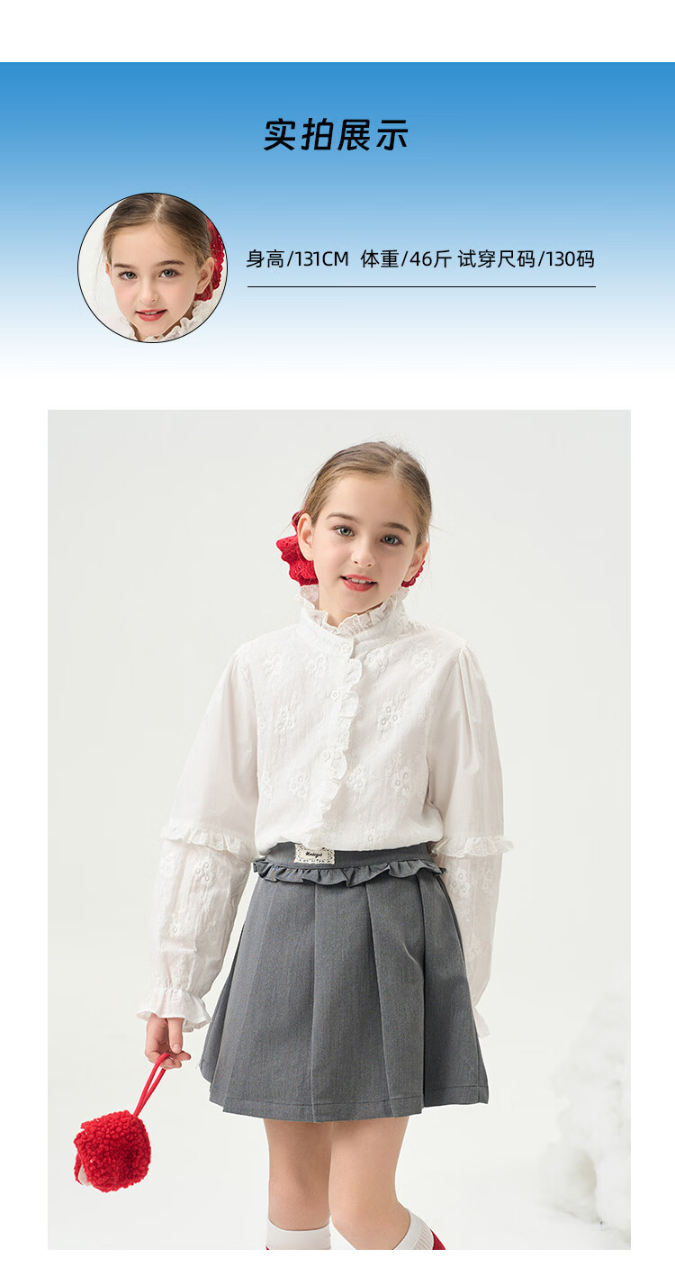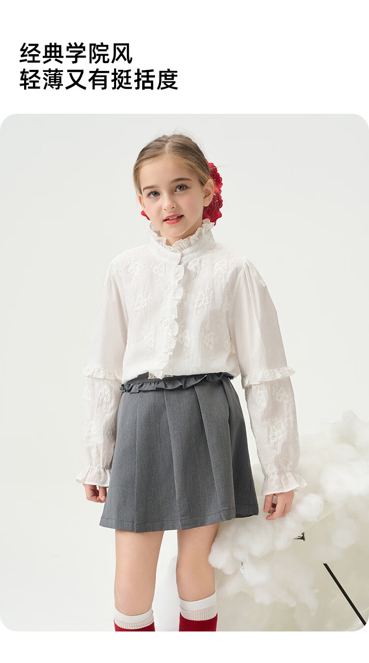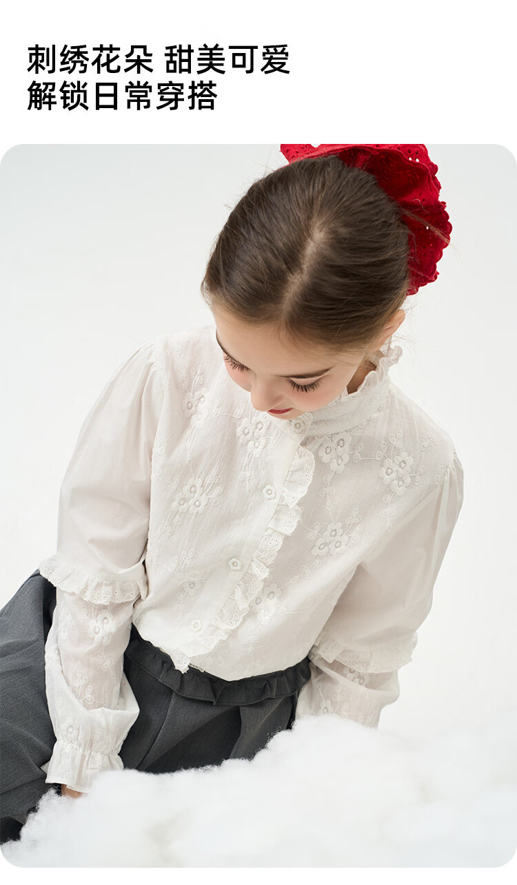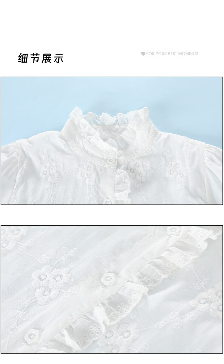 Montagut girls' spring and autumn loose long-sleeved shirt, medium and large children's skin-friendly breathable French jacquard embroidery front ruffle top