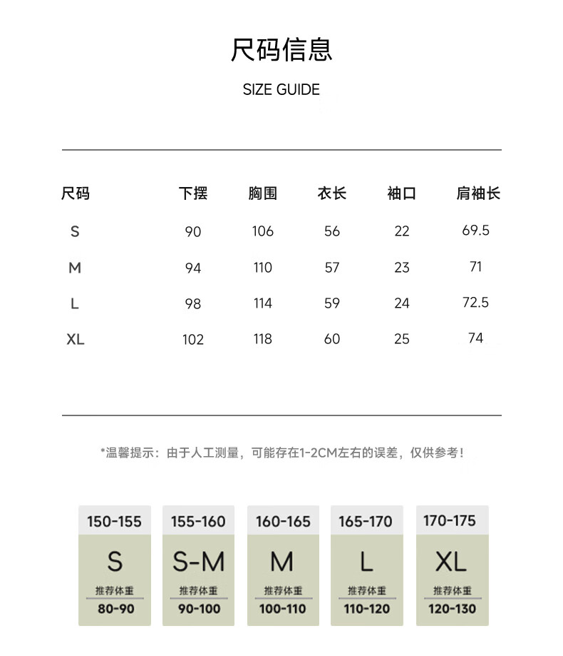 China (cm) 160-165/84-86 165-170 / 88-90 167-172 / 92-96 168-173 / 98-102 170-176 / 106-110