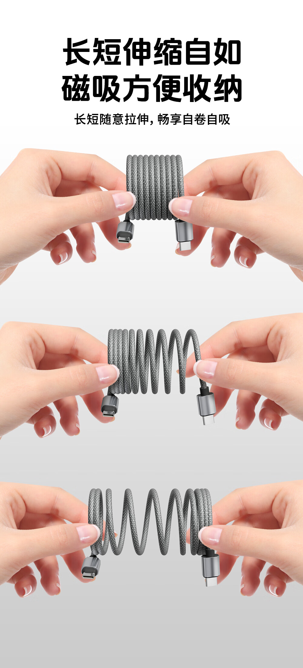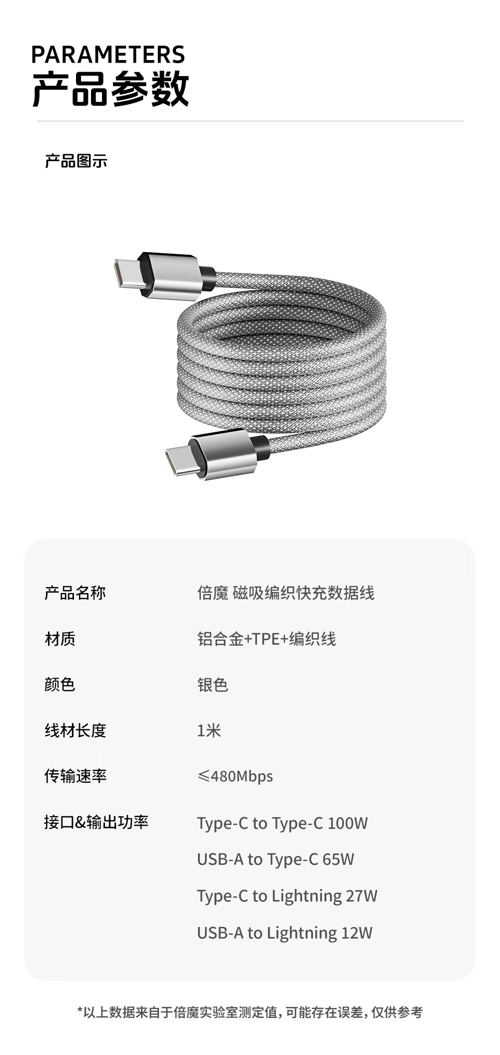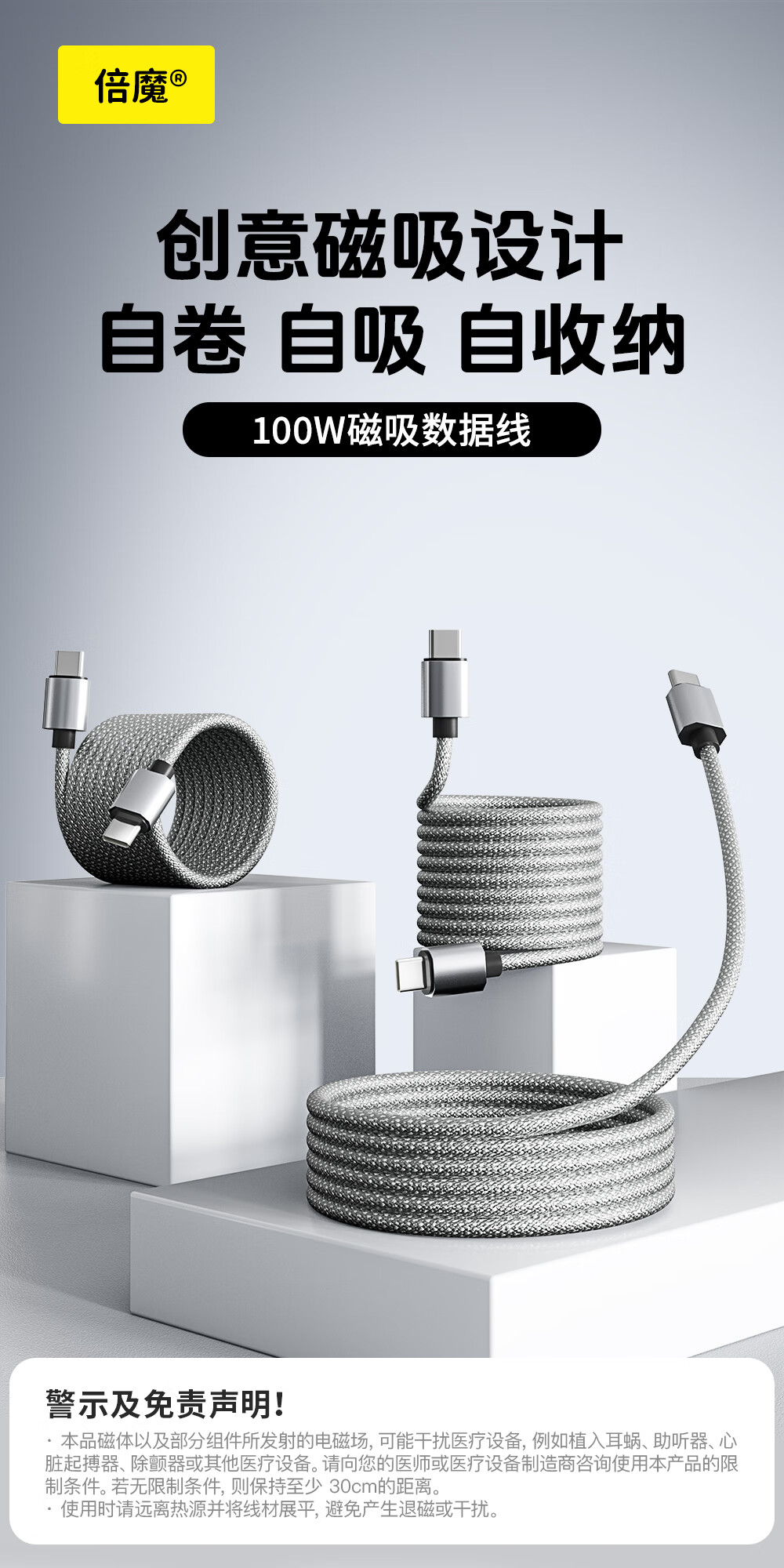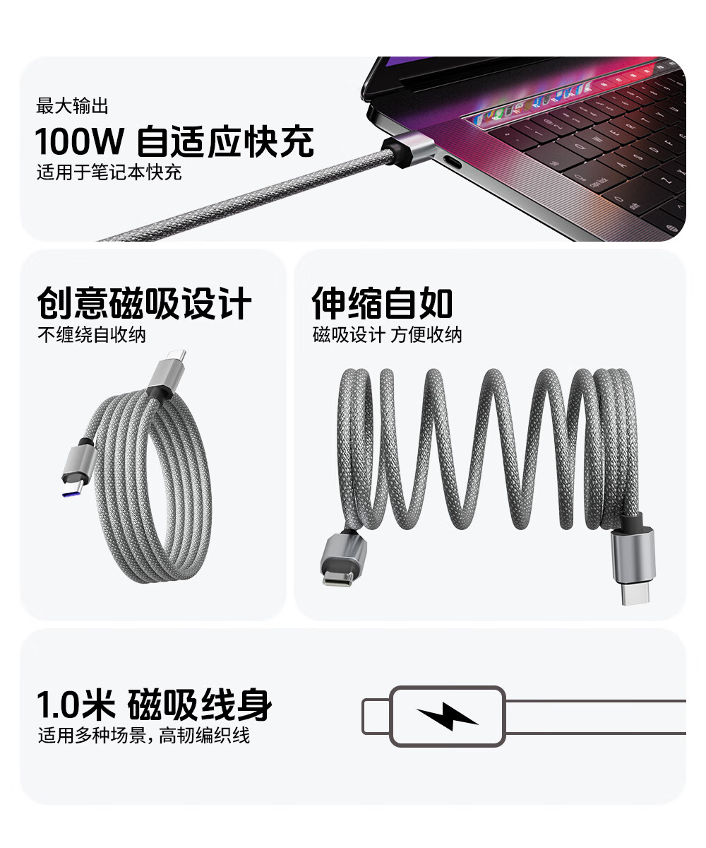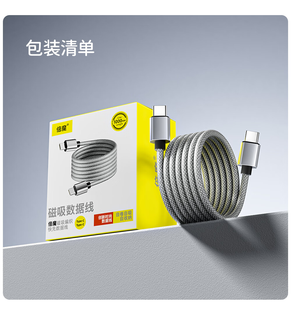 Bemo Magnetic Data Cable Double-ended Type-C Charging Cable 100W Fast Charging Cable Car Suitable for iPhone17ProMax Tablet iPad Huawei Silver