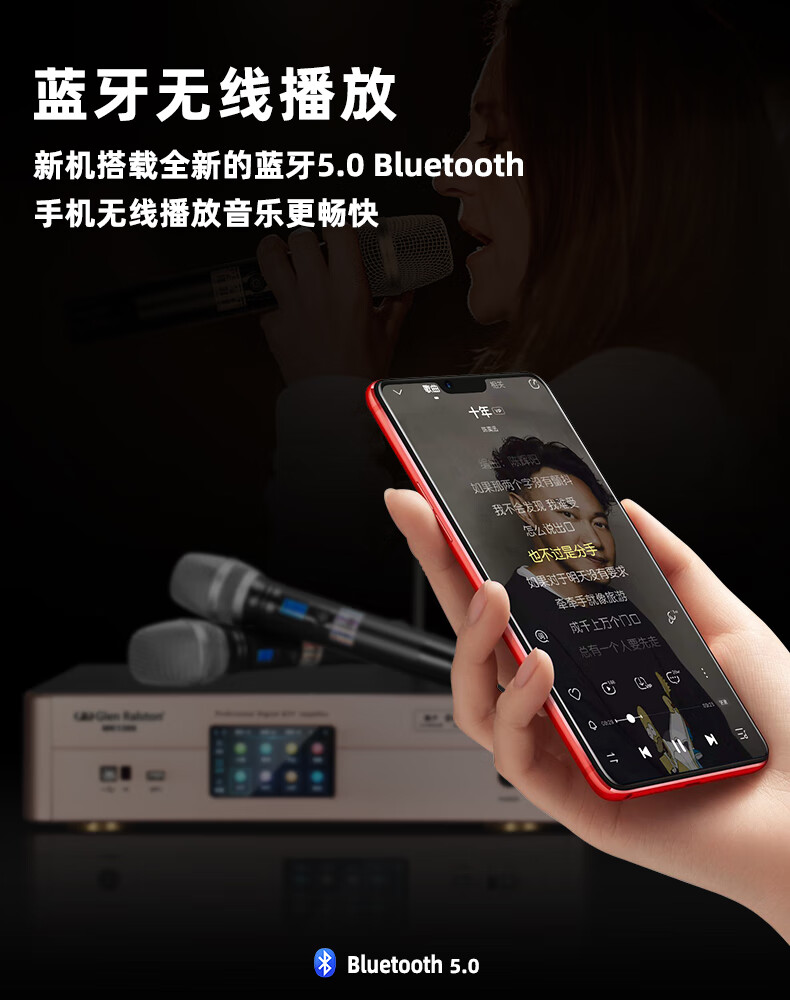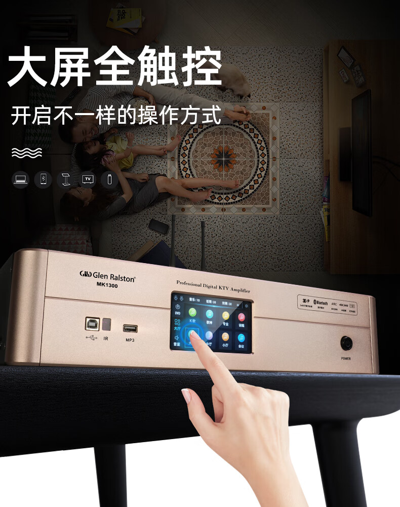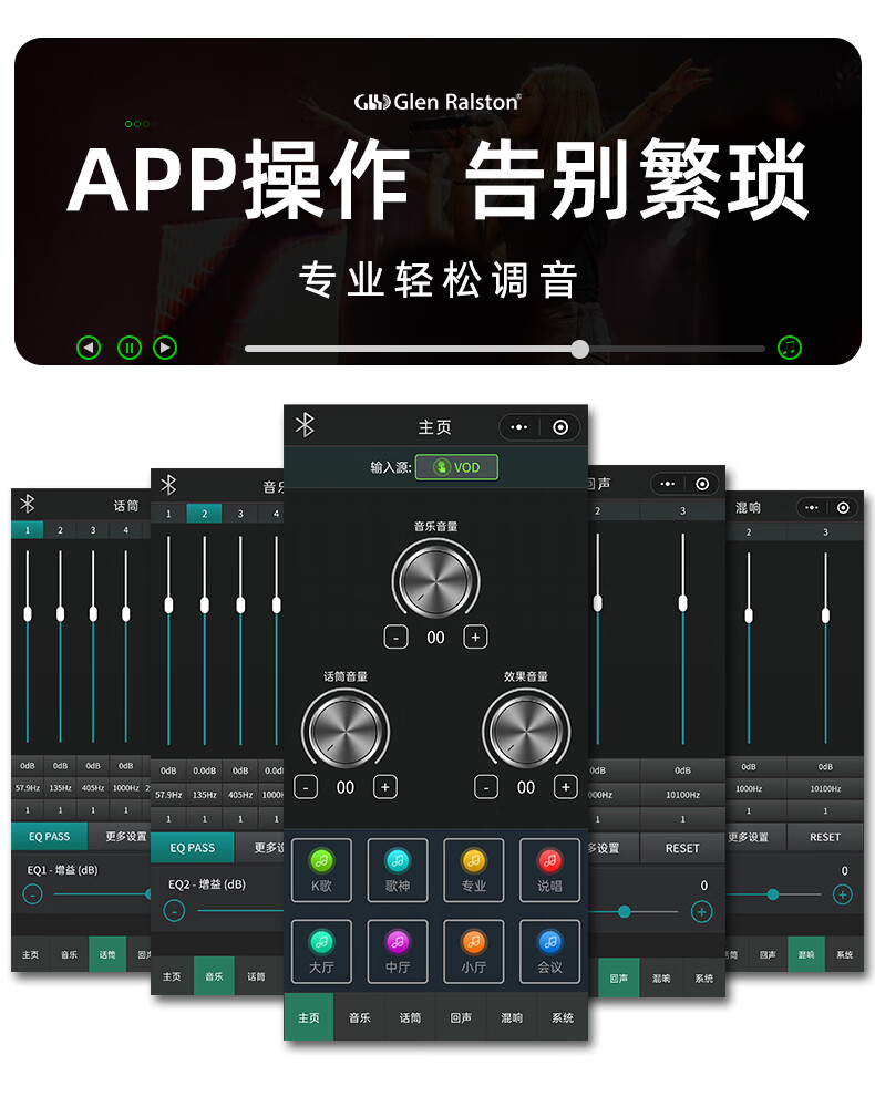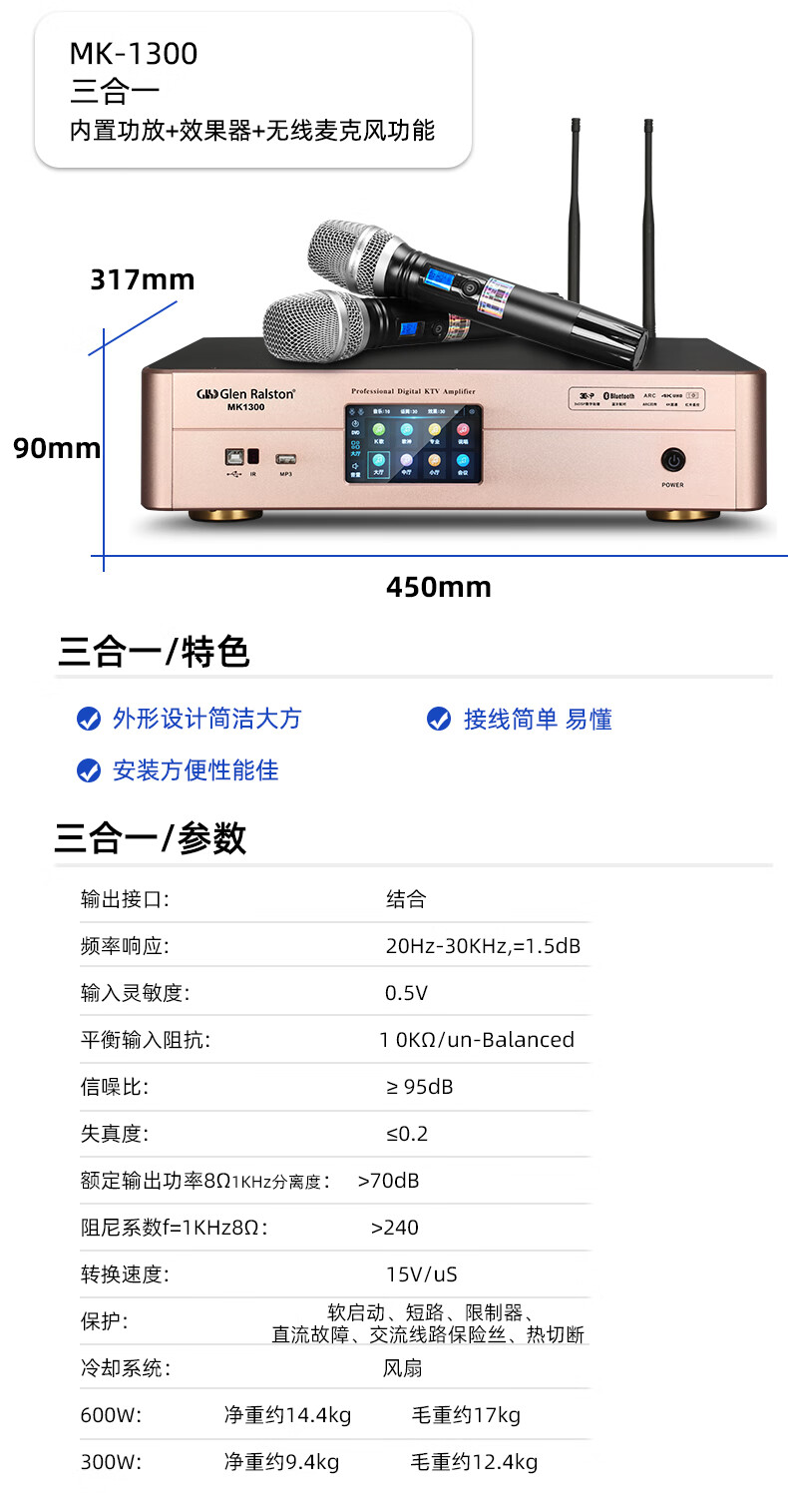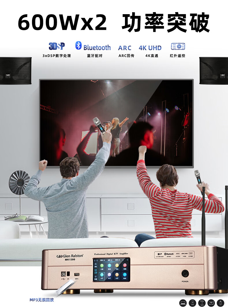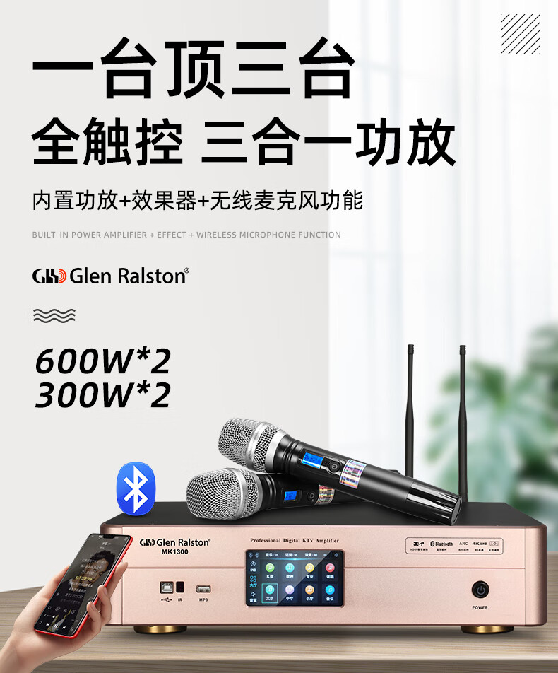 Glen Ralston ktv power amplifier pre-effector with wireless microphone and Bluetooth three-in-one home theater speaker set MK1500 (600W*2) three-in-one power amplifier