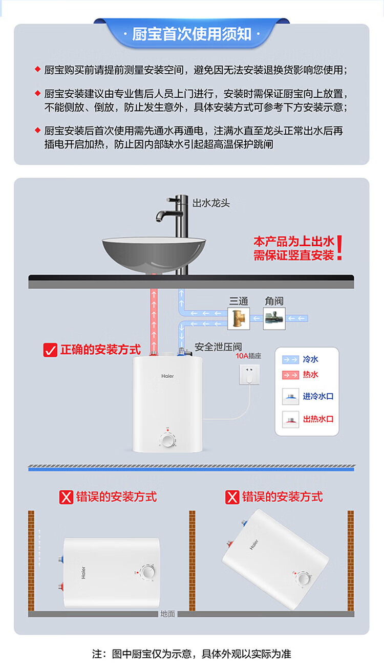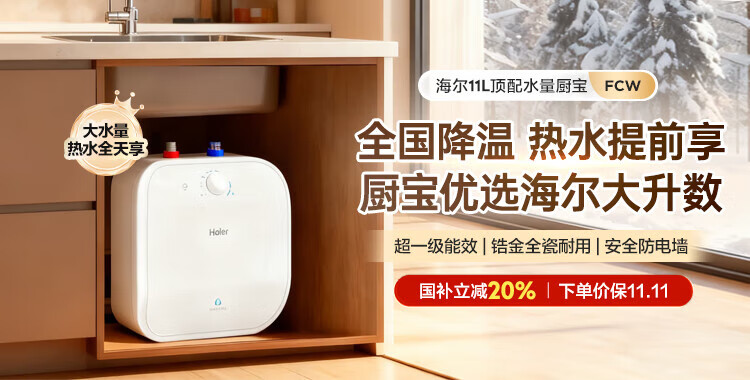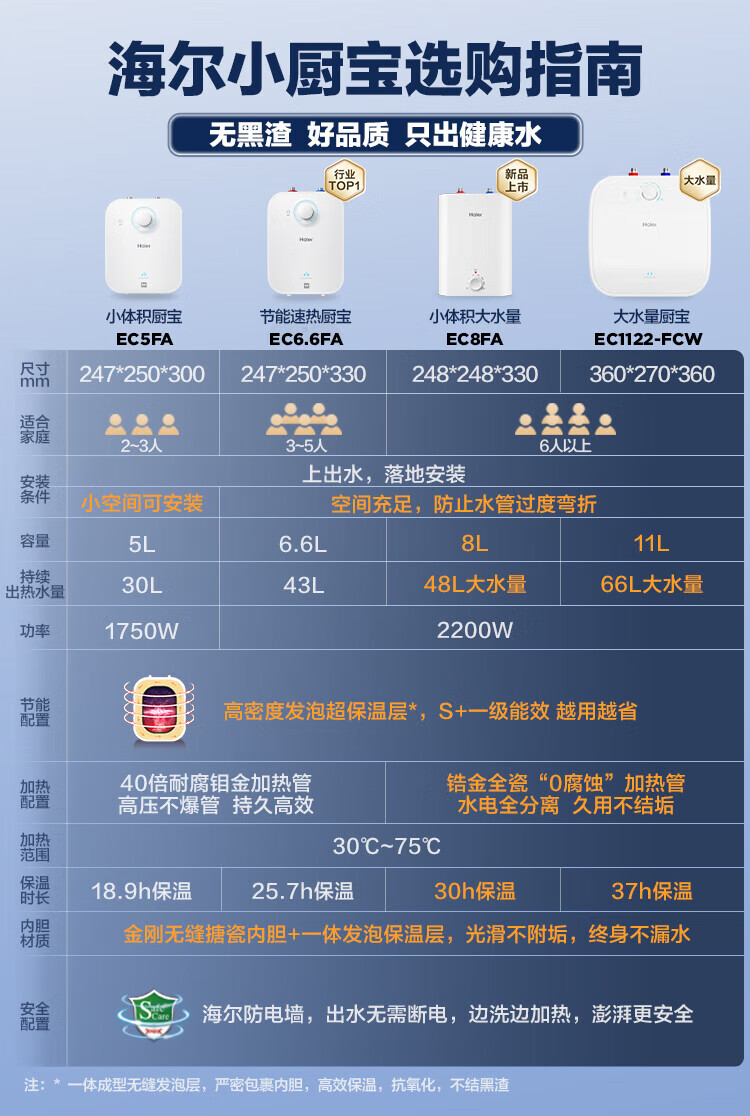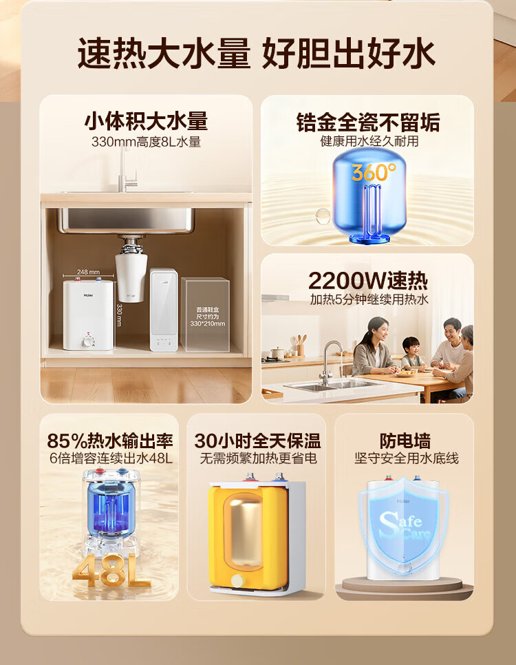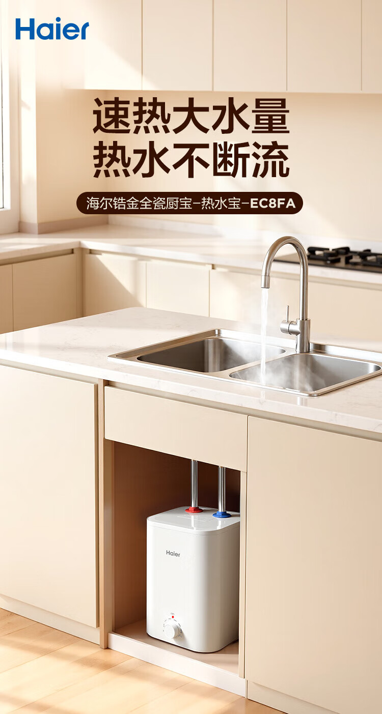 Haier (Haier) national subsidy 20% small kitchen treasure electric water heater EC8FA good water quality first class energy efficiency 2200W fast heating large water volume small water storage type energy-saving hot water heater for home kitchen