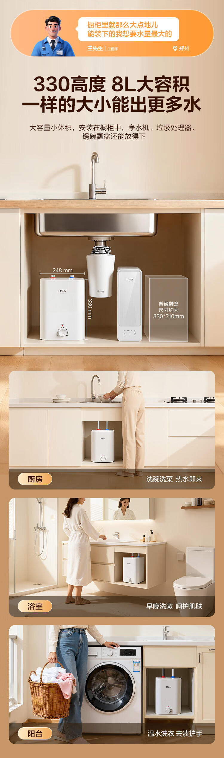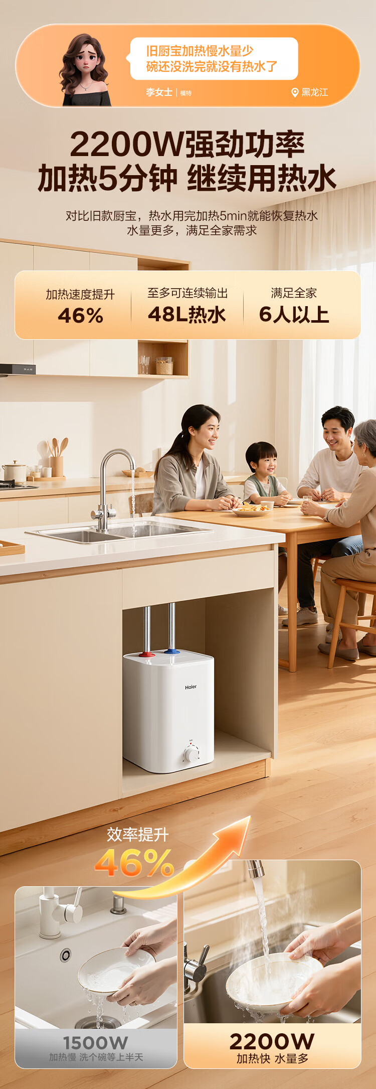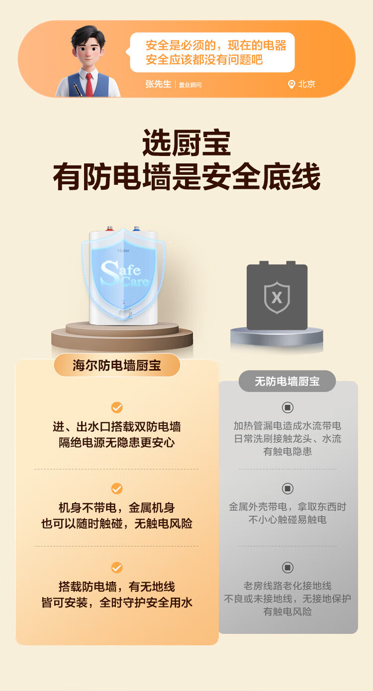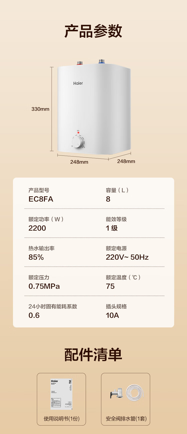 Haier (Haier) national subsidy 20% small kitchen treasure electric water heater EC8FA good water quality first class energy efficiency 2200W fast heating large water volume small water storage type energy-saving hot water heater for home kitchen