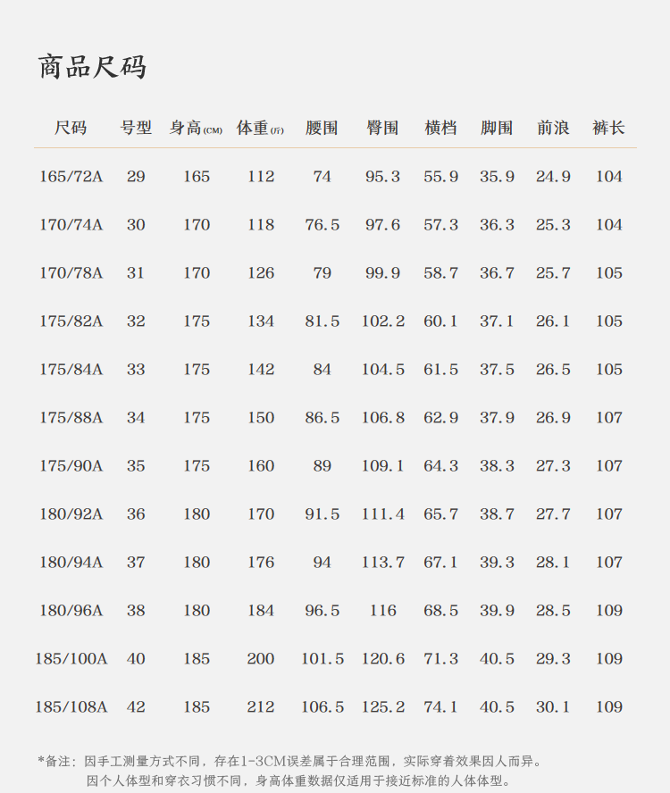 China (cm) 160-165/84-86 165-170 / 88-90 167-172 / 92-96 168-173 / 98-102 170-176 / 106-110