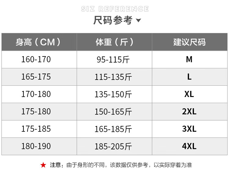 China (cm) 165 / 88-90 170 / 96-98 175 / 108-110 180 / 118-122 185 / 126-130