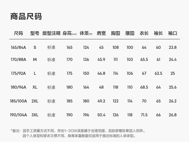 China (cm) 165 / 88-90 170 / 96-98 175 / 108-110 180 / 118-122 185 / 126-130