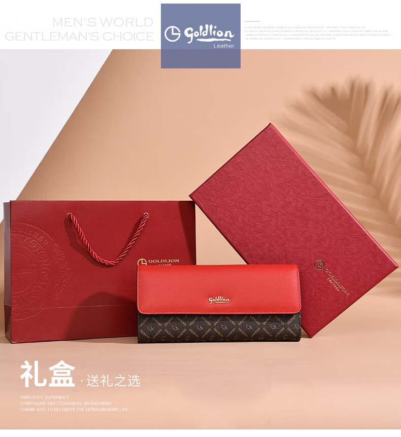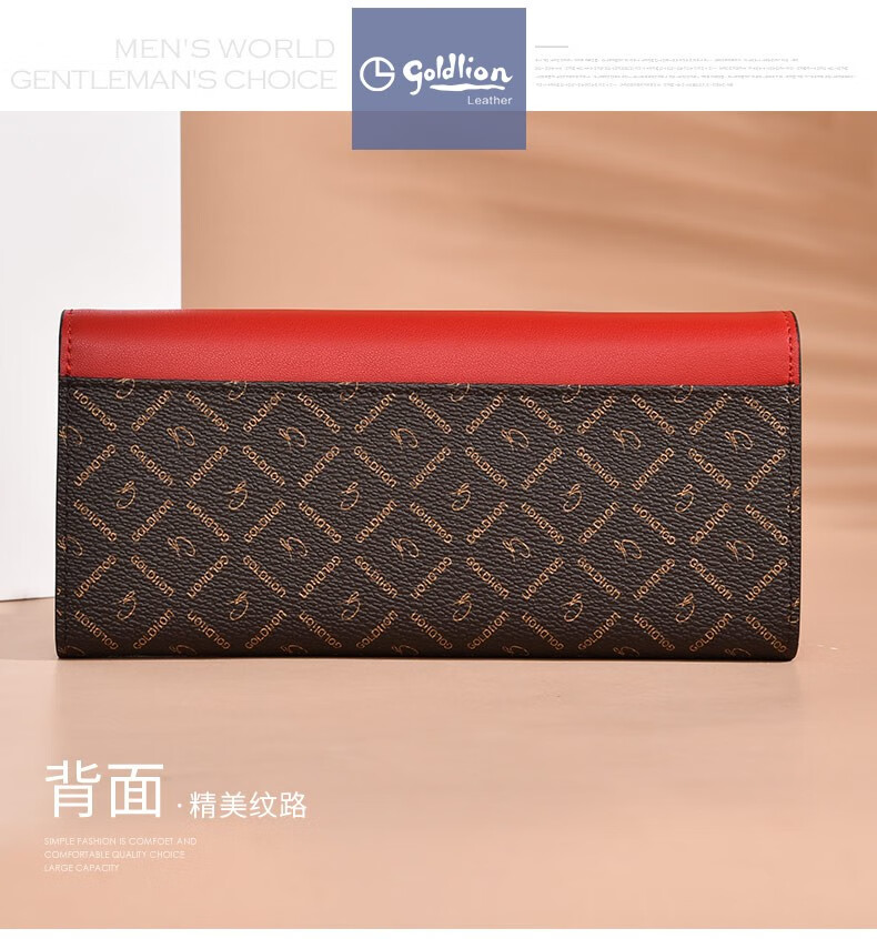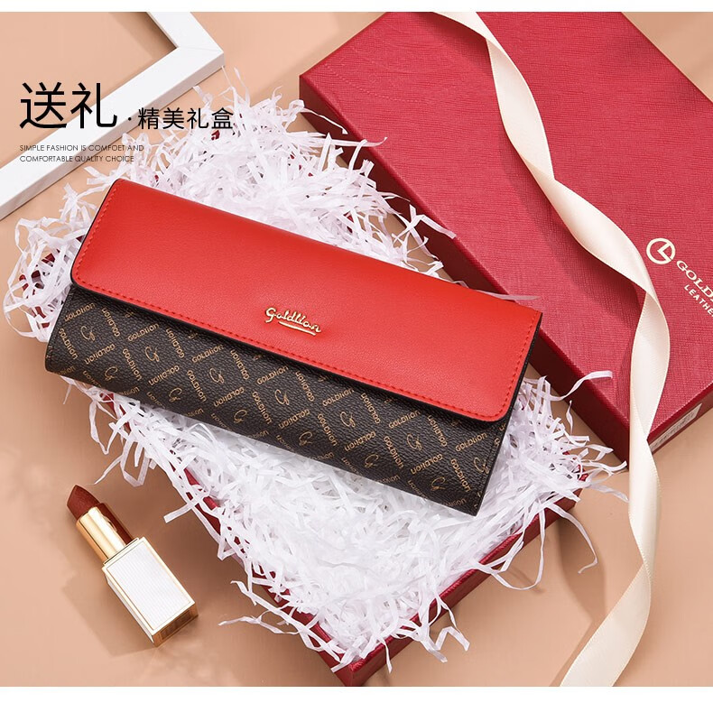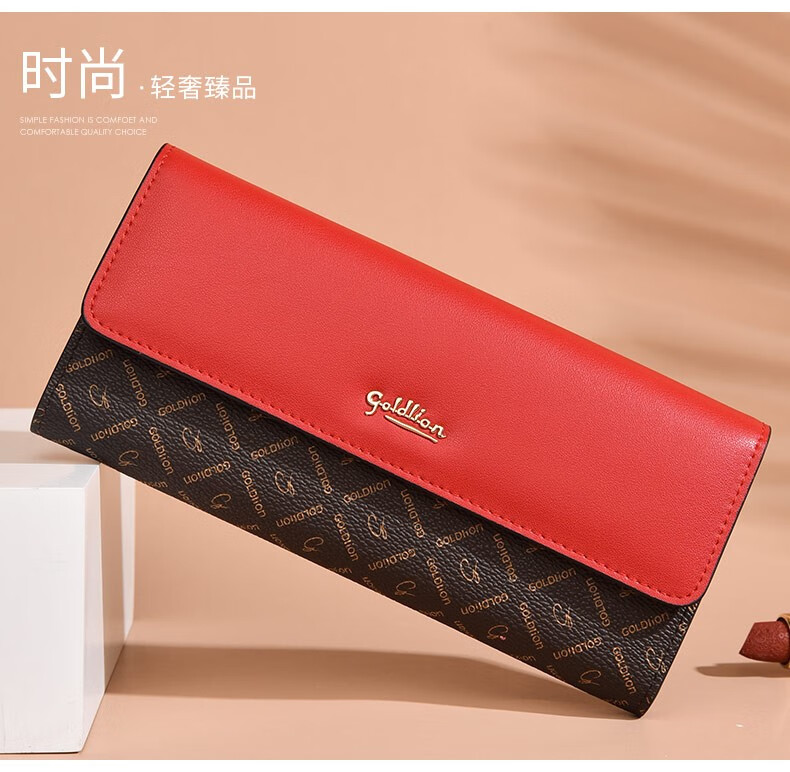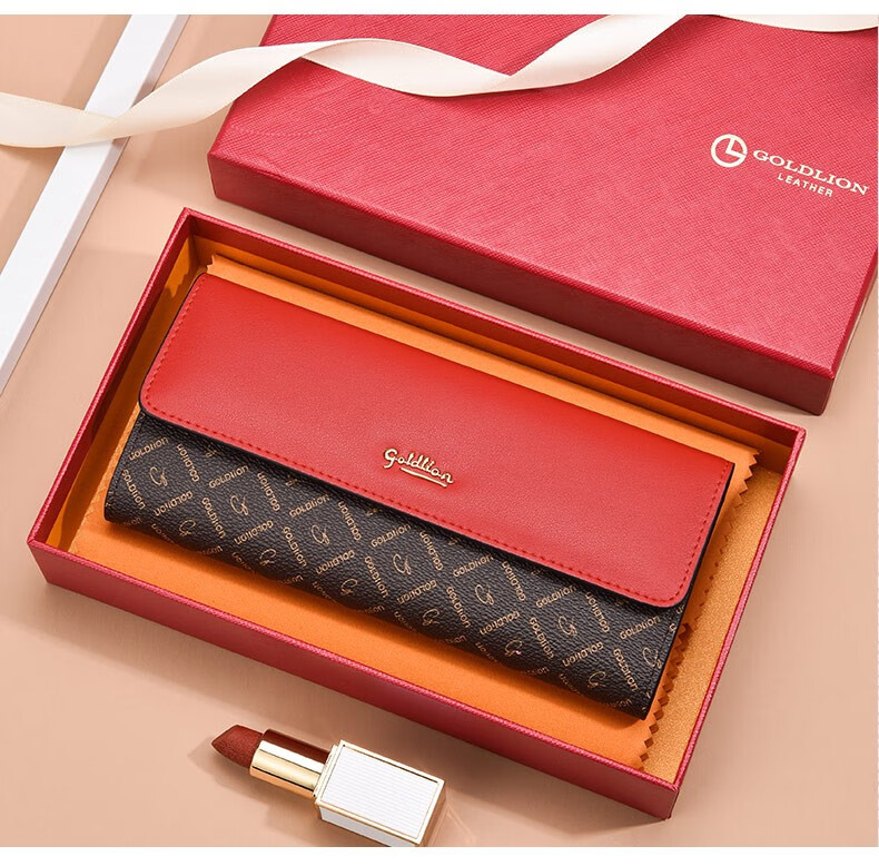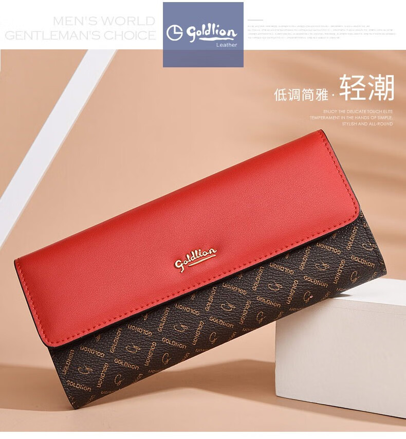 Goldlion Long Wallet Women's New Fashion Genuine Leather Handbag Three-fold Clutch Bag Clutch Bag Women's Luxury High-end Brand Get a fake one and get ten for free Official straight hair red